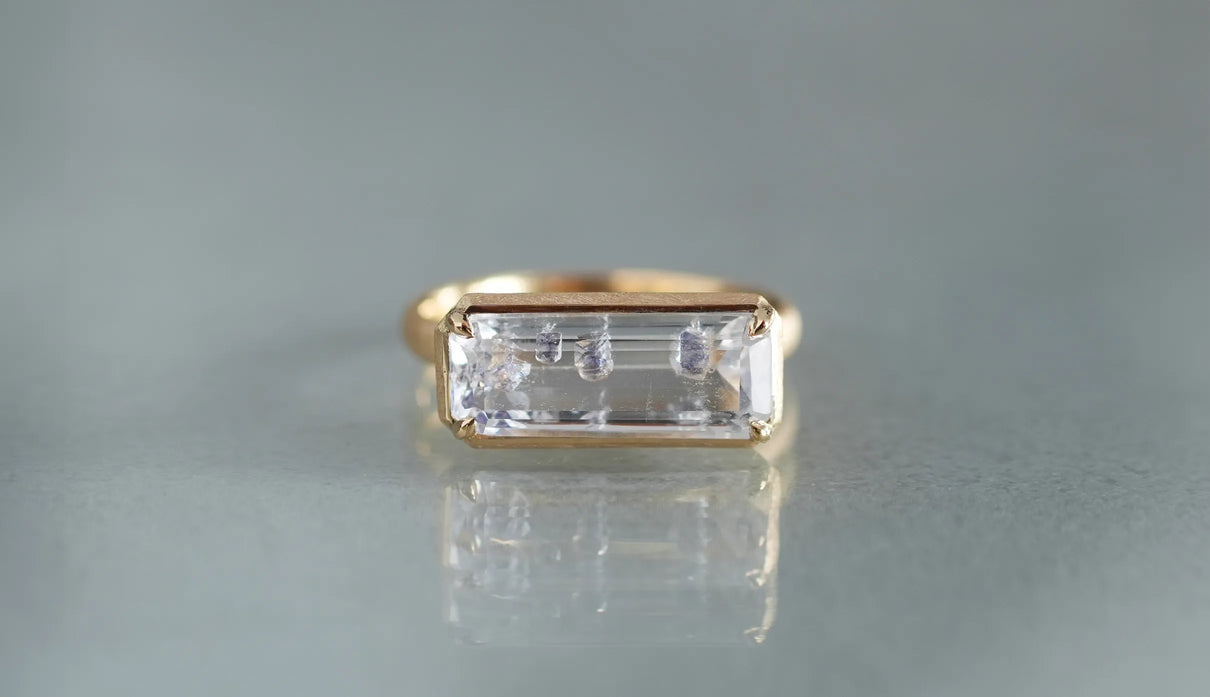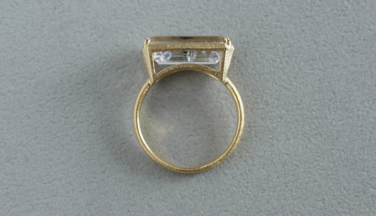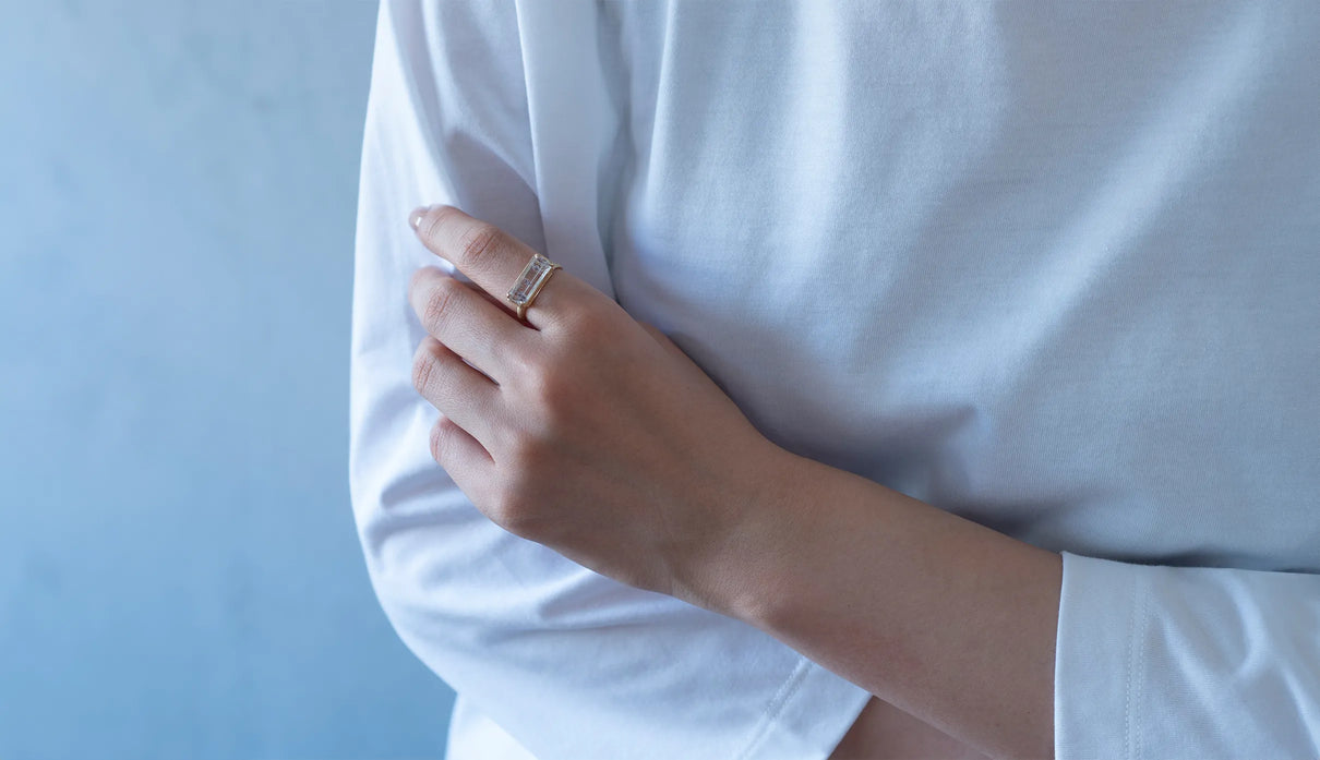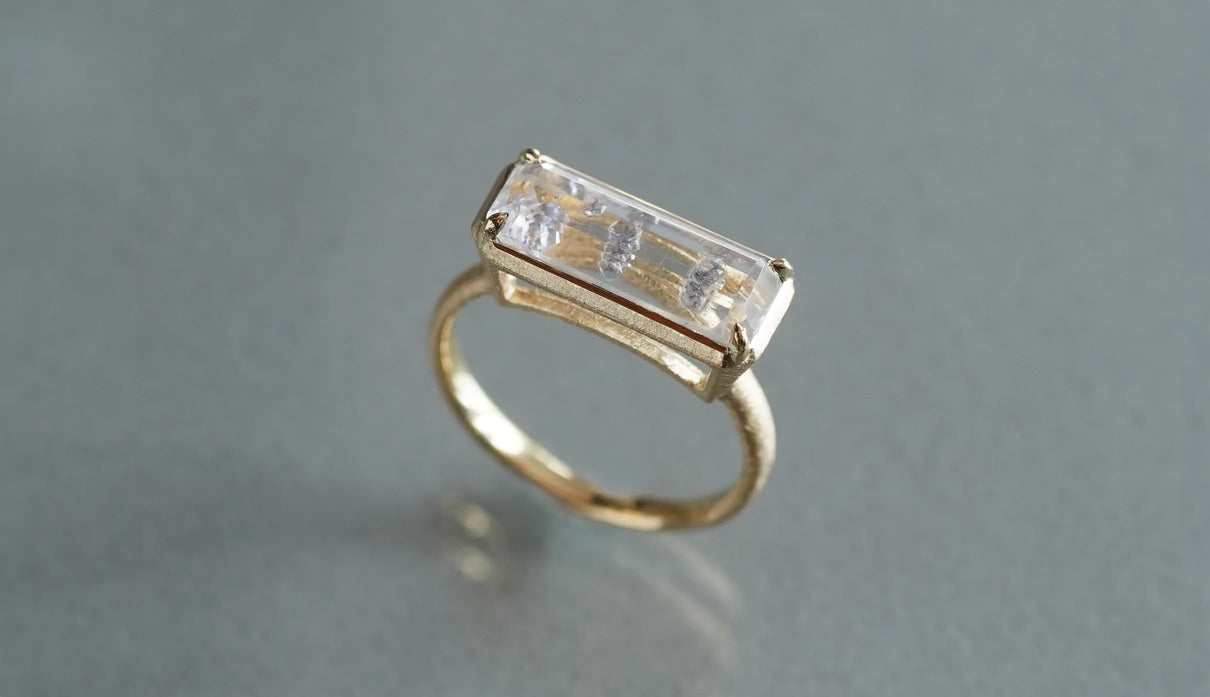 フローライトを内包した、希少な “フローライトインクォーツ” で仕立てた一点もののリング。フローライトは紫外線や熱に反応して柔らかな光を放つことから、「蛍石(ほたるいし)」とも呼ばれてきました。硬度が低いため標本として親しまれることが多い鉱石ですが、その結晶が水晶の中に閉じ込められたインクォーツは一転して希少性を増し、産地は世界でもわずか二か所、現在では採掘も困難とされています。今回のリングに用いたのは、高い透明度を誇る横長のバゲットカットの水晶。その中で、りんどう色のフローライトが重力から解き放たれたようにふんわりと漂います。石座はマットに仕立て、前後左右から光をたっぷりと取り込み、瑞々しい輝きを引き出しました。日常の装いにほどよい華やかさと上品さを添えてくれる、特別なリングです。