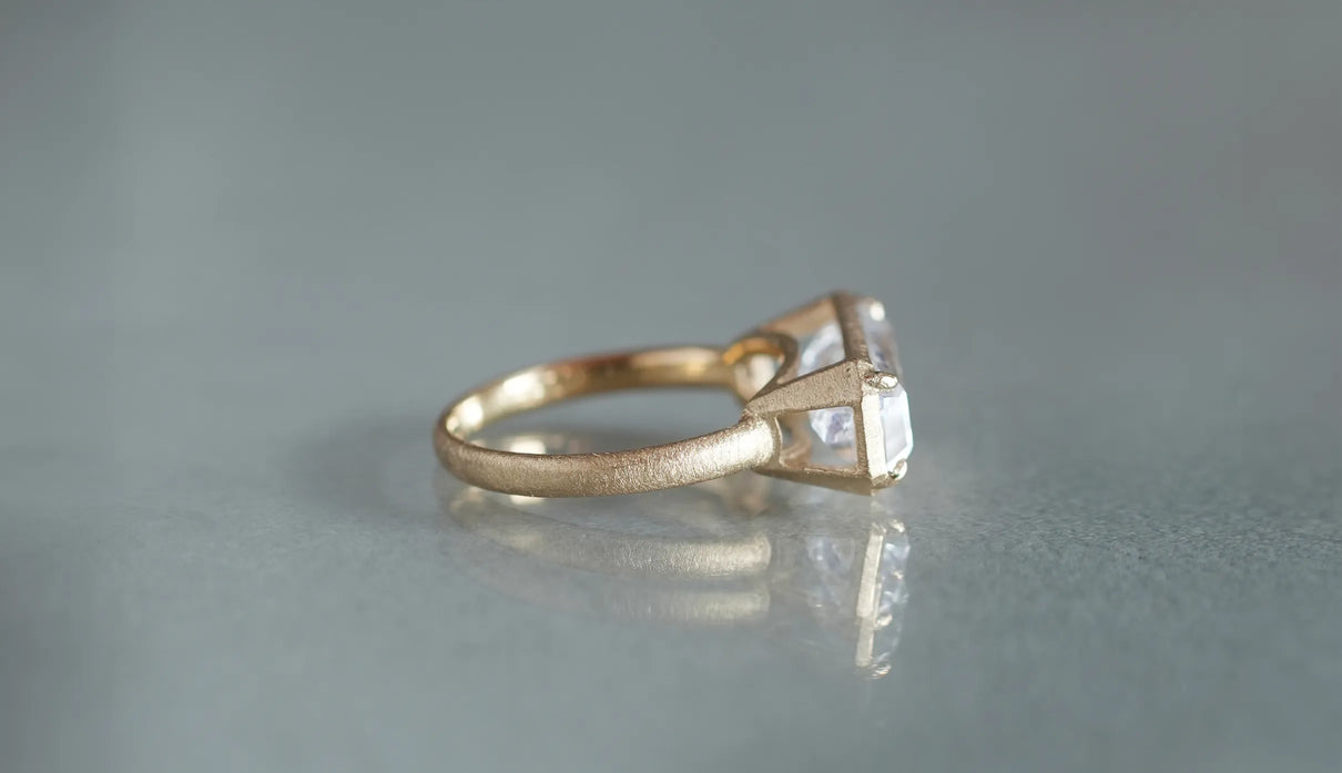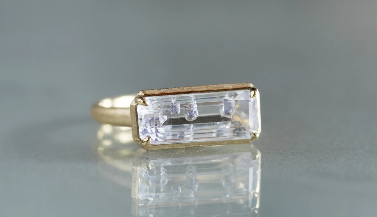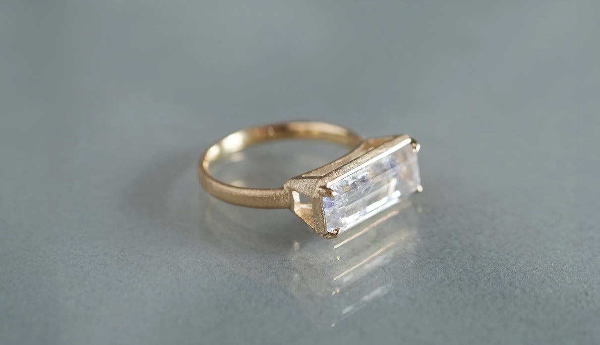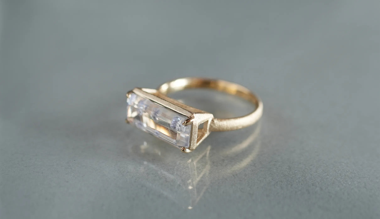 フローライトを内包した、希少な “フローライトインクォーツ” で仕立てた一点もののリング。フローライトは紫外線や熱に反応して柔らかな光を放つことから、「蛍石(ほたるいし)」とも呼ばれてきました。硬度が低いため標本として親しまれることが多い鉱石ですが、その結晶が水晶の中に閉じ込められたインクォーツは一転して希少性を増し、産地は世界でもわずか二か所、現在では採掘も困難とされています。今回のリングに用いたのは、高い透明度を誇る横長のバゲットカットの水晶。その中で、りんどう色のフローライトが重力から解き放たれたようにふんわりと漂います。石座はマットに仕立て、前後左右から光をたっぷりと取り込み、瑞々しい輝きを引き出しました。日常の装いにほどよい華やかさと上品さを添えてくれる、特別なリングです。