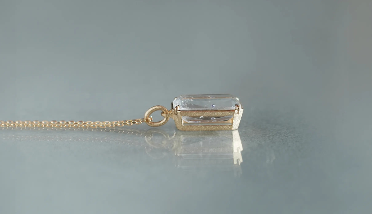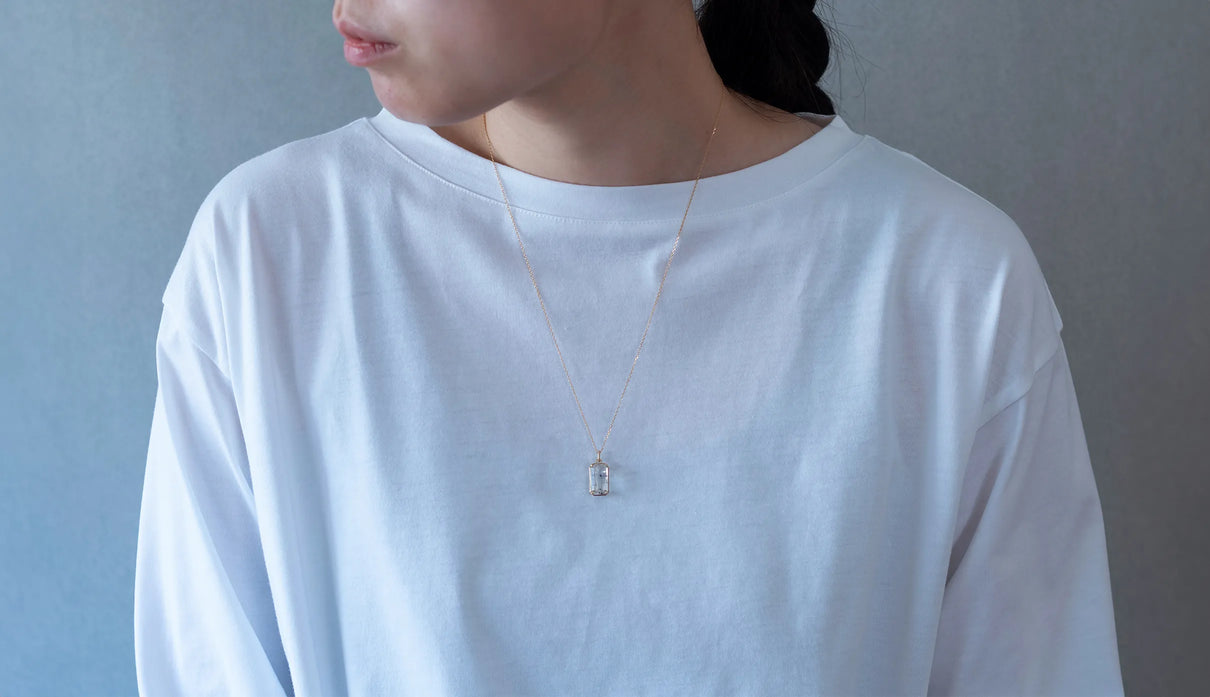 フローライトを内包した、希少な “フローライトインクォーツ” で仕立てた一点もののネックレス。フローライトは紫外線や熱に反応して柔らかな光を放つことから、「蛍石(ほたるいし)」とも呼ばれてきました。硬度が低いため標本として親しまれることが多い鉱石ですが、その結晶が水晶の中に閉じ込められたインクォーツは一転して希少性を増し、産地は世界でもわずか二か所、現在では採掘も困難とされています。今回のリングに用いたのは、高い透明度を誇るバゲットカットの水晶。その中で、りんどう色のフローライトが重力から解き放たれたようにふんわりと漂います。石座はマットに仕立て、前後左右から光をたっぷりと取り込み、瑞々しい輝きを引き出しました。卵型の丸カンがさりげなくたおやかな表情を引き立て、日常の装いにほどよい華と品を添えるネックレスです。