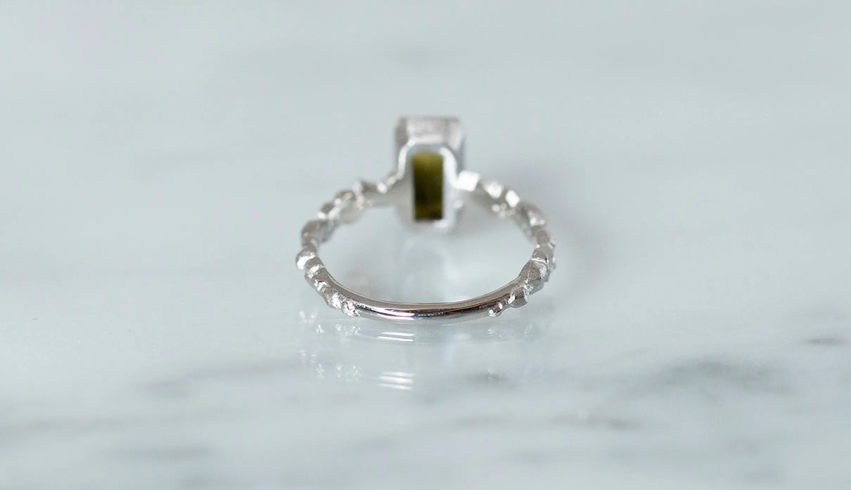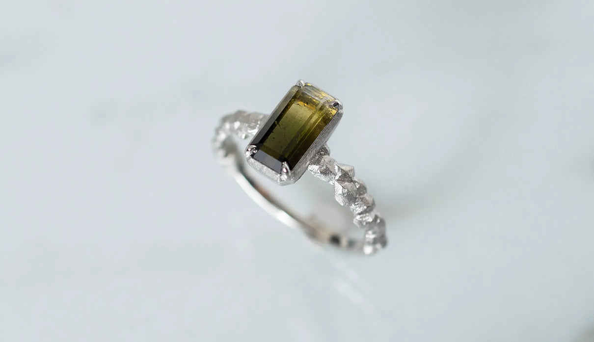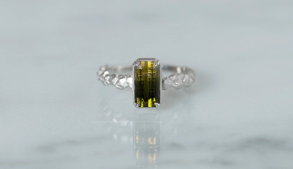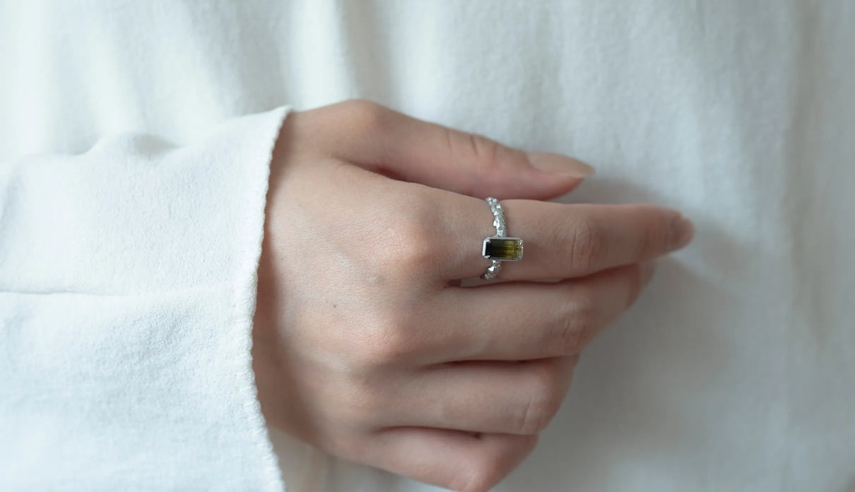 森の奥にひそむ、小さきもの達の静かなる営みをモチーフにした " Whisper "シリーズ。森の奥深くのような落ち着きのある緑の、美しいグラデーションを描くバイカラートルマリンを留めた一点もののリングです。ゆっくりとした濃淡の移ろいを感じさせる、落ち着きのある色彩を呈する存在感のあるトルマリン。10月生まれの誕生石でもあるトルマリン。装いの主役として日常的に身に着けていただくのはもちろん、特別な贈りものにも最適なアイテムです。