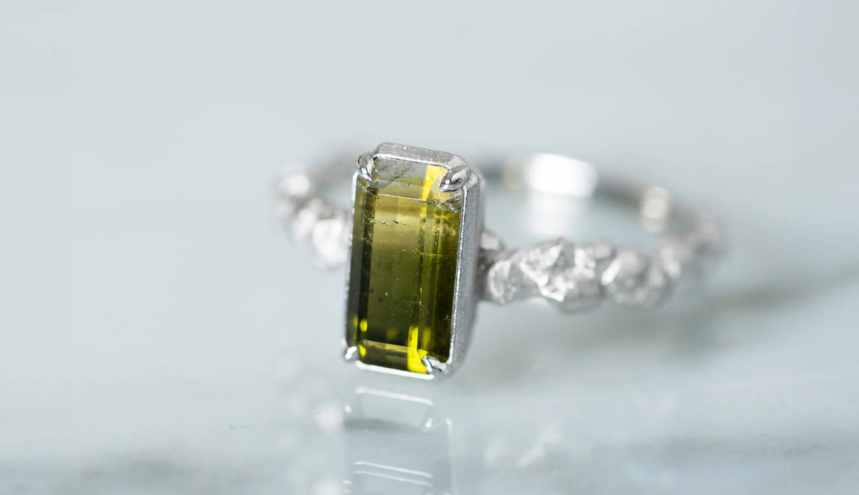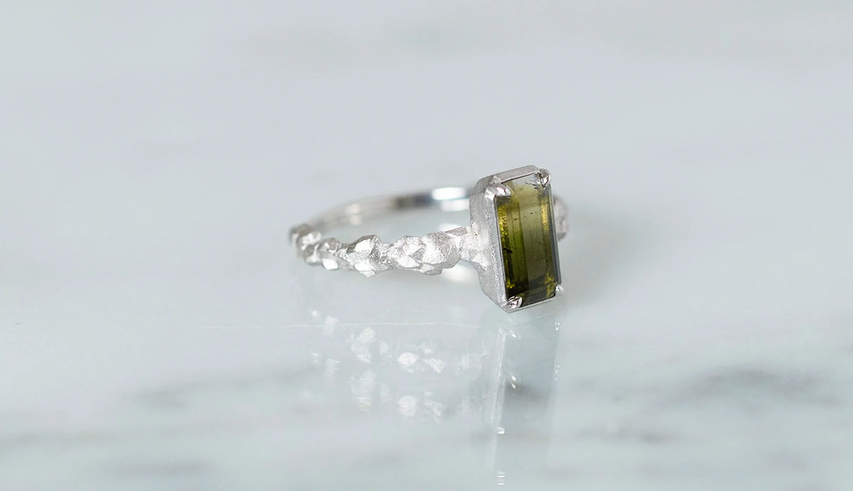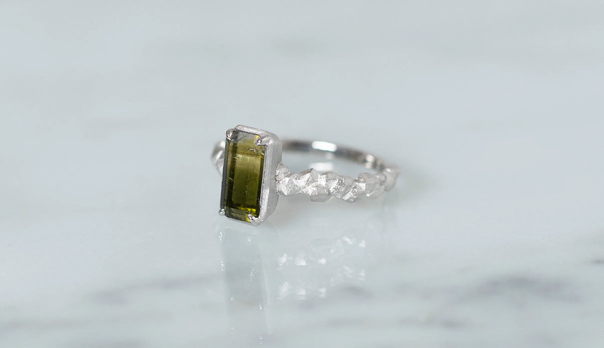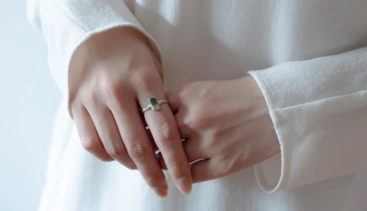 森の奥にひそむ、小さきもの達の静かなる営みをモチーフにした " Whisper "シリーズ。森の奥深くのような落ち着きのある緑の、美しいグラデーションを描くバイカラートルマリンを留めた一点もののリングです。ゆっくりとした濃淡の移ろいを感じさせる、落ち着きのある色彩を呈する存在感のあるトルマリン。10月生まれの誕生石でもあるトルマリン。装いの主役として日常的に身に着けていただくのはもちろん、特別な贈りものにも最適なアイテムです。