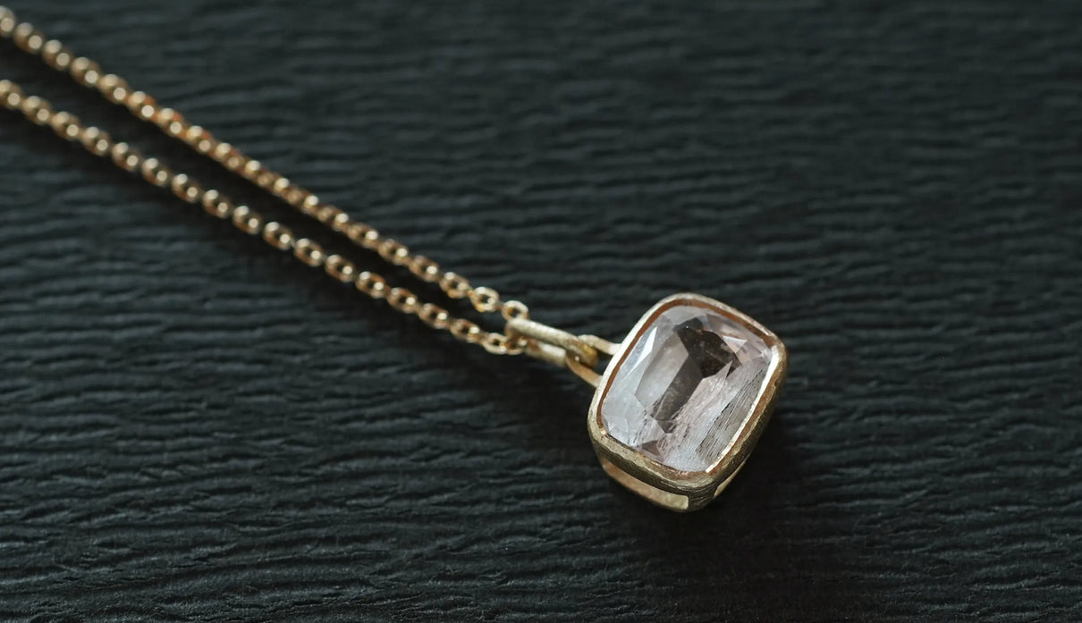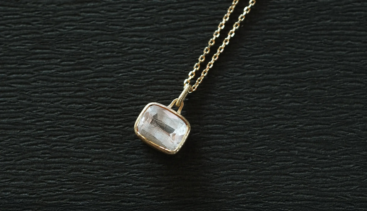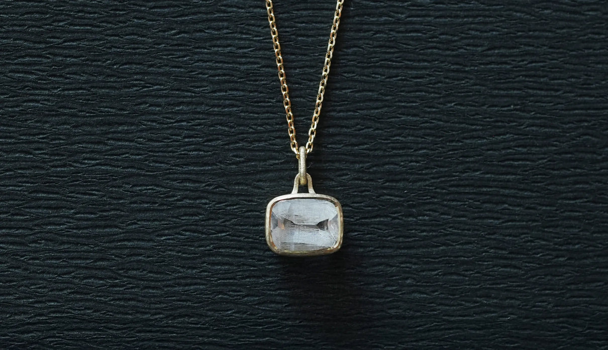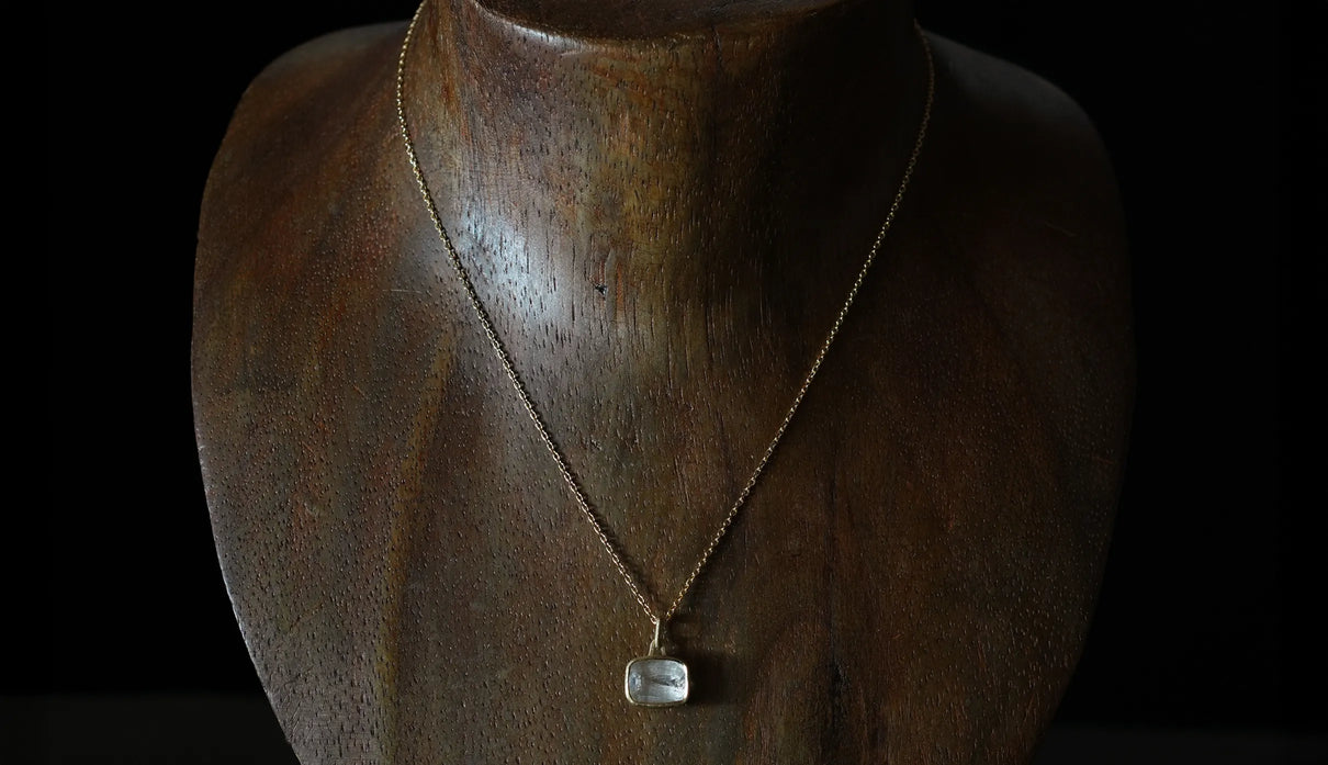 チューブイントパーズで仕立てた一点もののネックレス。トパーズが形成される過程で、偶然に細長いトンネル状の結晶が閉じ込められた、極めて稀少なチューブイントパーズは、高密度の結晶がシルクのように輝き、まるで光が描いたバイカラーのように静かに上下に浮かび上がります。息が白く煙る、朝の澄み切った空気の中で、大地から立ち上がる霜柱を思わせる結晶。清らかな透明の中に淡く白を宿した、美しいピースを選りすぐりました。見る角度によって内に映る表情を変え、光を反射するたびに、ただ澄んだ結晶のようにも、あるいは白が全方位に広がり雪の結晶のようにも姿を変え、見る人を惹きつけます。やや丸みを帯びた横長のクッションカットを穏やかに支える、マット仕立てのK18イエローゴールドが石の透明感を際立たせ、静かな存在感を宿すネックレスとなりました。11月の誕生石としても親しまれるトパーズは、11月生まれの方の特別なお守りとしてもおすすめです。