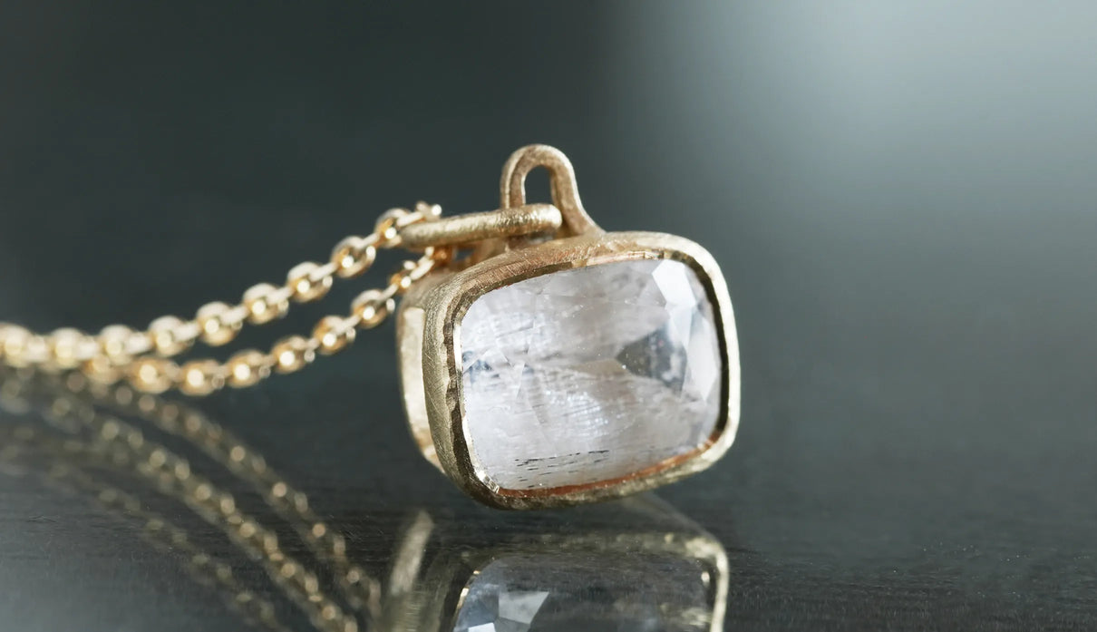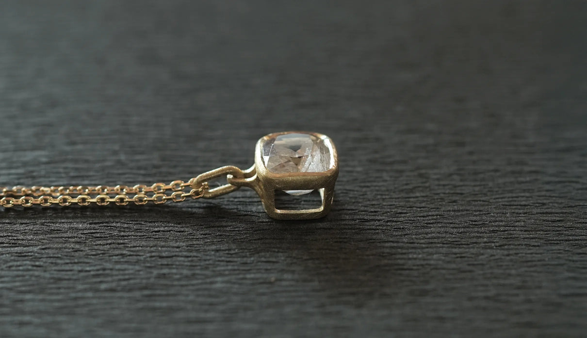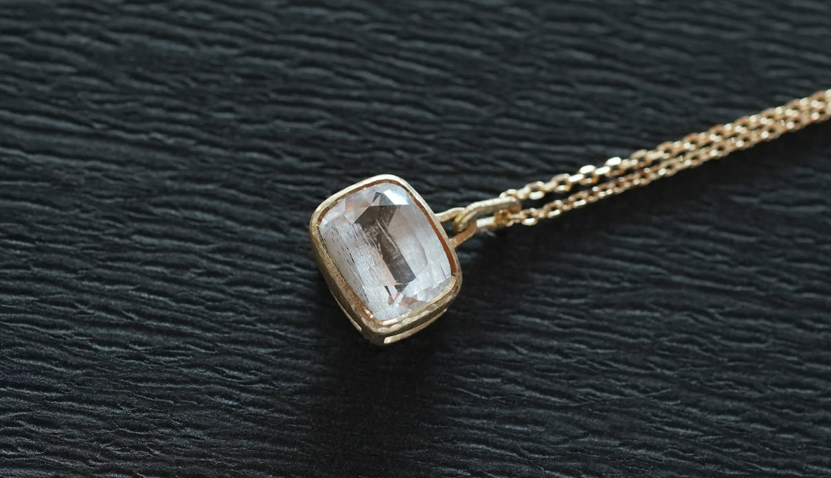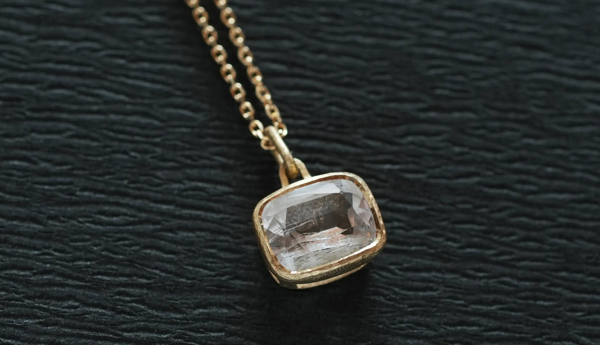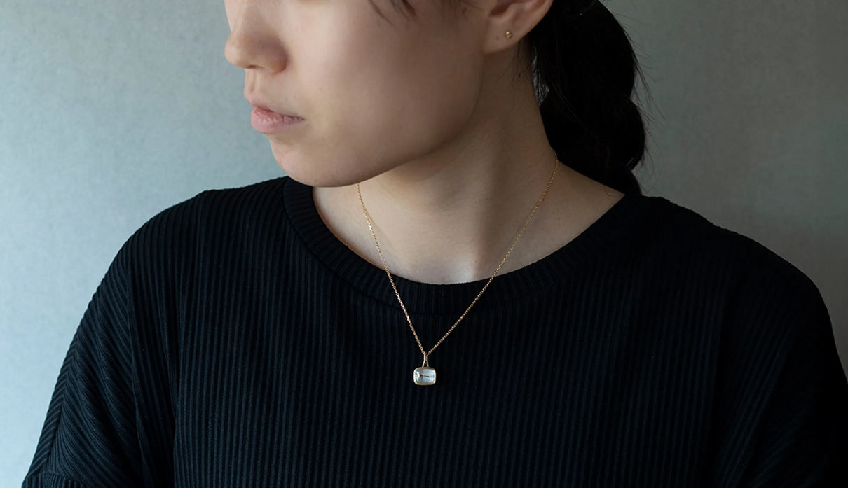 チューブイントパーズで仕立てた一点もののネックレス。トパーズが形成される過程で、偶然に細長いトンネル状の結晶が閉じ込められた、極めて稀少なチューブイントパーズは、高密度の結晶がシルクのように輝き、まるで光が描いたバイカラーのように静かに上下に浮かび上がります。息が白く煙る、朝の澄み切った空気の中で、大地から立ち上がる霜柱を思わせる結晶。清らかな透明の中に淡く白を宿した、美しいピースを選りすぐりました。見る角度によって内に映る表情を変え、光を反射するたびに、ただ澄んだ結晶のようにも、あるいは白が全方位に広がり雪の結晶のようにも姿を変え、見る人を惹きつけます。やや丸みを帯びた横長のクッションカットを穏やかに支える、マット仕立てのK18イエローゴールドが石の透明感を際立たせ、静かな存在感を宿すネックレスとなりました。11月の誕生石としても親しまれるトパーズは、11月生まれの方の特別なお守りとしてもおすすめです。