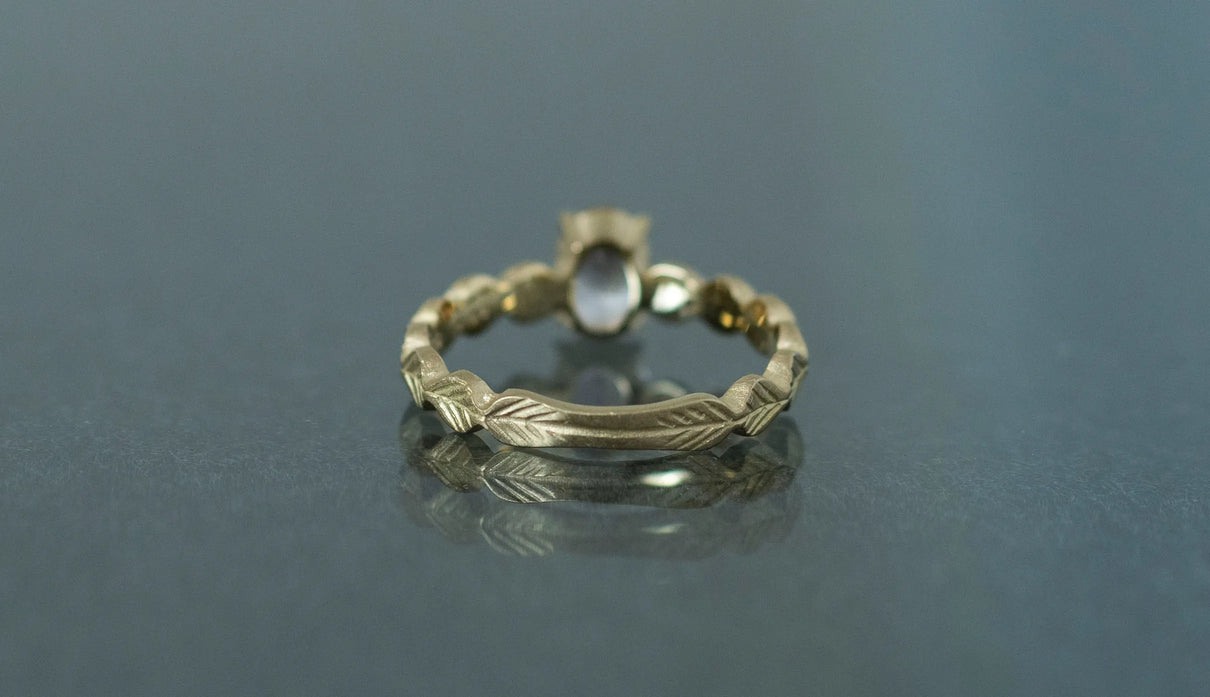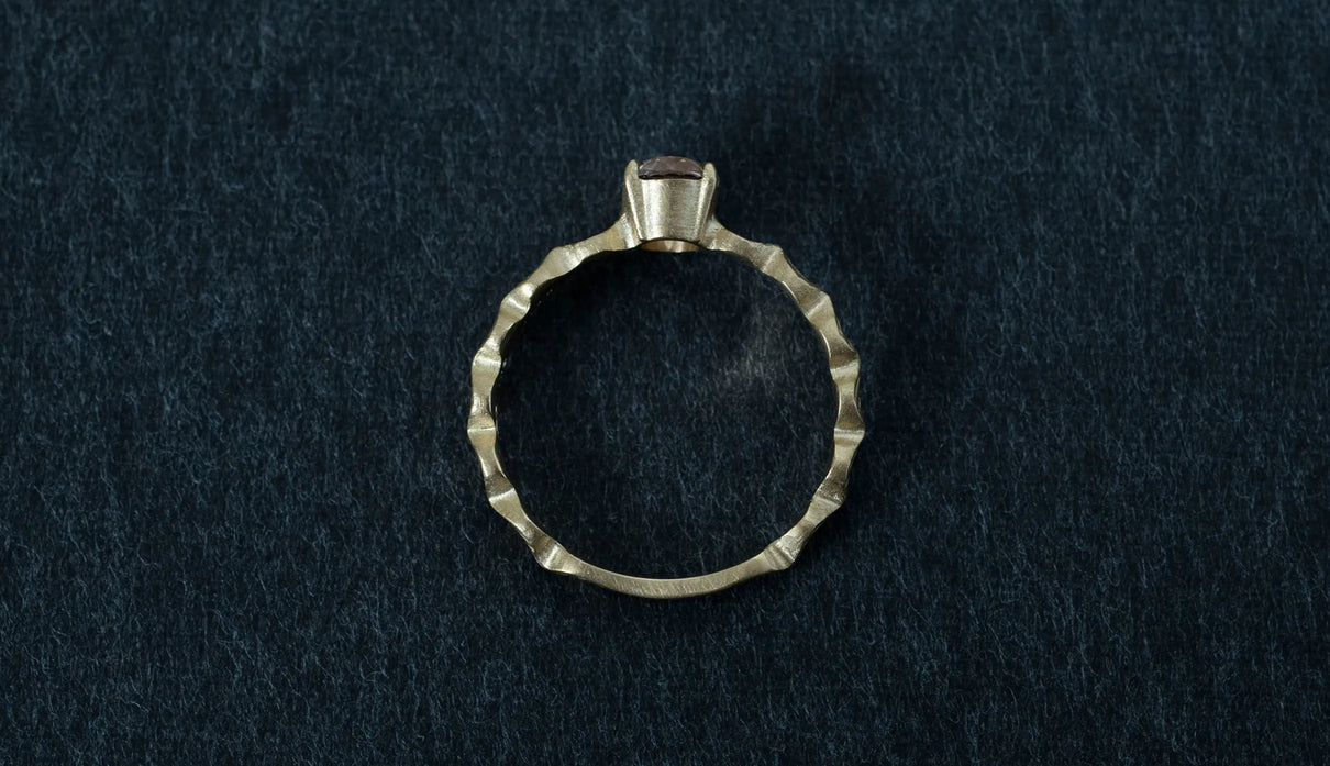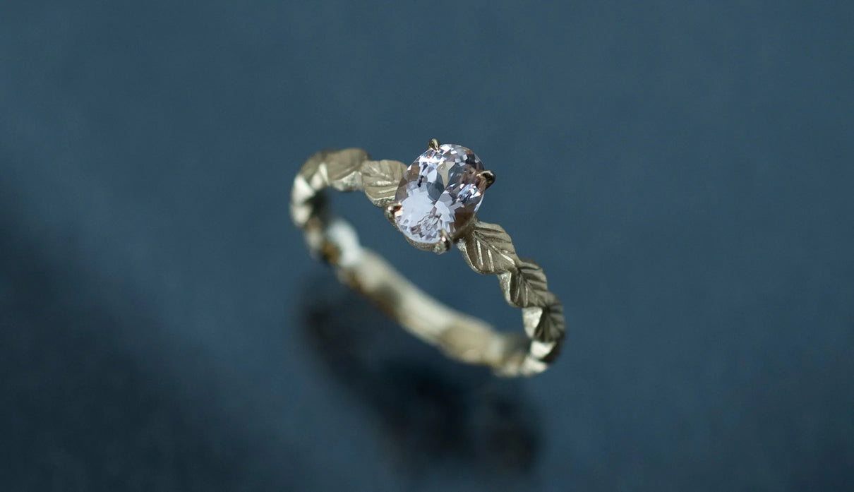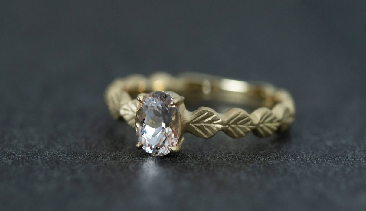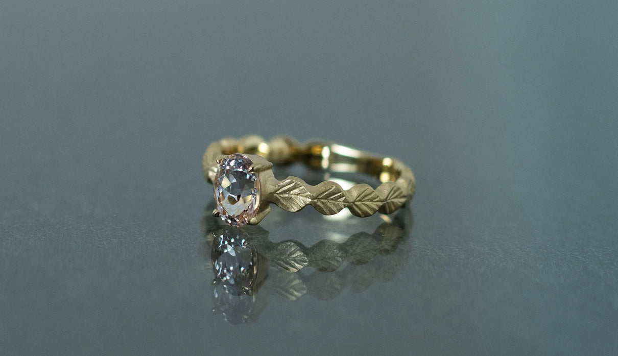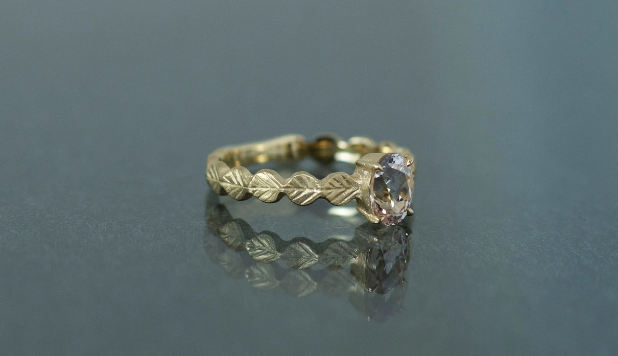 いくつも連なる葉っぱをモチーフに、1枚1枚わずかに異なる表情に遊び心を込めたLeafシリーズに、インペリアルトパーズを留めた一点もののリング。トパーズの中でも、ひときわ稀少とされるインペリアルトパーズ。その名のとおり皇帝の名を冠したこの石は、豊かな色調と深みを宿す特別な存在です。なかでも、わずかに橙を含んだ温かな輝きは、熟した果実をゆっくりと凝縮したような趣をもち、古くは “シェリーカラー” として愛されてきました。静けさの中に凛とした光を秘めた、希少なトパーズです。葉っぱのサイズは小ぶりなLeaf little ベース。日常的に身に着けていただくのはもちろん、特別な贈りものにも最適な一点もののリングです。また11月の誕生石としても親しまれているトパーズは、11月生まれの方の特別なお守りとしてもお勧めです。