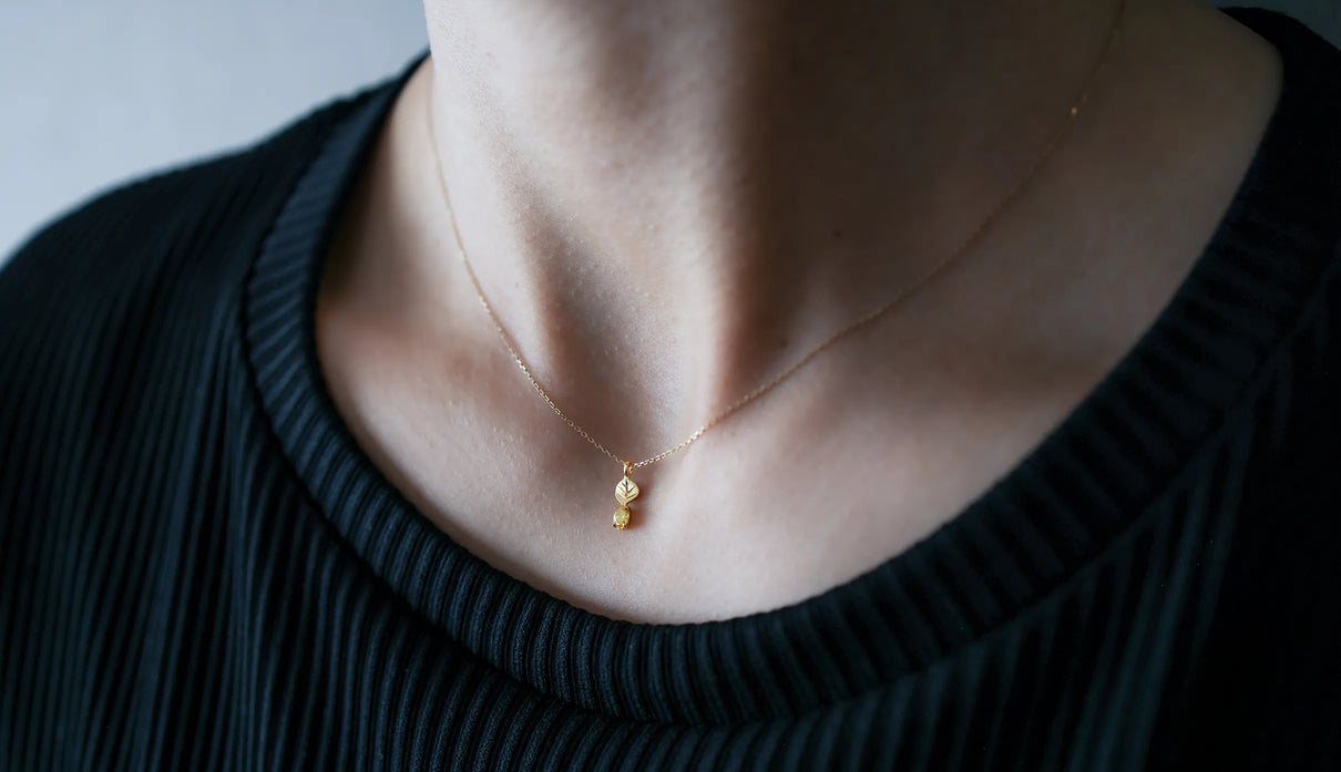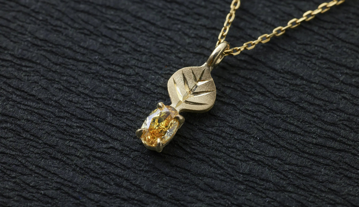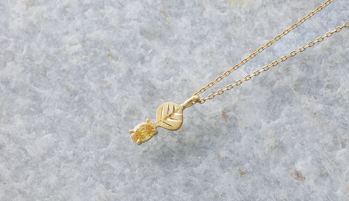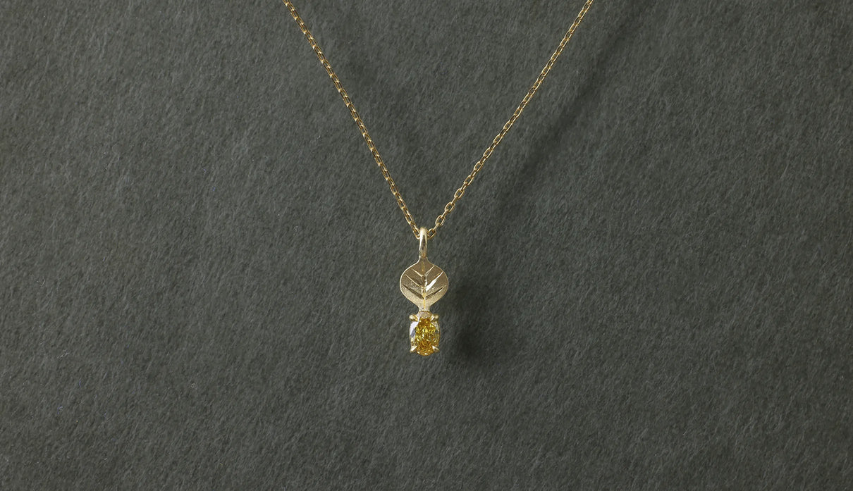 光を仰ぐ葉をモチーフにした「Leaf」シリーズに、はちみつのようにこっくりとした色味をたたえた小粒のイエローダイヤモンドを添えた一点もののネックレス。葉の部分は、やわらかな表情を生むようにマットで仕上げ、肌の上にそっと溶け込むような穏やかさをもたせています。イエローダイヤモンドは小さな粒でありながら、光を受けるたびにささやかな煌めきを放ち、胸元にやさしい明るさを添えます。自然のかたちをそのまま閉じ込めたような、控えめでいて凛とした佇まい。日々の装いに、ほのかな光とさりげない個性を添えてくれます。