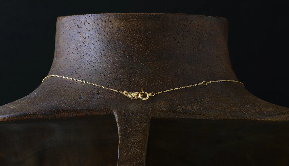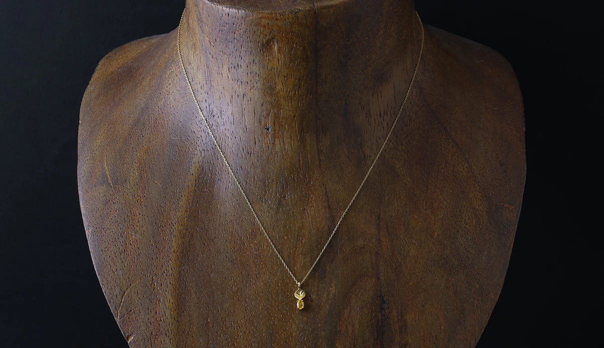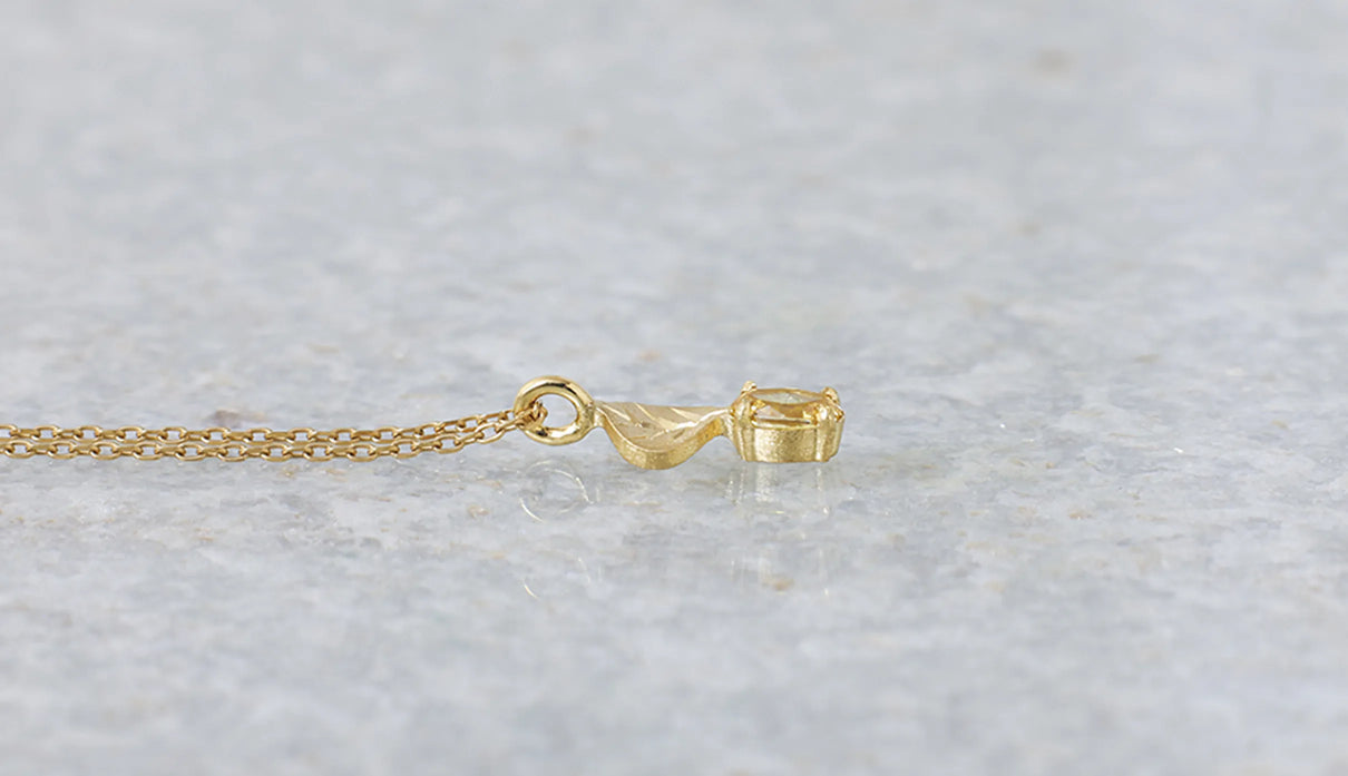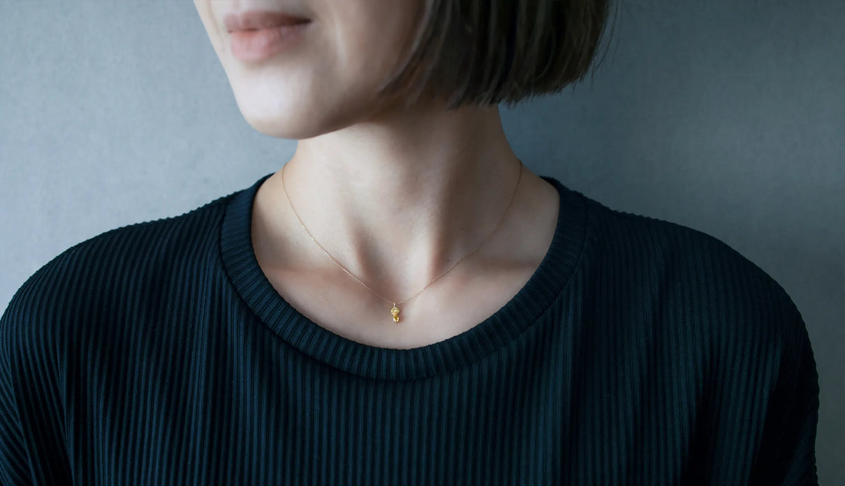 光を仰ぐ葉をモチーフにした「Leaf」シリーズに、はちみつのようにこっくりとした色味をたたえた小粒のイエローダイヤモンドを添えた一点もののネックレス。葉の部分は、やわらかな表情を生むようにマットで仕上げ、肌の上にそっと溶け込むような穏やかさをもたせています。イエローダイヤモンドは小さな粒でありながら、光を受けるたびにささやかな煌めきを放ち、胸元にやさしい明るさを添えます。自然のかたちをそのまま閉じ込めたような、控えめでいて凛とした佇まい。日々の装いに、ほのかな光とさりげない個性を添えてくれます。