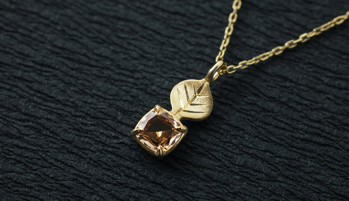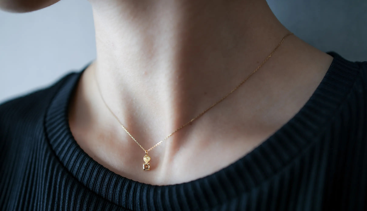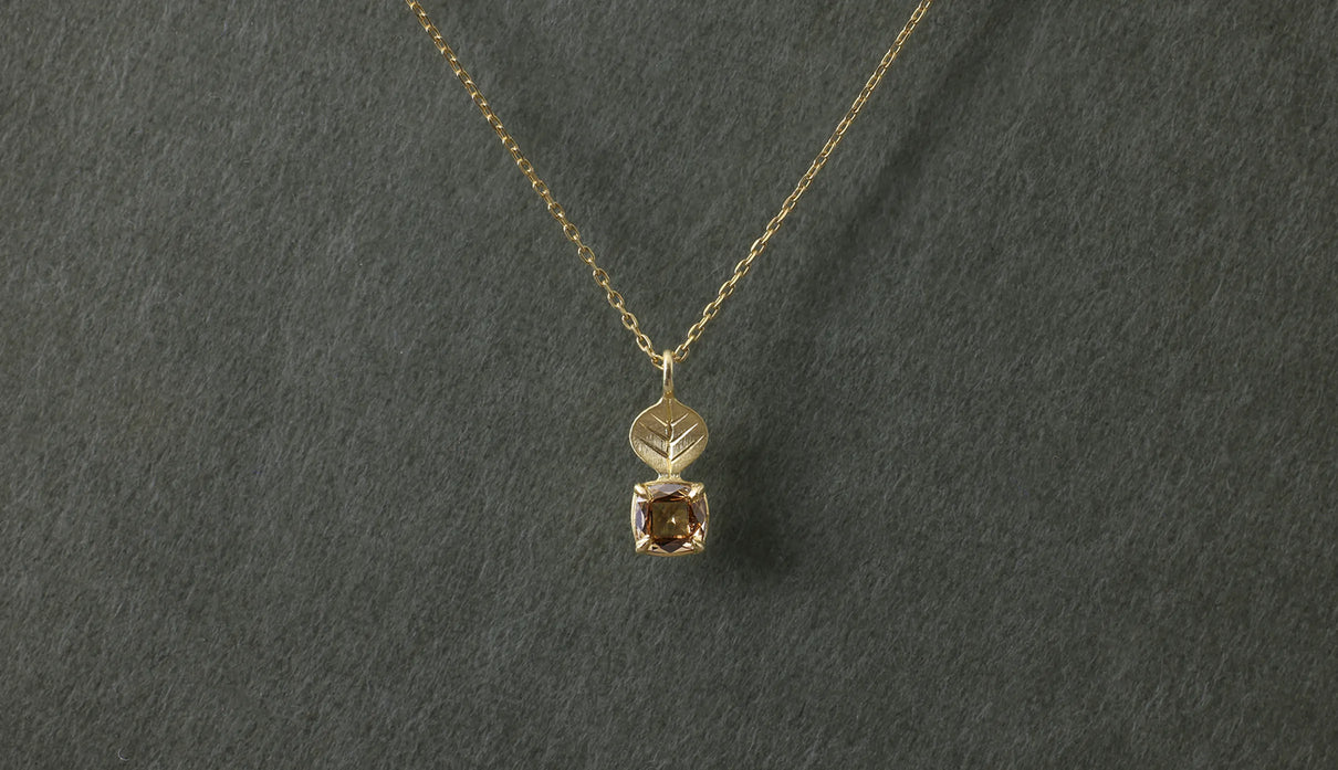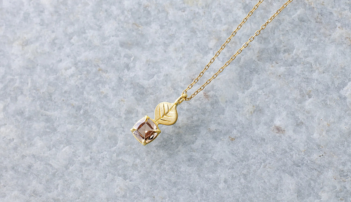 光を仰ぐ葉をモチーフにした「Leaf」シリーズに、透明度の高いライトブラウンのローズカットダイヤモンドを添えた一点もののネックレス。葉の部分は、やわらかな表情を生むマット仕上げで整え、肌の上にそっと馴染む穏やかな気配をもたせています。ダイヤモンドは、ローズカットならではの瑞々しい輝きをたたえ、光を受けるたびに静かにきらめきを放ちます。控えめでいて、どこか上品さと落ち着きが宿る佇まい。特別な日のお守りのようにも、日々の装いにささやかな深みを添える存在として。日常の中で、穏やかに寄り添ってくれるネックレスです。