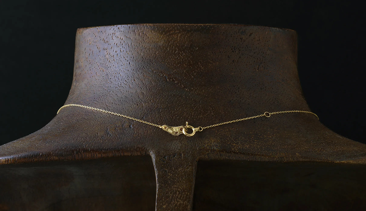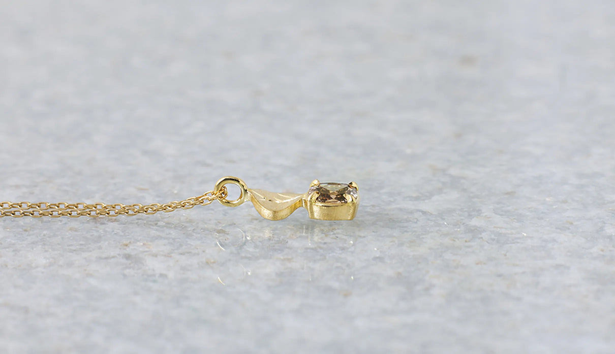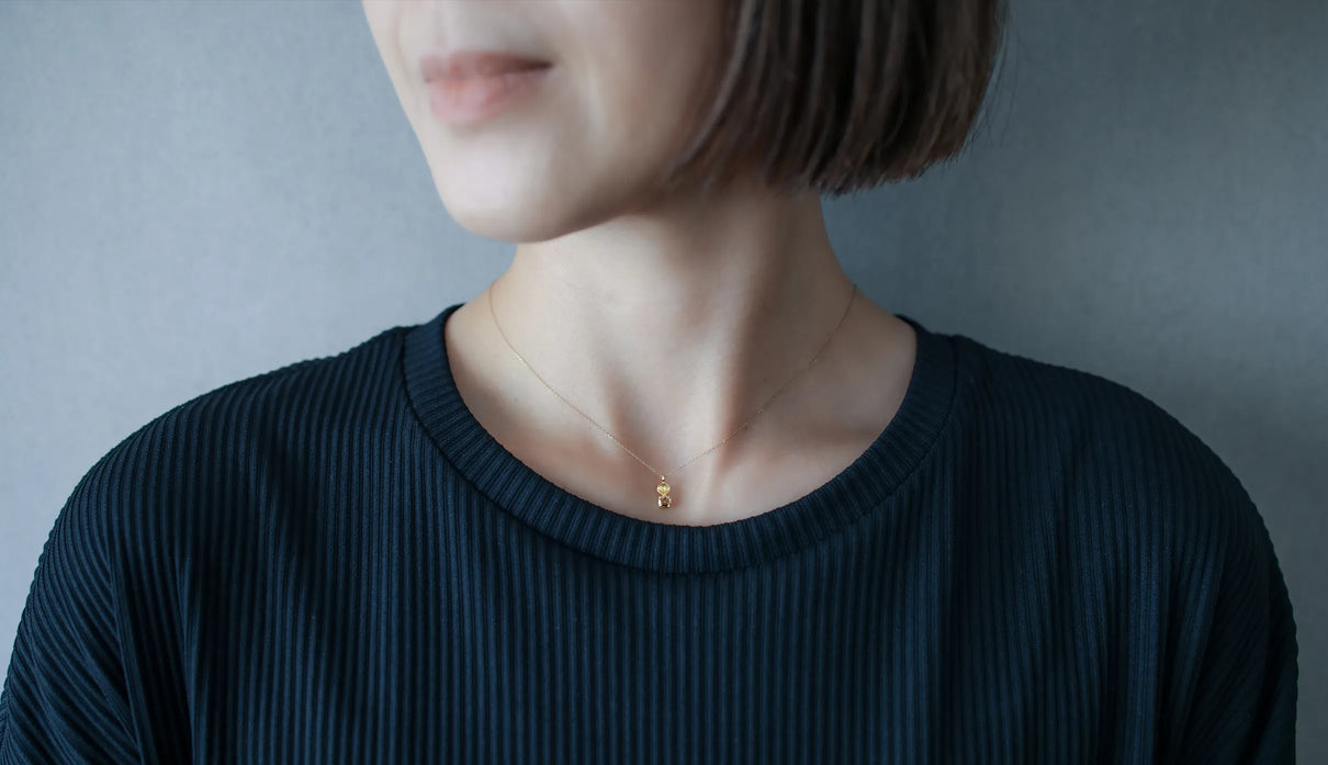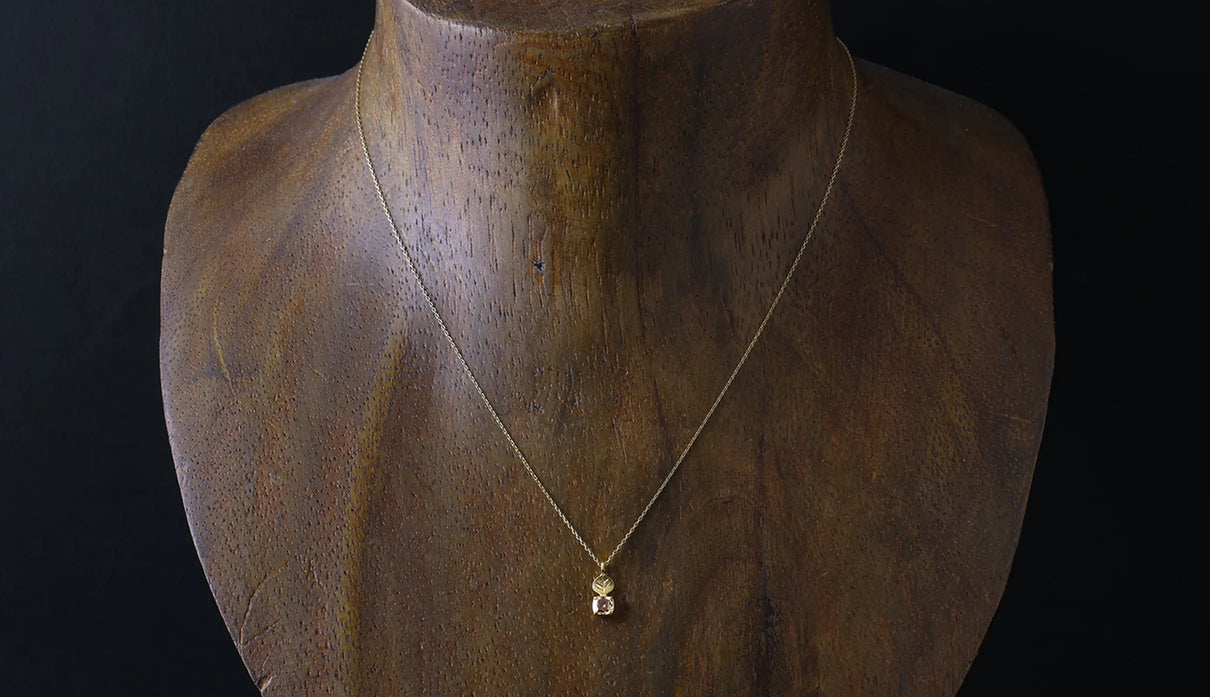 光を仰ぐ葉をモチーフにした「Leaf」シリーズに、透明度の高いライトブラウンのローズカットダイヤモンドを添えた一点もののネックレス。葉の部分は、やわらかな表情を生むマット仕上げで整え、肌の上にそっと馴染む穏やかな気配をもたせています。ダイヤモンドは、ローズカットならではの瑞々しい輝きをたたえ、光を受けるたびに静かにきらめきを放ちます。控えめでいて、どこか上品さと落ち着きが宿る佇まい。特別な日のお守りのようにも、日々の装いにささやかな深みを添える存在として。日常の中で、穏やかに寄り添ってくれるネックレスです。
