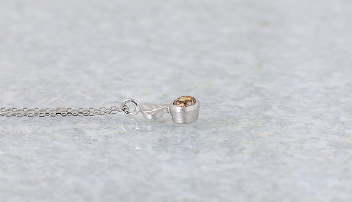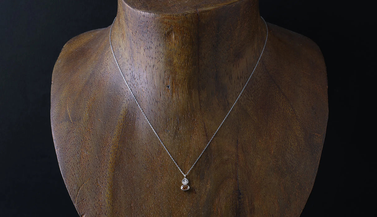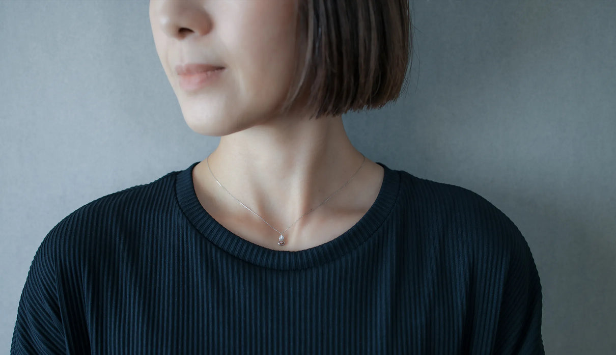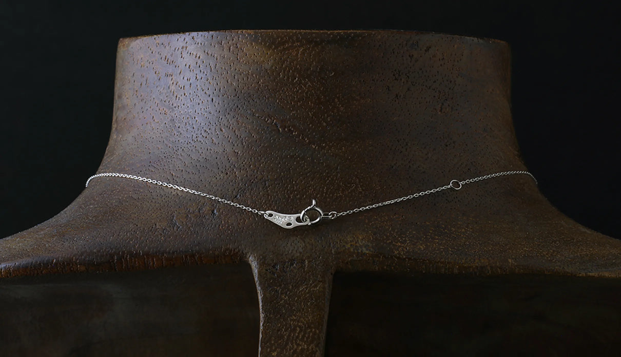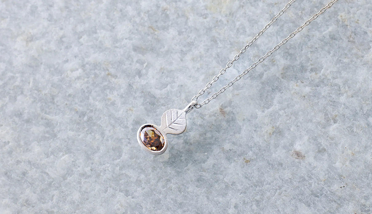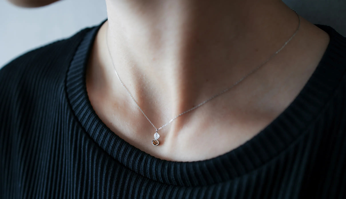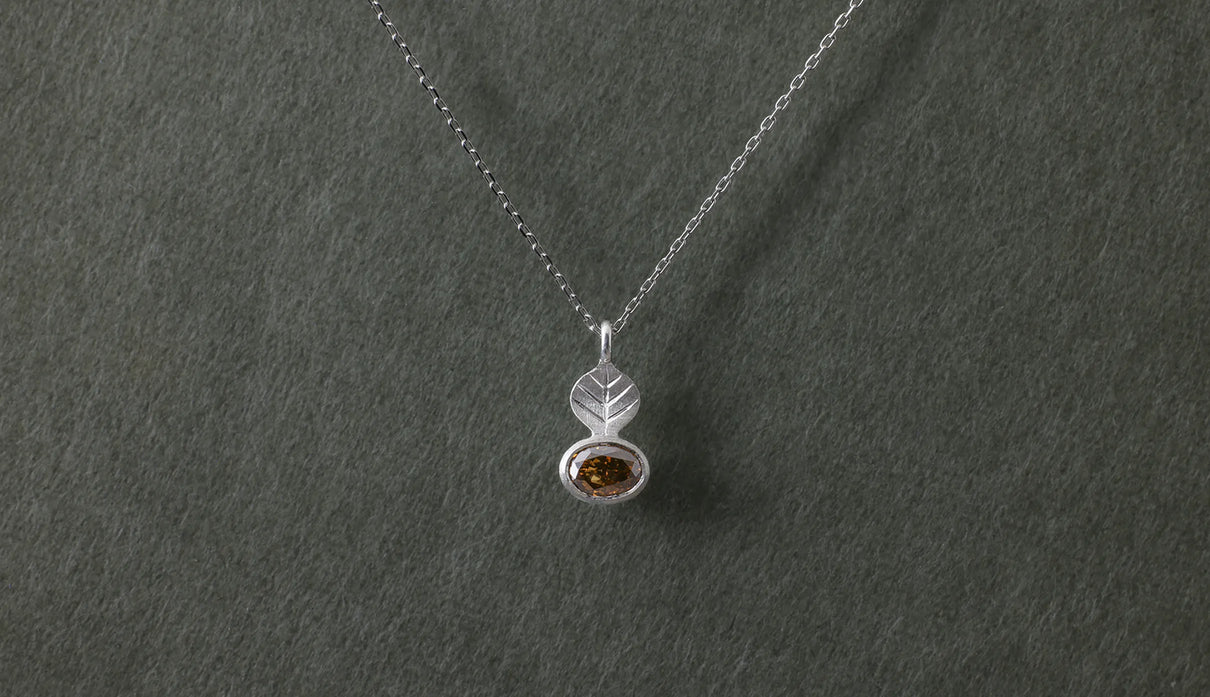 光を仰ぐ葉をモチーフにした「Leaf」シリーズに、透明度の高いローズカットのコニャックブラウンのダイヤモンドを添えた一点もののネックレス。葉のパーツはマットに仕上げ、肌にそっと馴染む穏やかな表情に。ダイヤモンドは、ローズカットならではの水面に光が触れる瞬間のような潤みを湛えながら、控えめで上品な輝きを放ちます。日常の装いに自然に溶け込み、胸元にささやかな華やぎを添える佇まい。大切な方への贈り物として、またご自身の日常にそっとともにある存在として。日々に寄り添いながら、静かに輝きを添えるネックレスです。