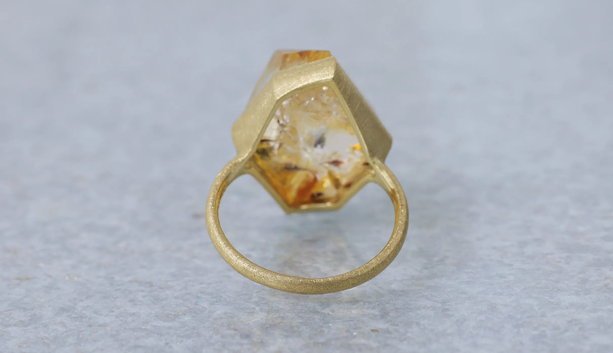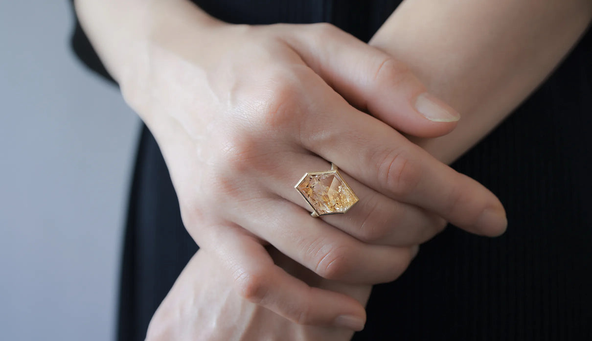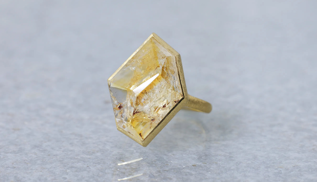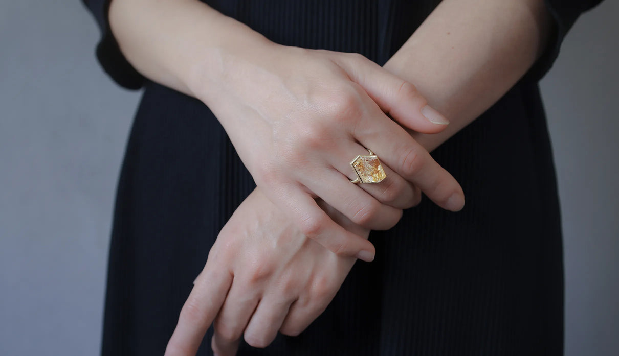 宝石研磨士・大城かん奈氏の手磨り技法による、自由で伸びやかなカッティングが施されたゲーサイトインシトリンの一点もののリング。キャンディを思わせる大胆なフォルムの中で、最も濃く立ち上がるのは、頂点付近に留まる蜂蜜のような深いオレンジ。あえて高さを残したカッティングが、その色を強調し、全体にオレンジを纏わせるように見せています。下部はクリアに近いトーンを宿しており、光や角度によって、全体がオレンジに染まるようにも、バイカラーとしても姿を変えます。内部を覗き込むと、霧のように漂うミスト、虹色のアイリス、ワイン色のゲーサイトが静かに重なり、唯一無二の表情を湛えています。まるで、その景色そのものをそっと纏うように。静かでありながら、揺るぎない印象を残すリングです。