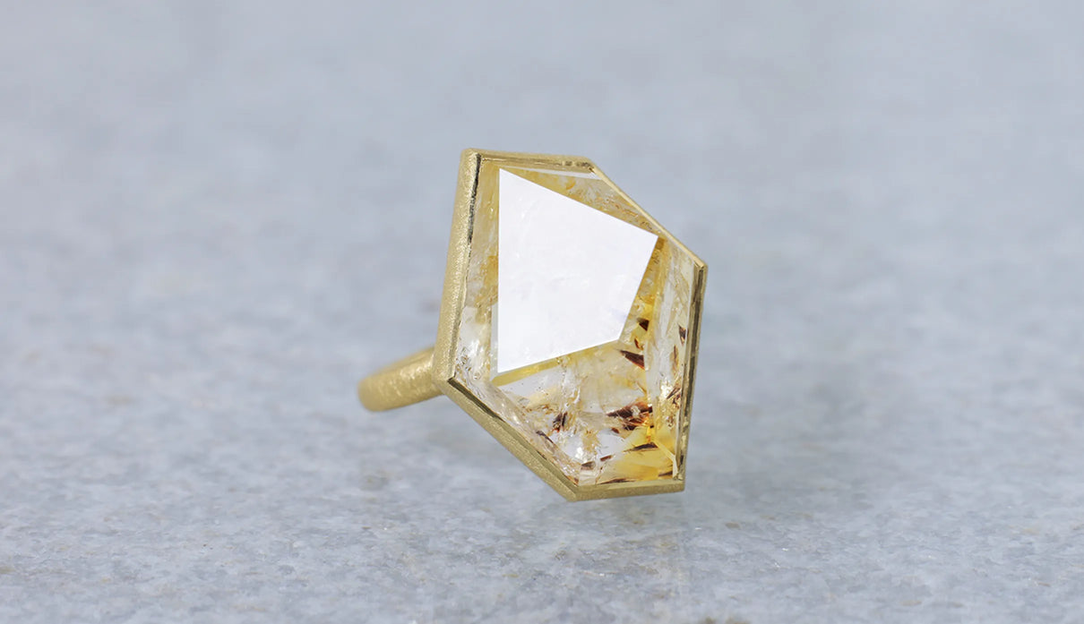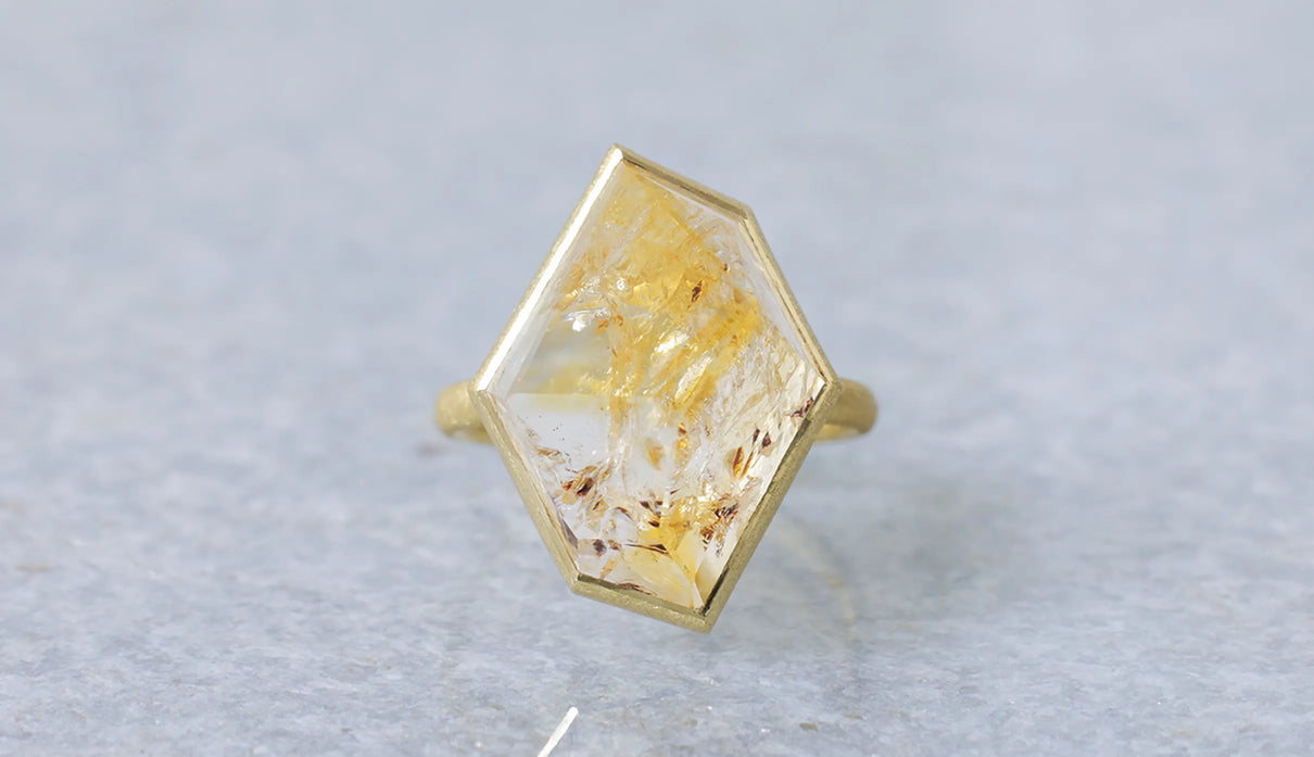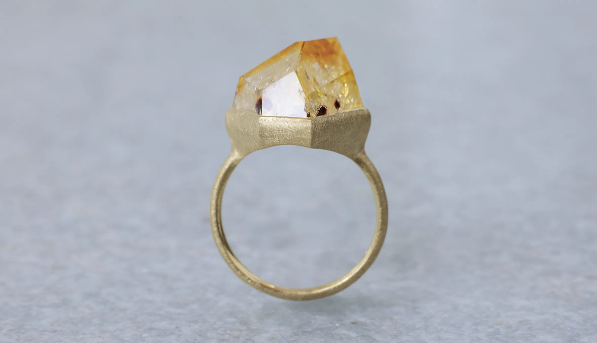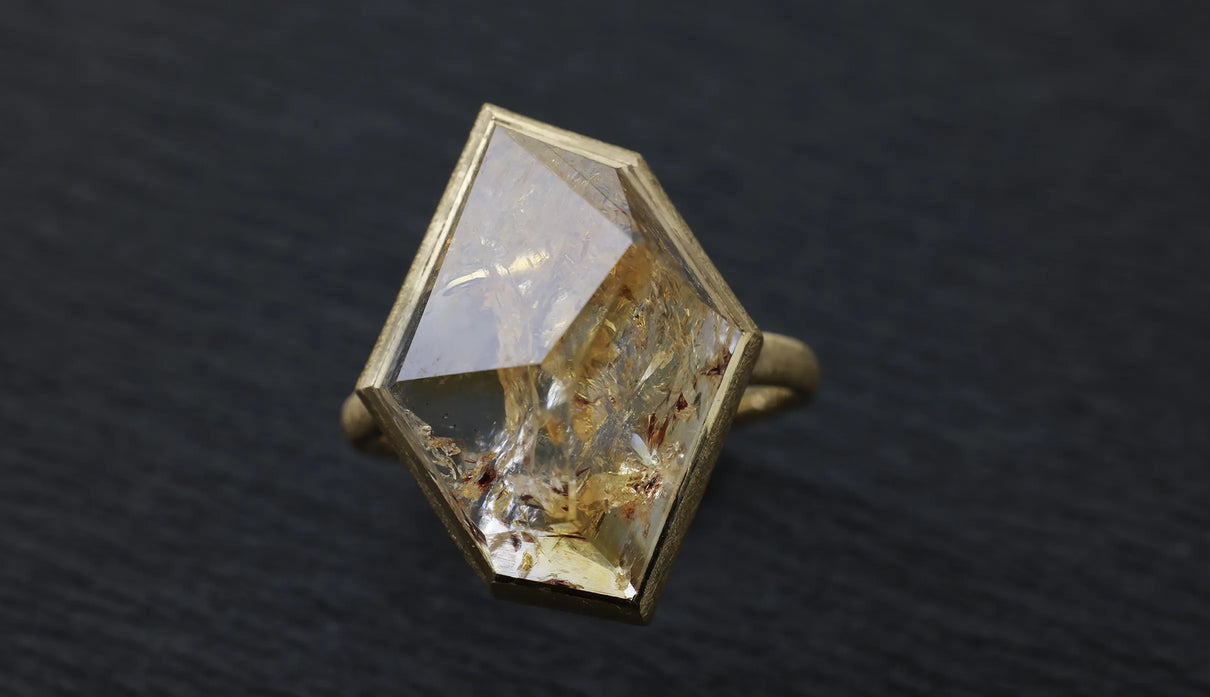 宝石研磨士・大城かん奈氏の手磨り技法による、自由で伸びやかなカッティングが施されたゲーサイトインシトリンの一点もののリング。キャンディを思わせる大胆なフォルムの中で、最も濃く立ち上がるのは、頂点付近に留まる蜂蜜のような深いオレンジ。あえて高さを残したカッティングが、その色を強調し、全体にオレンジを纏わせるように見せています。下部はクリアに近いトーンを宿しており、光や角度によって、全体がオレンジに染まるようにも、バイカラーとしても姿を変えます。内部を覗き込むと、霧のように漂うミスト、虹色のアイリス、ワイン色のゲーサイトが静かに重なり、唯一無二の表情を湛えています。まるで、その景色そのものをそっと纏うように。静かでありながら、揺るぎない印象を残すリングです。