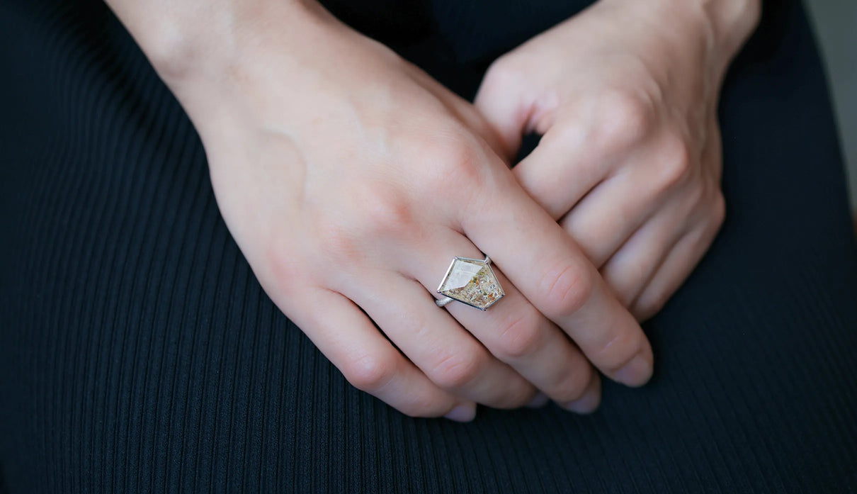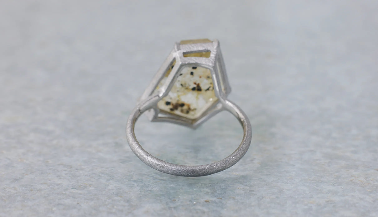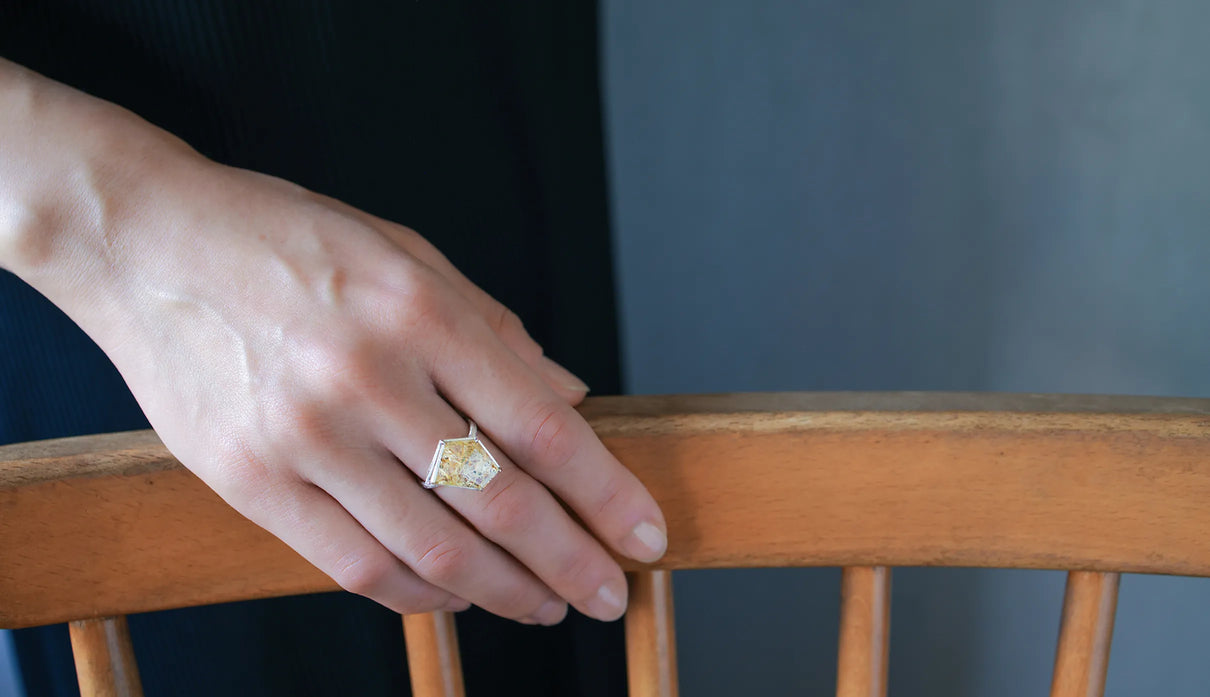 宝石研磨士・大城かん奈氏による手磨りのカッティングが施された、スターバースト・ゴールドルチルクォーツの一点もののリング。透明度の高いクォーツの中に、光の筋のように細やかに伸びるルチルが密度をもって広がり、繊細なきらめきが立ち上がります。このルースには、裏面に原石肌をあえて残したカッティングが施されていて、みずみずしいクォーツの中、海底の珊瑚礁を思わせる起伏が重ねられ、そこに伸び上がるルチルの細い光が呼応することで、自然のままの揺らぎと洗練が共存する、唯一無二の景色が生まれています。プラチナで仕立てたフレームが、石の佇まいを絵画のように受けとめ、指先に穏やかな静けさを添えるリングへと仕立てました。自然の息づかいごと身にまとうように。視線を落とすたび、深い余韻を感じさせる一点もののリングです。