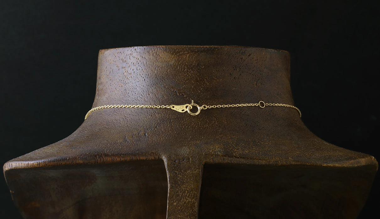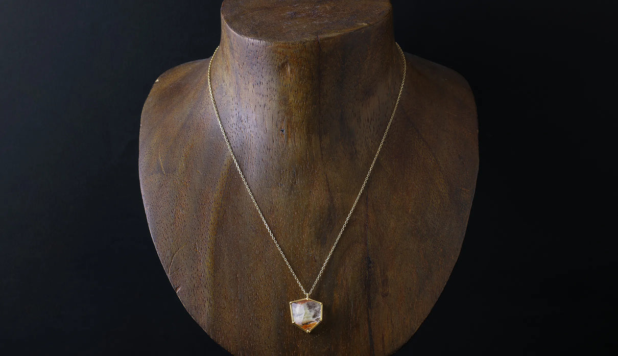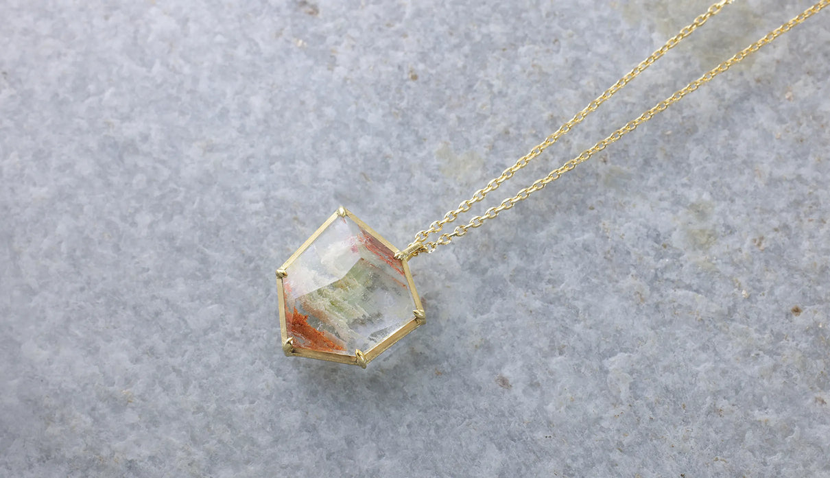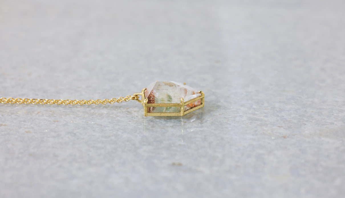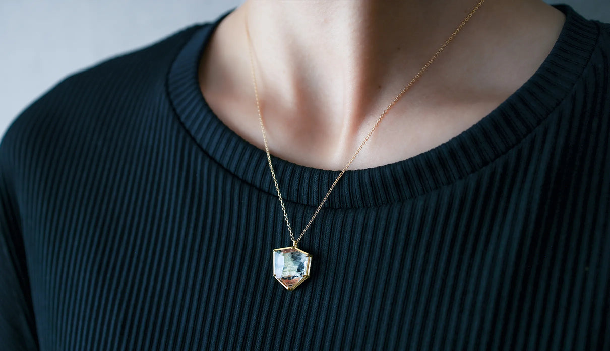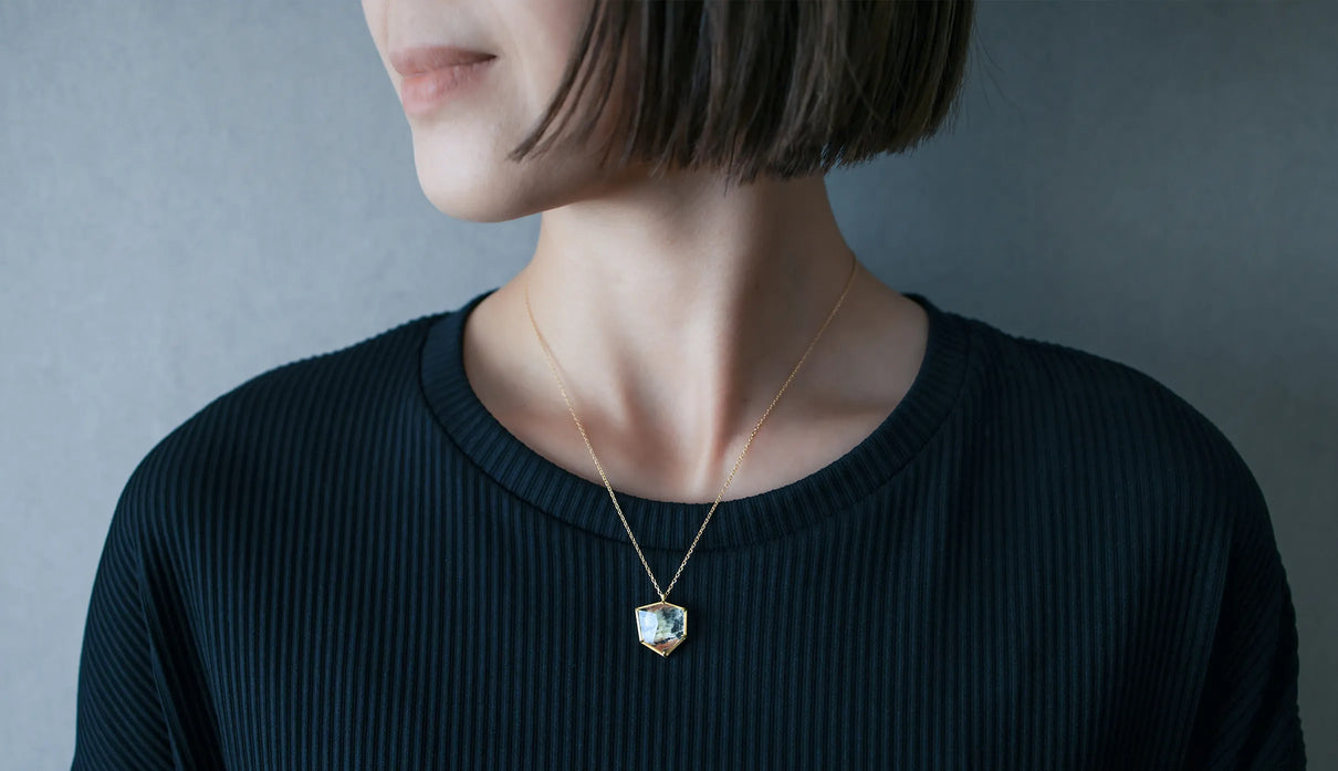 宝石研磨士・大城かん奈氏による手磨りのカッティングが施された、ガーデンクォーツの一点もののネックレス。スモーキーなグリーンや白のインクルージョンの中に、赤褐色が微かに差し込み、ひと粒の中に抽象画のような表情が広がります。色の粗密が自然に重なり合うその景色は、時間や記憶の層が静かに沈んでいるかのような奥行きを感じさせます。ルースは、あえて高さを抑え、レリーフのような印象をもつカッティングで仕立てられました。大きくとられた面が透明な窓のように内包物を映し出し、重さを感じさせることなく、その抽象的な表情を余すことなく堪能することができます。ネックレスは、K18イエローゴールドでごく控えめに縁取り、石の存在を真っ直ぐに受けとめました。ひとつの抽象を、そのまま胸元に留めるように。ふとした瞬間に、その美が静かに姿を見せるネックレスです。