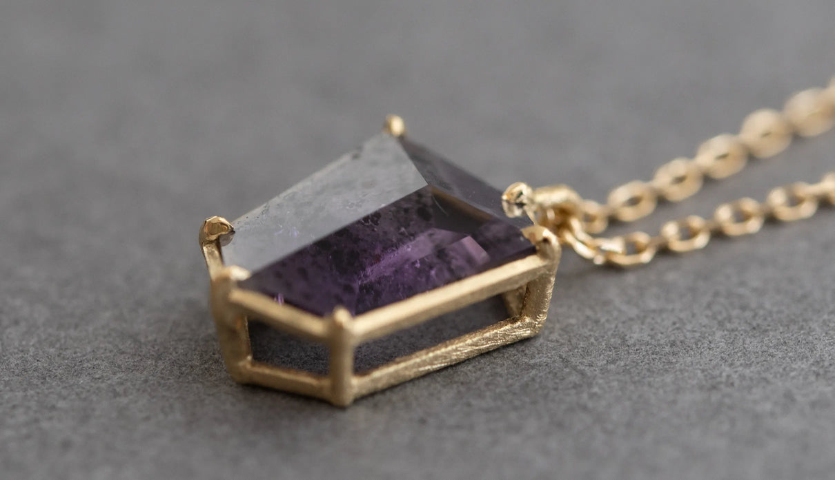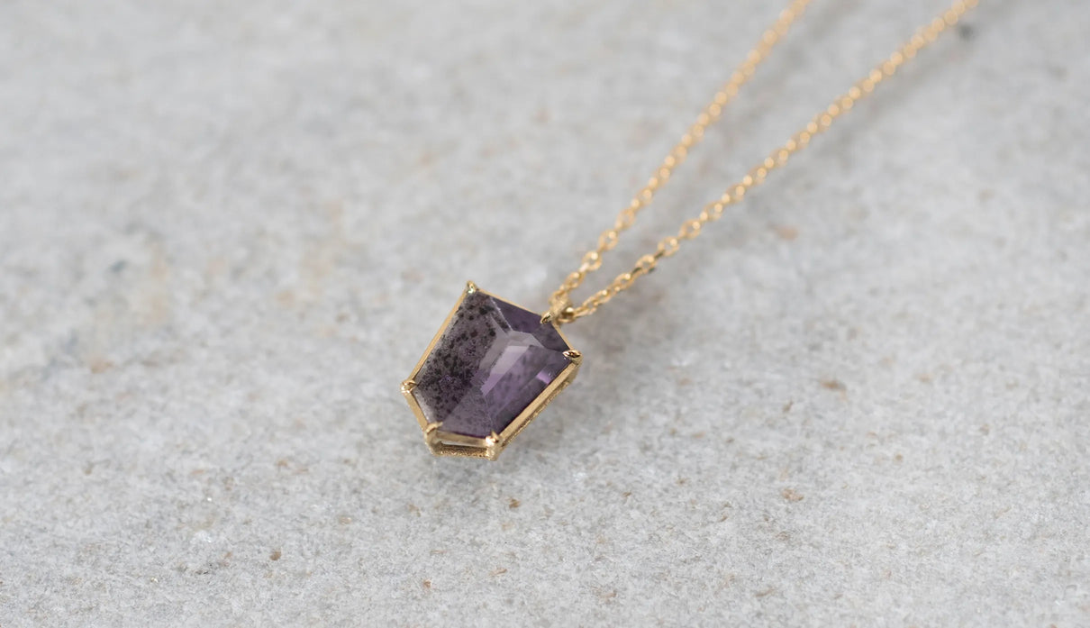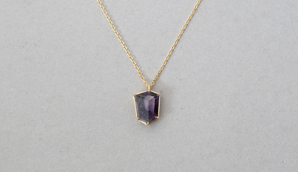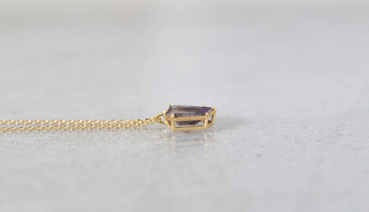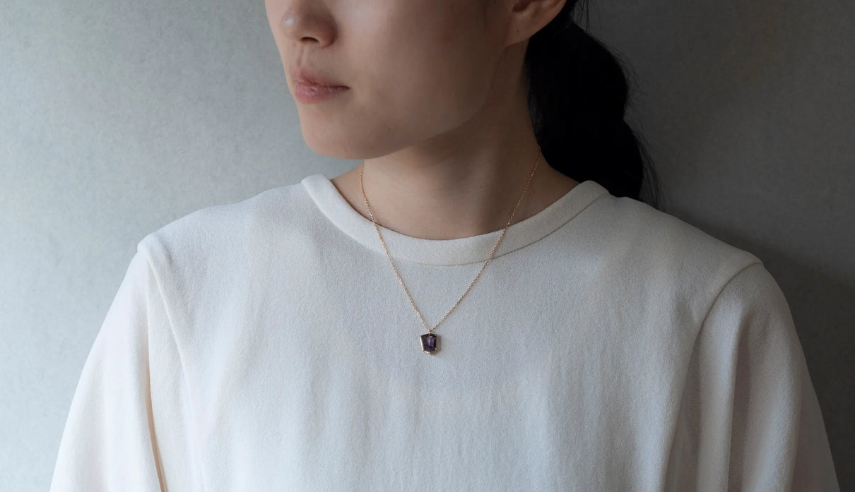 宝石研磨士・大城かん奈氏による手磨りのカッティングが施された、トラピッチェアメジストの一点もののネックレス。みずみずしい紫の結晶の中にやわらかな白の石英が潜み、小さな黒い粒が散るように浮かぶ、独特の表情を宿したルースです。一定ではない色の重なりが、ひと粒の中に奥行きと静かな気配を生み出しています。表面は、大胆に三面のみで構成されたカッティング。面をそぎ落としたシンプルな造形だからこそ、内部の光と影の移ろいがそのまま視界に届き、まるで結晶の中へ直接まなざしを落とすように、その表情を味わうことができます。過剰な装飾を添えず、胸元にひとつの形として静かに佇むバランスのデザインへ。ひとつのアートピースをそのまま指先に宿す感覚のネックレス。静けさのなかに、揺るぎない美しさが息づいています。