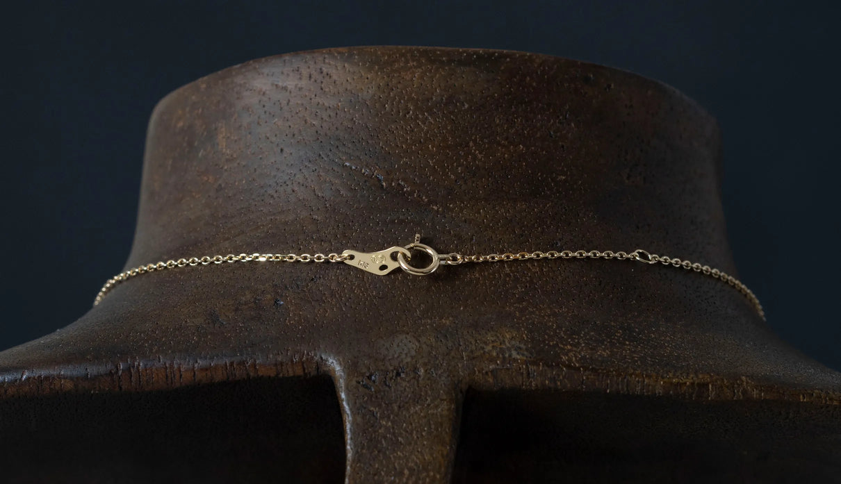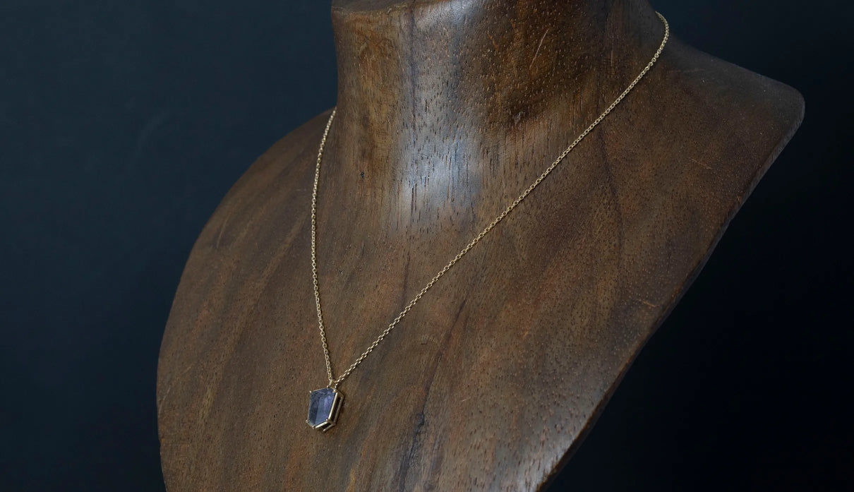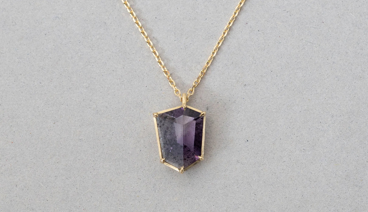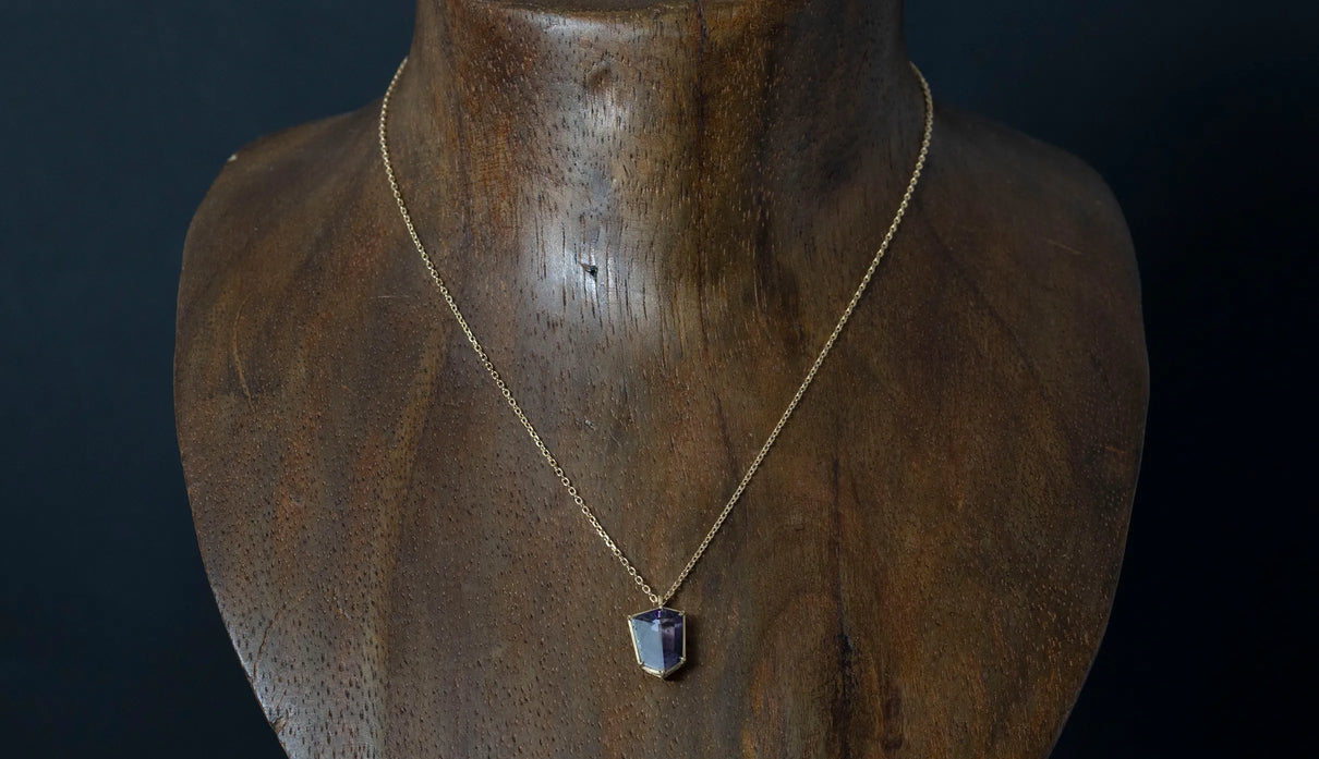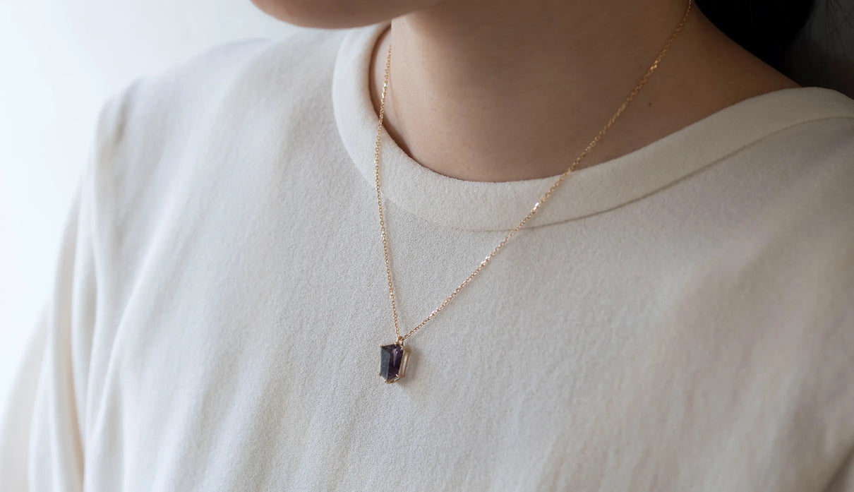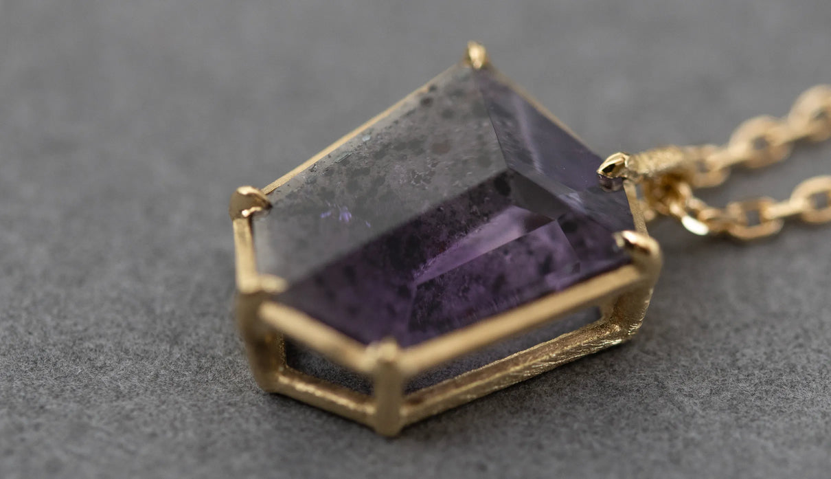 宝石研磨士・大城かん奈氏による手磨りのカッティングが施された、トラピッチェアメジストの一点もののネックレス。みずみずしい紫の結晶の中にやわらかな白の石英が潜み、小さな黒い粒が散るように浮かぶ、独特の表情を宿したルースです。一定ではない色の重なりが、ひと粒の中に奥行きと静かな気配を生み出しています。表面は、大胆に三面のみで構成されたカッティング。面をそぎ落としたシンプルな造形だからこそ、内部の光と影の移ろいがそのまま視界に届き、まるで結晶の中へ直接まなざしを落とすように、その表情を味わうことができます。過剰な装飾を添えず、胸元にひとつの形として静かに佇むバランスのデザインへ。ひとつのアートピースをそのまま指先に宿す感覚のネックレス。静けさのなかに、揺るぎない美しさが息づいています。
