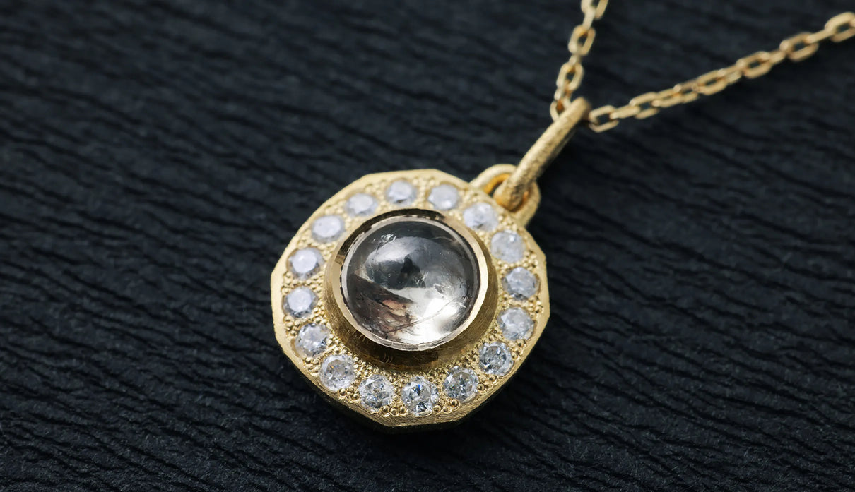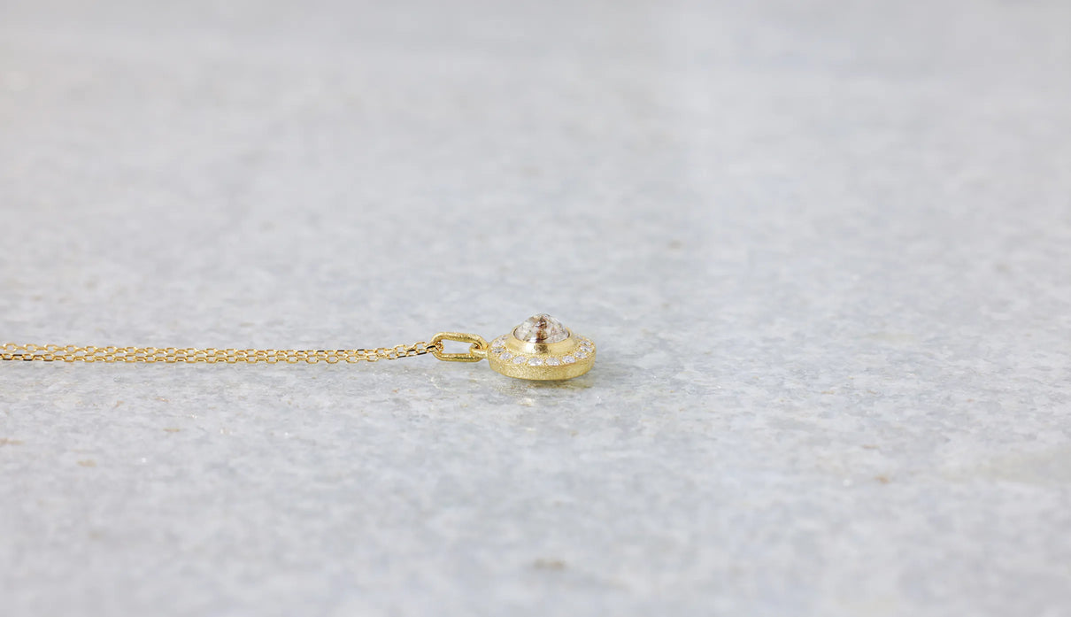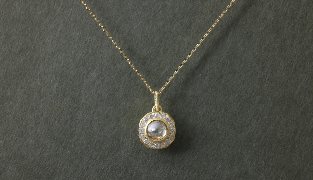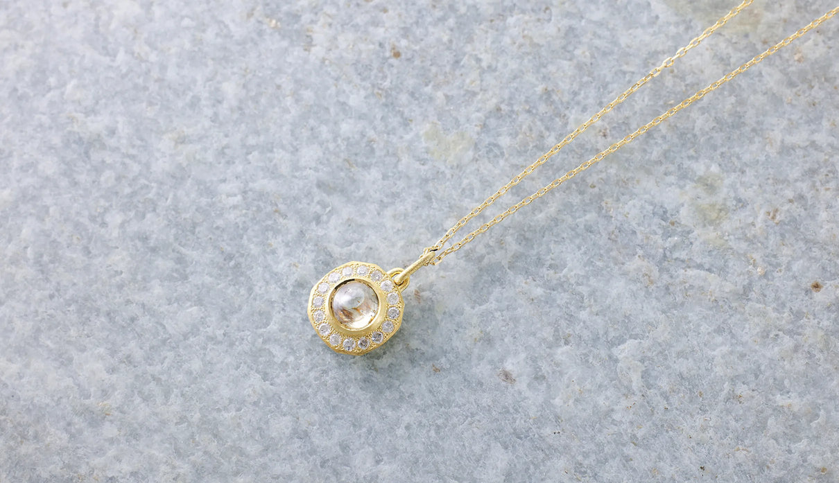 ドーム状の曲面をもつカボションカットのダイヤモンドを用いた、一点もののネックレス。地球上でもっとも硬いダイヤモンドにこの緩やかな曲面を与えるには、高い精度の研磨技術が必要とされます。巧みな仕事により、石の内部に抱かれた景色が立体的に映し出され、滴る水のような表情が生まれました。内側には、レッドブラウンのインクルージョンが静かに溶け込むように存在し、透明な結晶の中にあたたかさと奥行きを添えています。光を取り込むたび、内側でゆらぎながら艶やかな潤みをたたえ、内に潜む静かな深さを感じさせます。デザインはシンプルでありながら、輪郭にごく僅かな動きを残すことで、石の気配がそのまま立ち上がるようなシルエットに。周囲にあしらった乳白色のアイスカラーダイヤモンドが、全体に柔らかな統一感と凛とした光を添えています。50cmのチェーンが胸元にほどよい余白を生み、そっと静かな光を留めるネックレスです。