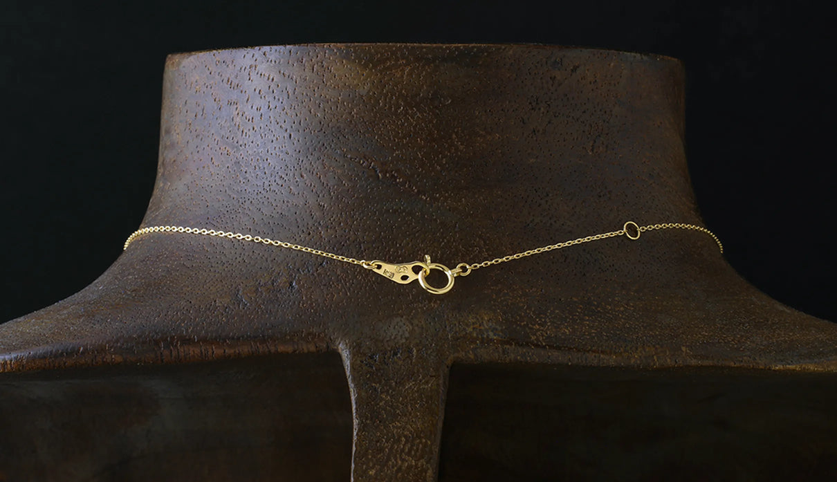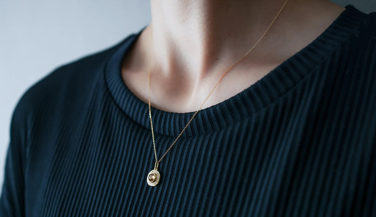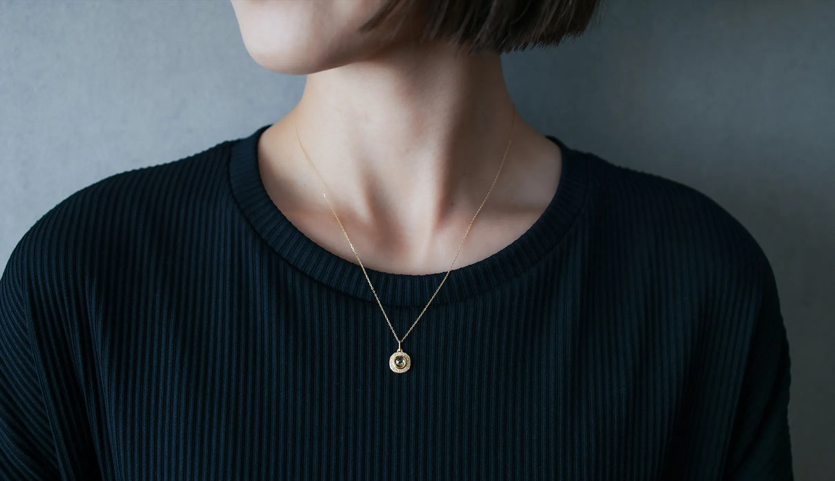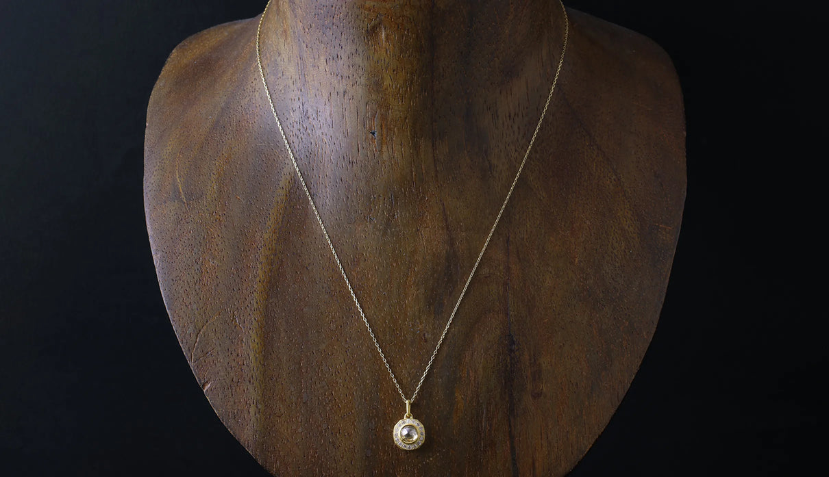 ドーム状の曲面をもつカボションカットのダイヤモンドを用いた、一点もののネックレス。地球上でもっとも硬いダイヤモンドにこの緩やかな曲面を与えるには、高い精度の研磨技術が必要とされます。巧みな仕事により、石の内部に抱かれた景色が立体的に映し出され、滴る水のような表情が生まれました。内側には、レッドブラウンのインクルージョンが静かに溶け込むように存在し、透明な結晶の中にあたたかさと奥行きを添えています。光を取り込むたび、内側でゆらぎながら艶やかな潤みをたたえ、内に潜む静かな深さを感じさせます。デザインはシンプルでありながら、輪郭にごく僅かな動きを残すことで、石の気配がそのまま立ち上がるようなシルエットに。周囲にあしらった乳白色のアイスカラーダイヤモンドが、全体に柔らかな統一感と凛とした光を添えています。50cmのチェーンが胸元にほどよい余白を生み、そっと静かな光を留めるネックレスです。