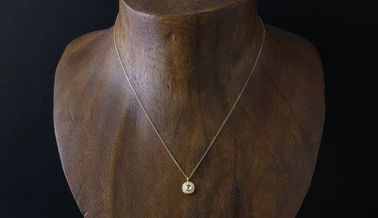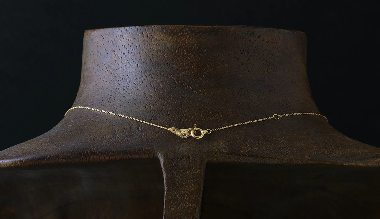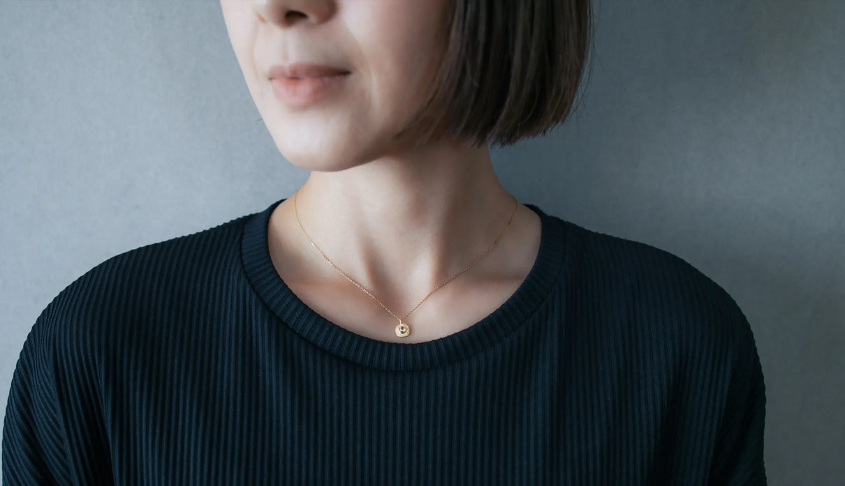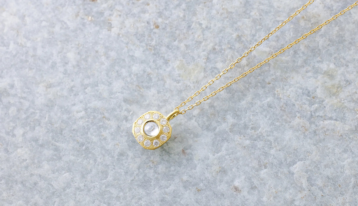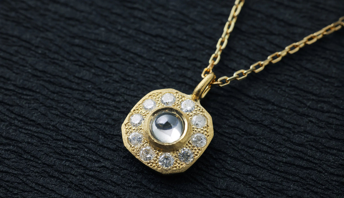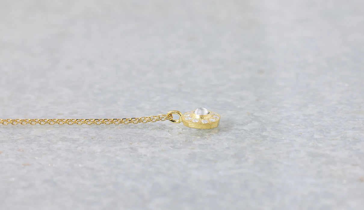 ドーム状の曲面をもつカボションカットのクリアダイヤモンドを用いた、一点もののネックレス。地球上でもっとも硬いダイヤモンドにこの緩やかな曲面を与えるには、高い精度の研磨技術が必要とされます。巧みな仕事により、石の内部に抱かれた光が立体的に映し出され、滴る水のような表情が生まれました。デザインはシンプルでありながら、輪郭にごく僅かな動きを残すことで、石の気配がそのまま立ち上がるようなシルエットに。周囲にあしらった乳白色のアイスカラーダイヤモンドが、全体に柔らかな統一感と凛とした光を添えています。日々に寄り添いながら、胸元に凛とした気配を宿すネックレスです。
