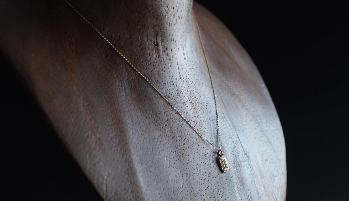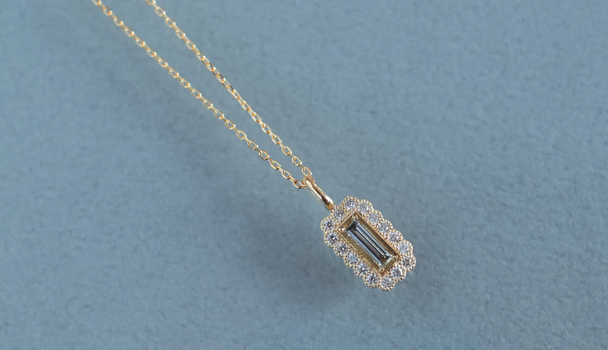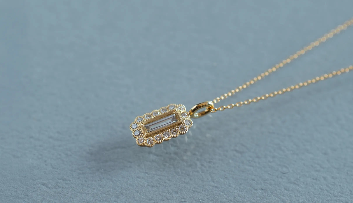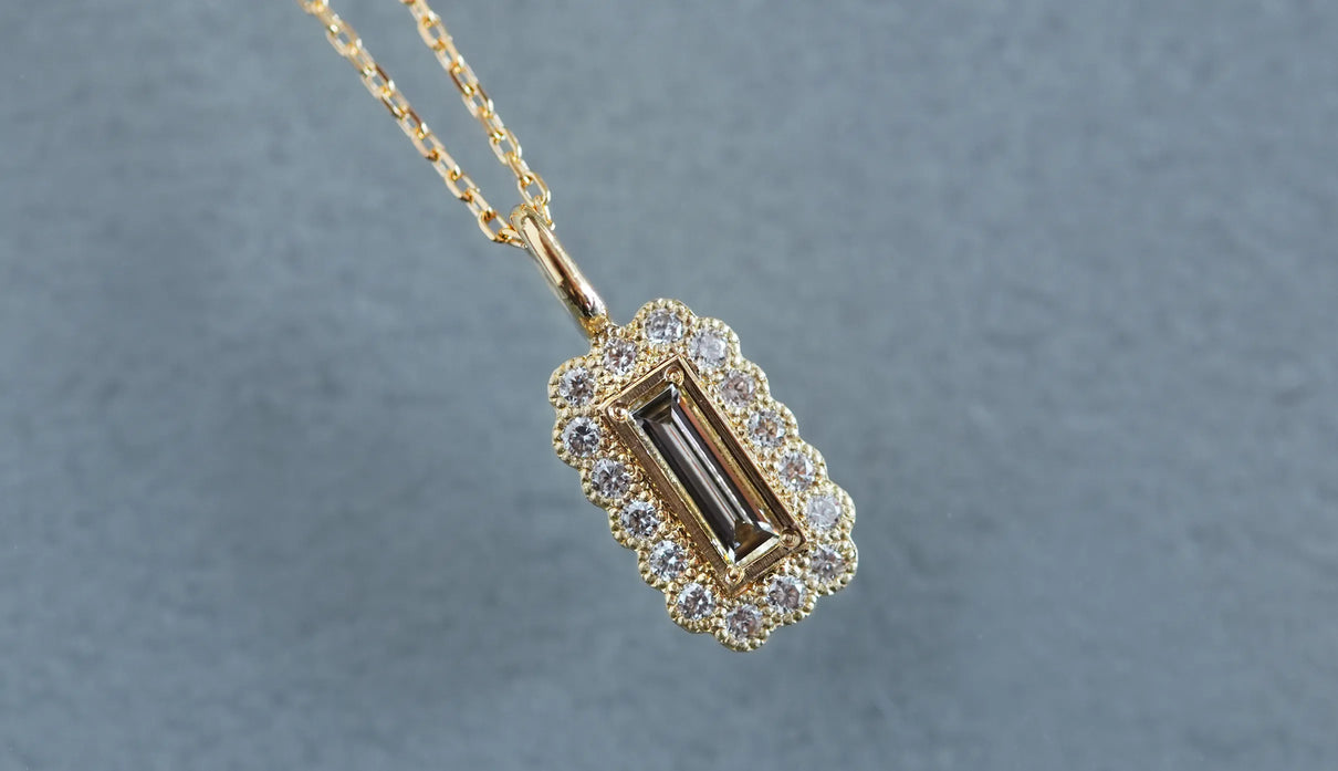 繊細なバゲットカットのライトブラウンカラーダイヤモンドを中心に据えた、一点もののネックレス。線のように細やかなカットが施されたクリアカラーのダイヤモンドを、メレダイヤモンドと緻密なミルグレインで額縁のように囲みます。中央のシャープな輝きと、外側にやわらかく連なる光との対比により、愛らしいシルエットでありながら、甘さに寄りすぎないクラシカルでシックな気配が宿ります。落ち着いた光が胸元にそっと留まり、日々の装いに品のある表情を添えてくれる佇まいです。日々に寄り添うジュエリーとしてはもちろん、大切な方への贈り物にもおすすめです。