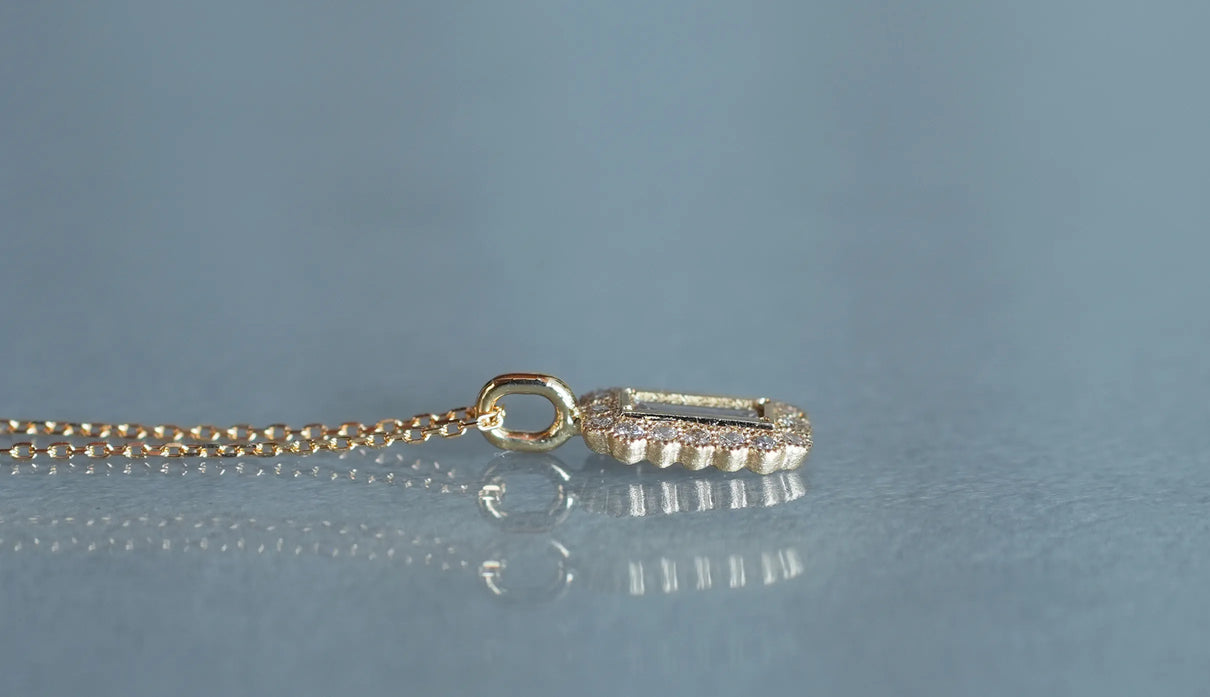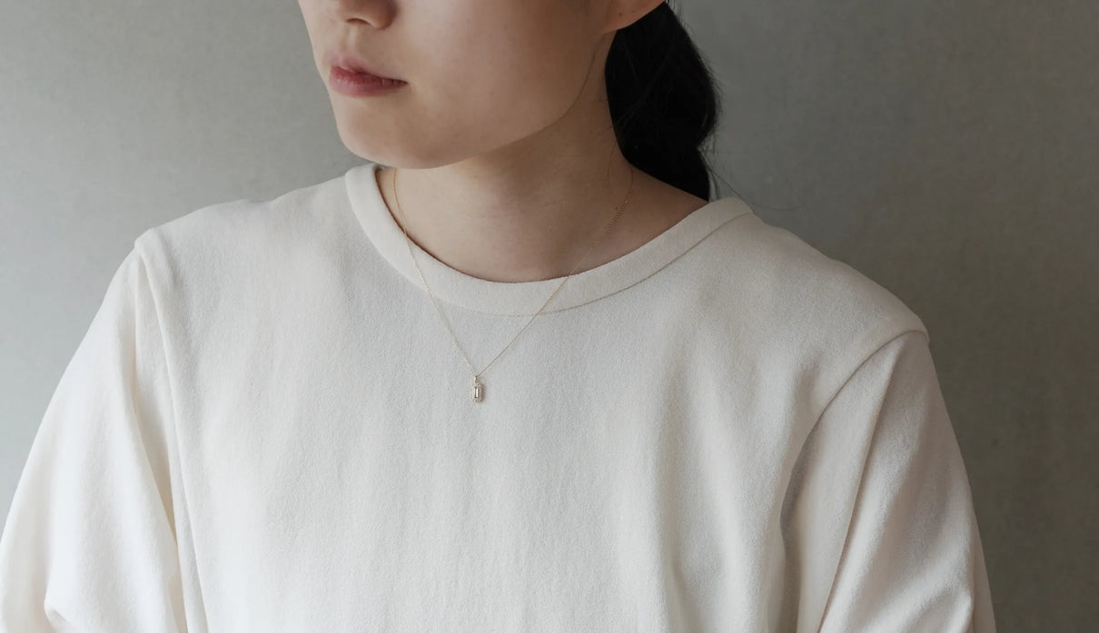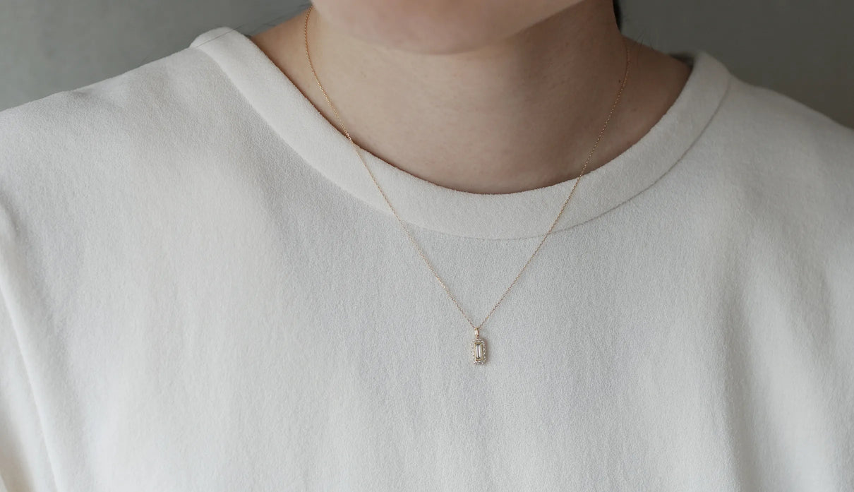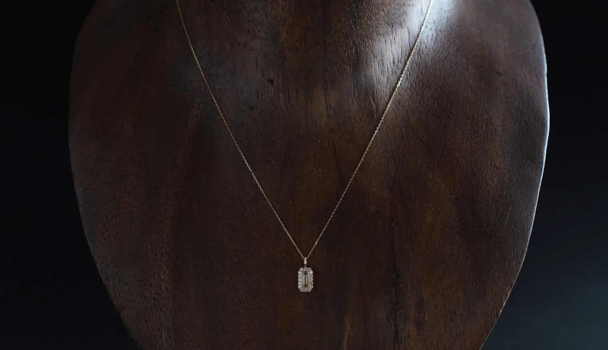 繊細なバゲットカットのライトブラウンカラーダイヤモンドを中心に据えた、一点もののネックレス。線のように細やかなカットが施されたクリアカラーのダイヤモンドを、メレダイヤモンドと緻密なミルグレインで額縁のように囲みます。中央のシャープな輝きと、外側にやわらかく連なる光との対比により、愛らしいシルエットでありながら、甘さに寄りすぎないクラシカルでシックな気配が宿ります。落ち着いた光が胸元にそっと留まり、日々の装いに品のある表情を添えてくれる佇まいです。日々に寄り添うジュエリーとしてはもちろん、大切な方への贈り物にもおすすめです。