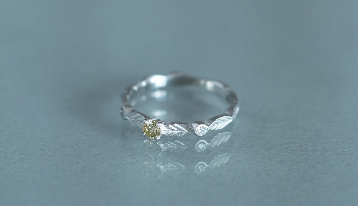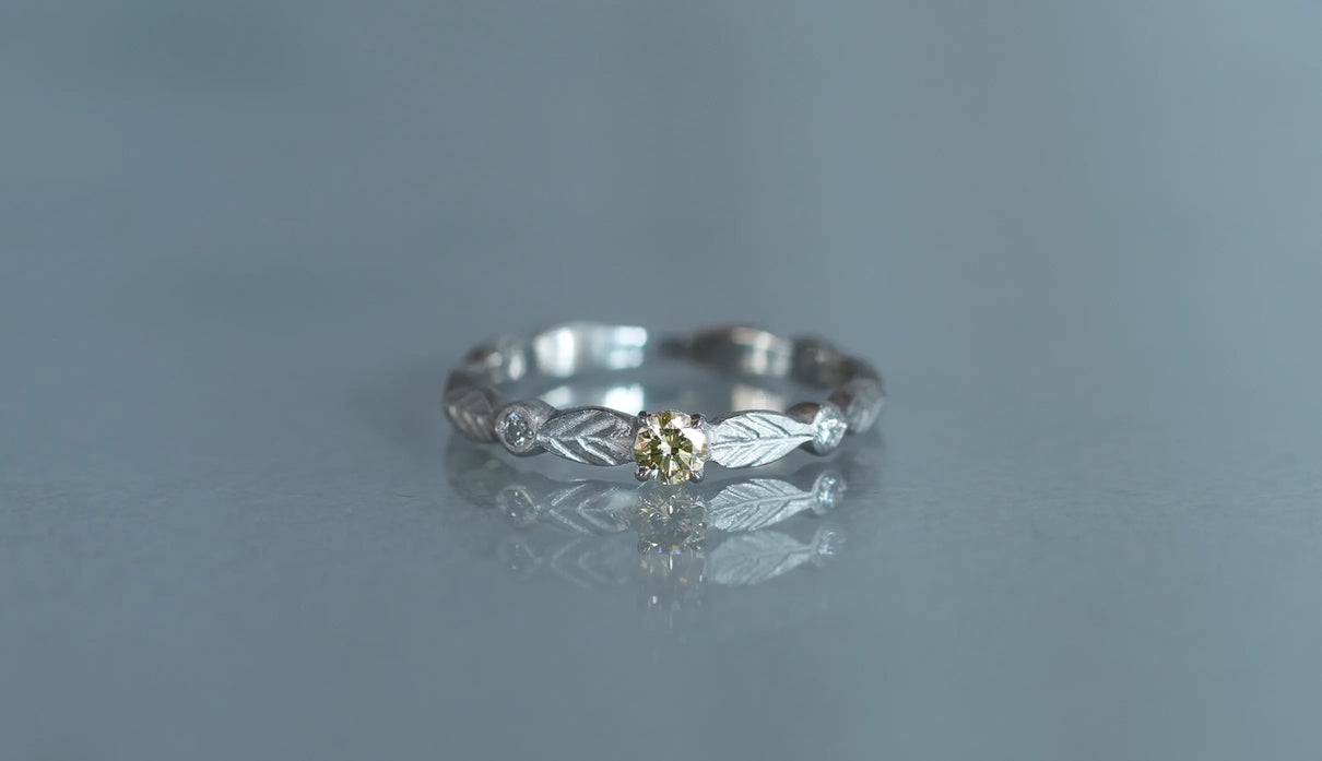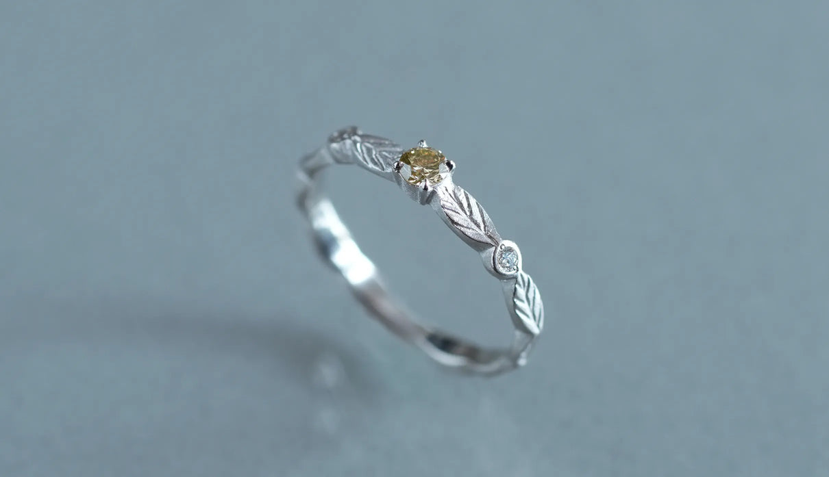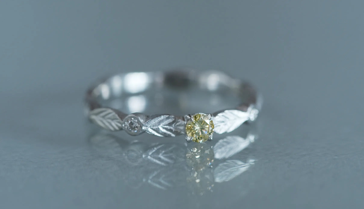 開花の季節を待つ小さな蕾をモチーフにした "Bloom" の中央に、照りの美しいイエローダイヤモンドを留めた一点もののリング。小粒ながらもささやかに彩りを放つイエローダイヤモンドとプラチナのコントラストをお愉しみいただけます。1枚1枚わずかに異なる表情の葉にはマットテクスチャーを施し、柔らかな印象に仕立てました。アーム左右の葉の間に留めた、小さな蕾に見立てた2石のメレダイヤモンドがさりげなくアクセントとなり、繊細ながらも手元を華やかに彩ります。大切な方への贈り物にも最適なリングです。