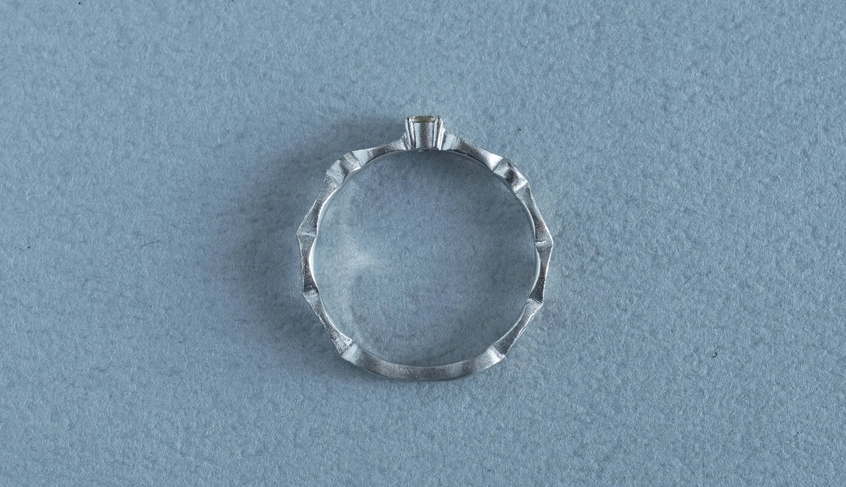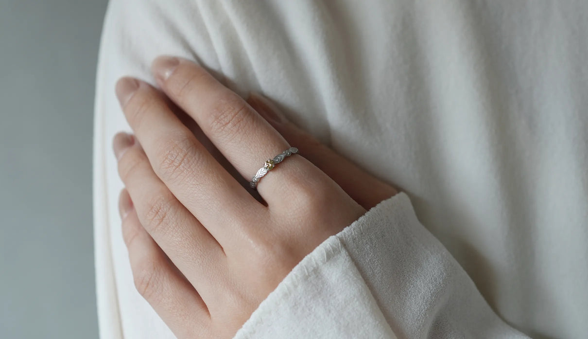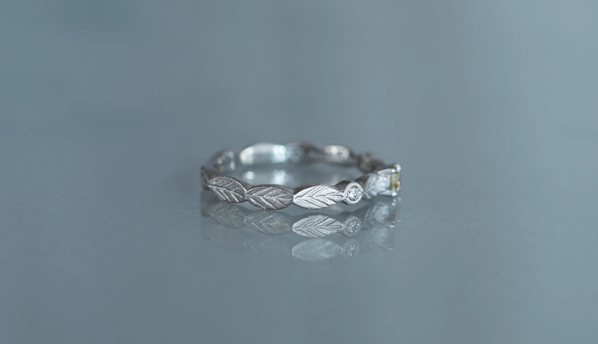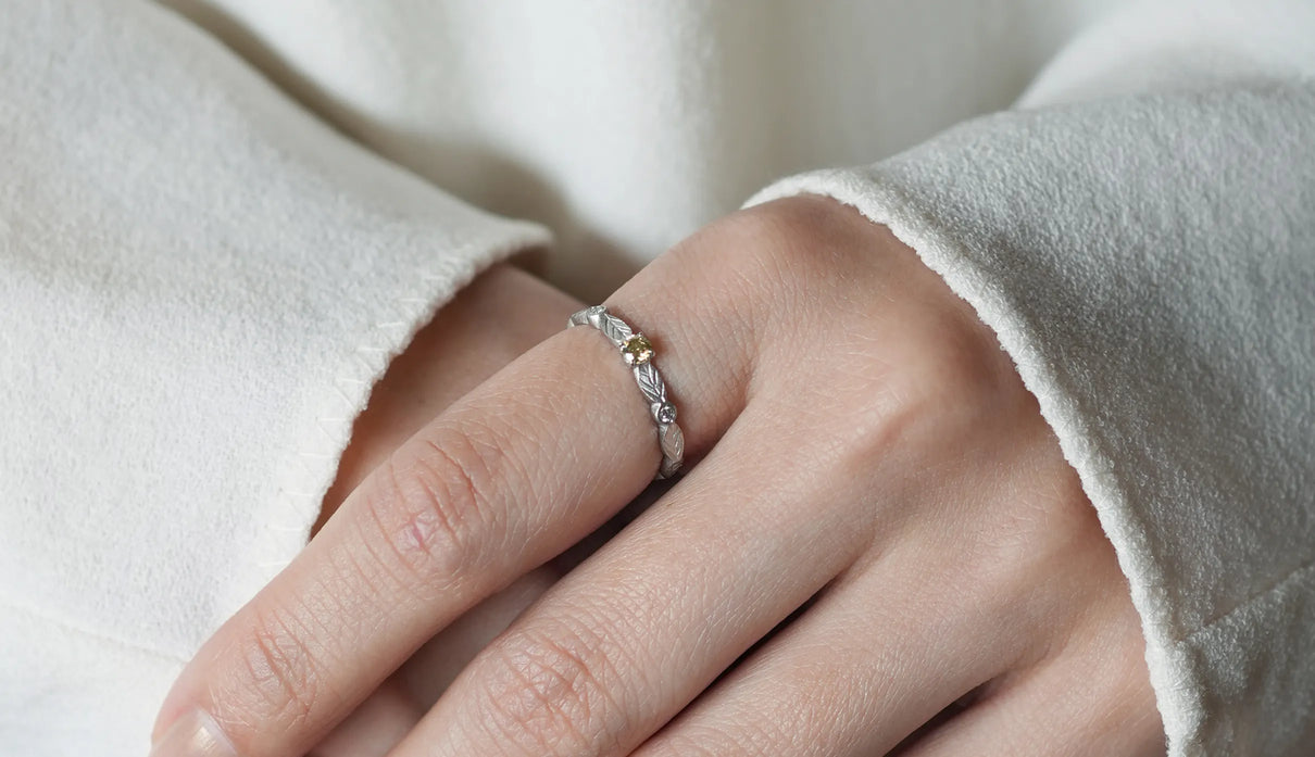 開花の季節を待つ小さな蕾をモチーフにした "Bloom" の中央に、照りの美しいイエローダイヤモンドを留めた一点もののリング。小粒ながらもささやかに彩りを放つイエローダイヤモンドとプラチナのコントラストをお愉しみいただけます。1枚1枚わずかに異なる表情の葉にはマットテクスチャーを施し、柔らかな印象に仕立てました。アーム左右の葉の間に留めた、小さな蕾に見立てた2石のメレダイヤモンドがさりげなくアクセントとなり、繊細ながらも手元を華やかに彩ります。大切な方への贈り物にも最適なリングです。