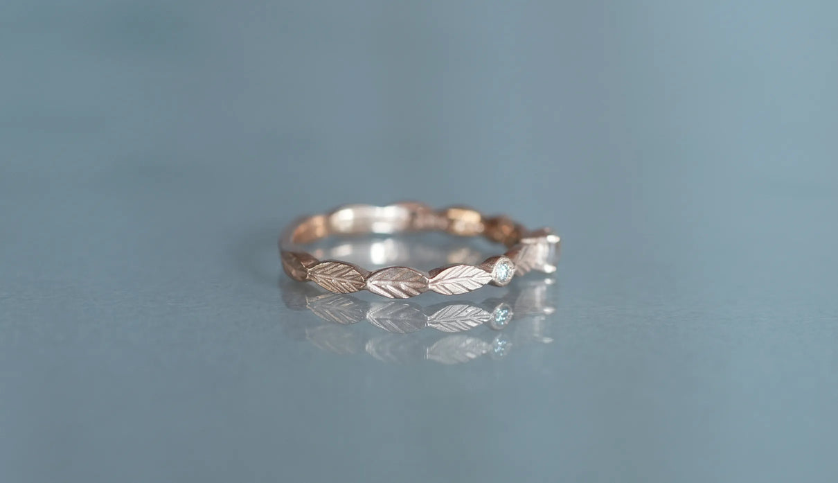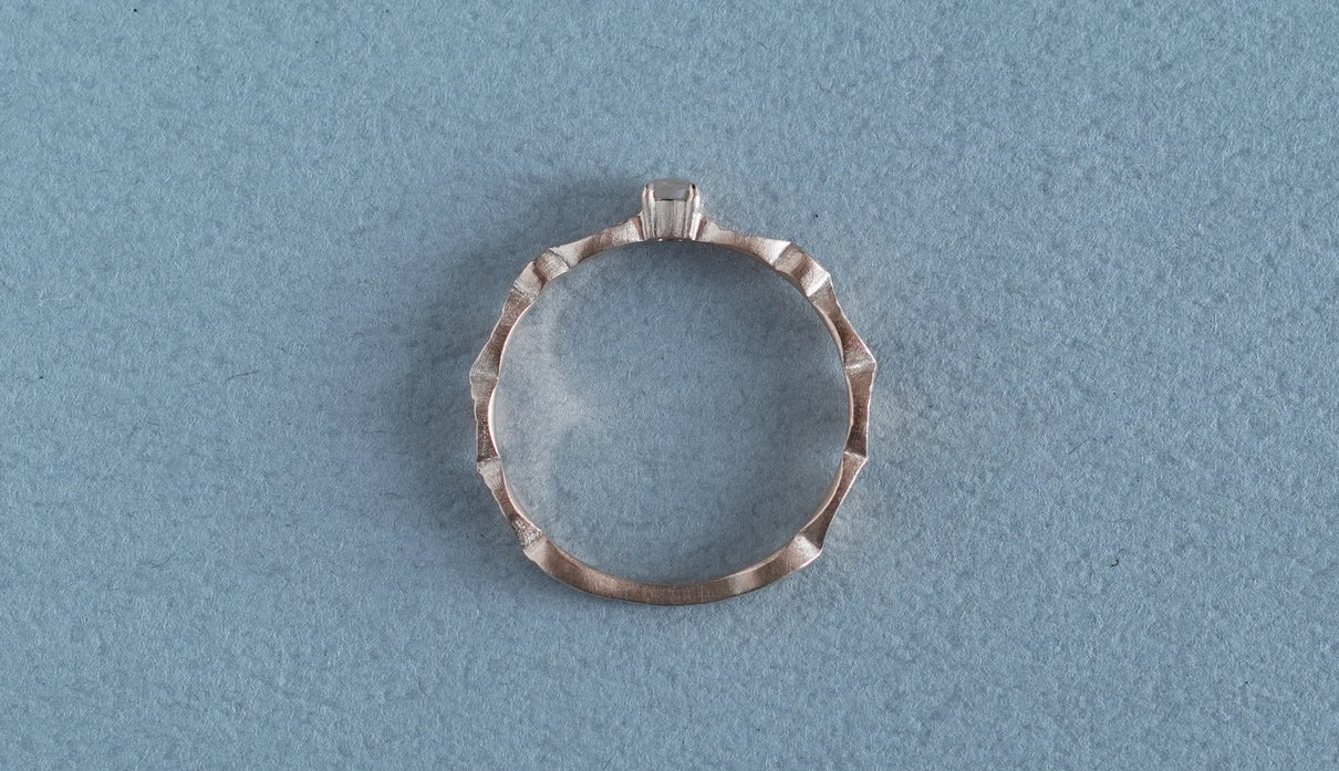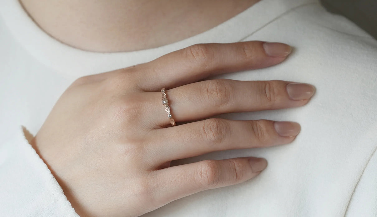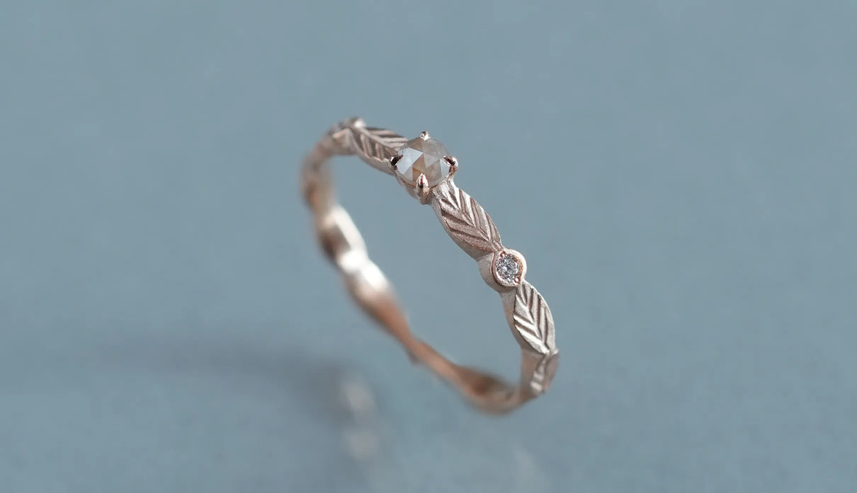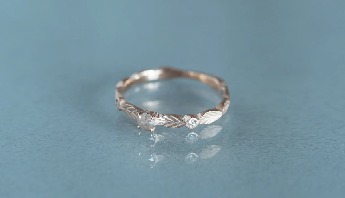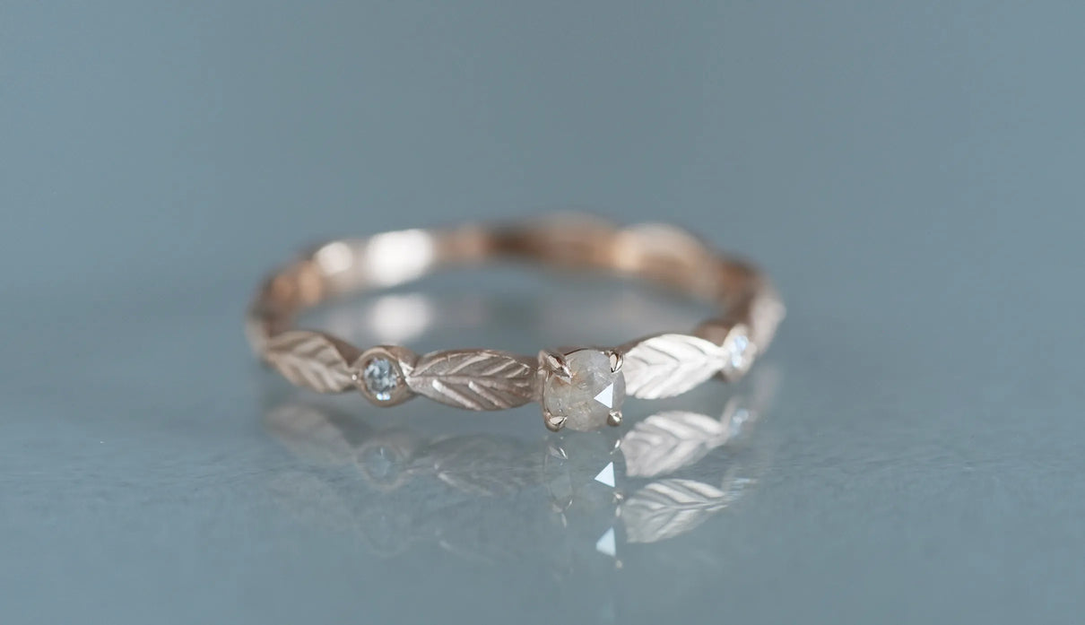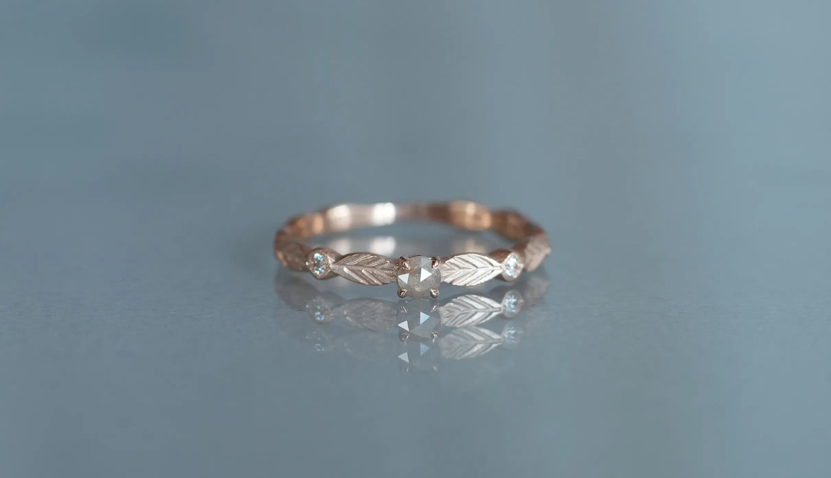 開花の季節を待つ小さな蕾をモチーフにした "Bloom" の中央に、やわらかなアイスカラーダイヤモンドを留めた一点もののリング。K18ピンクゴールドと溶け合うような、ほのかに色づくアイスカラーのダイヤモンドは、乳白色の中に赤褐色の内包物を秘め、淡く奥行きのある輝きを湛えています。1枚1枚わずかに異なる表情の葉にはマットテクスチャーを施し、柔らかな印象に仕立てました。アーム左右の葉の間に留めた、小さな蕾に見立てた2石のメレダイヤモンドがさりげなくアクセントとなり、繊細ながらも手元を華やかに彩ります。大切な方への贈り物にも最適な一点です。