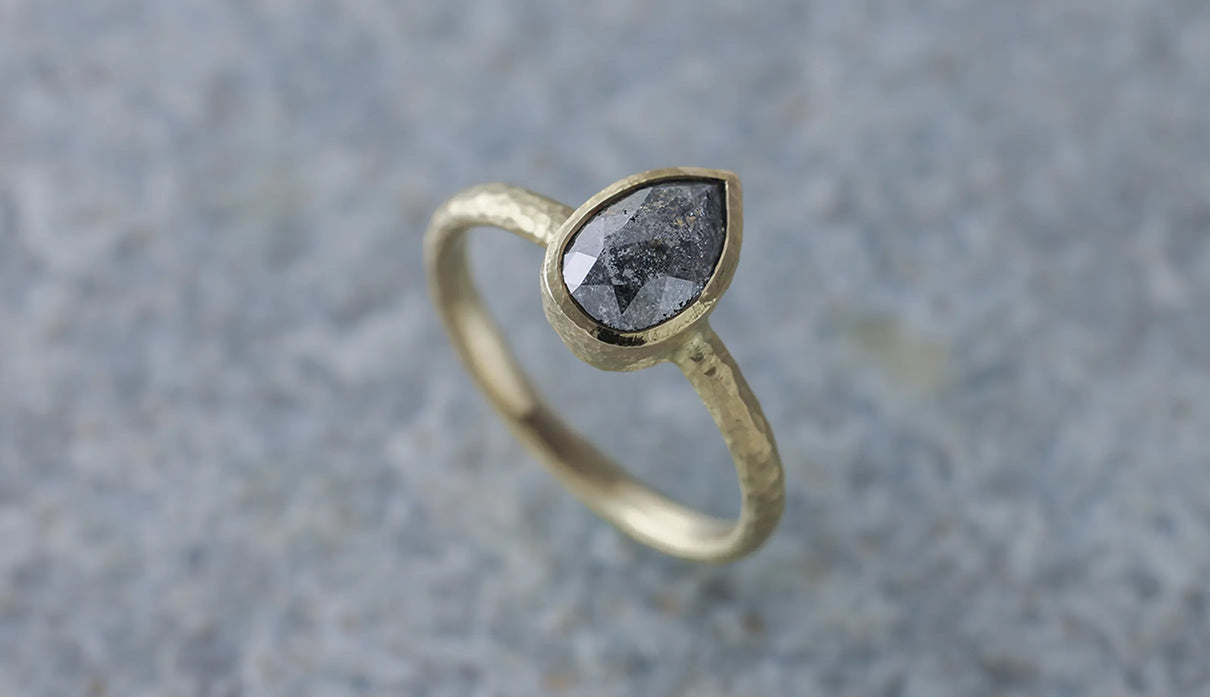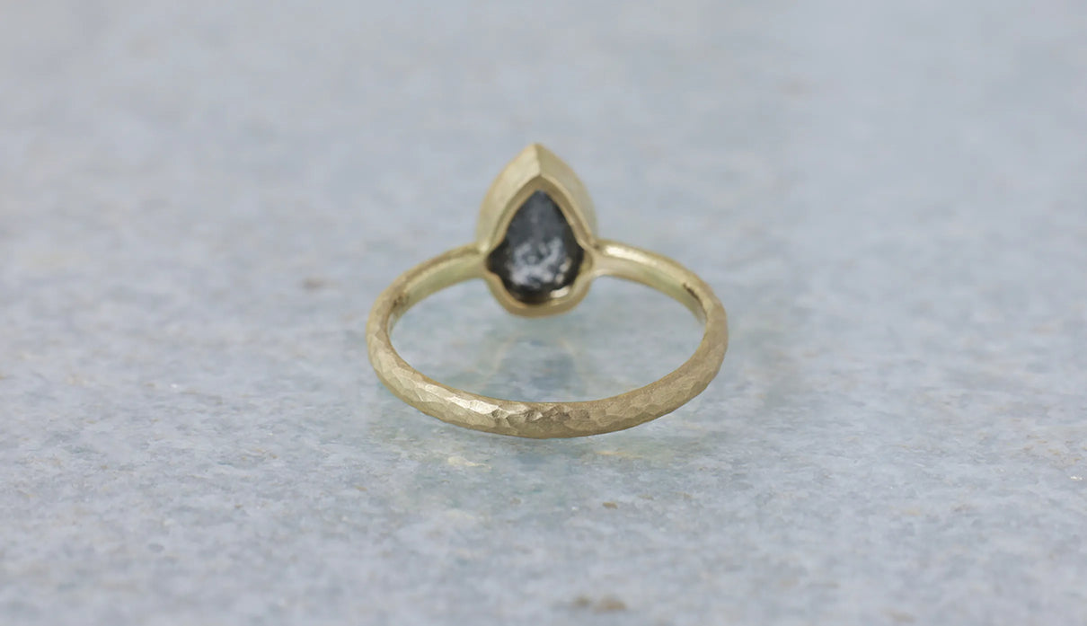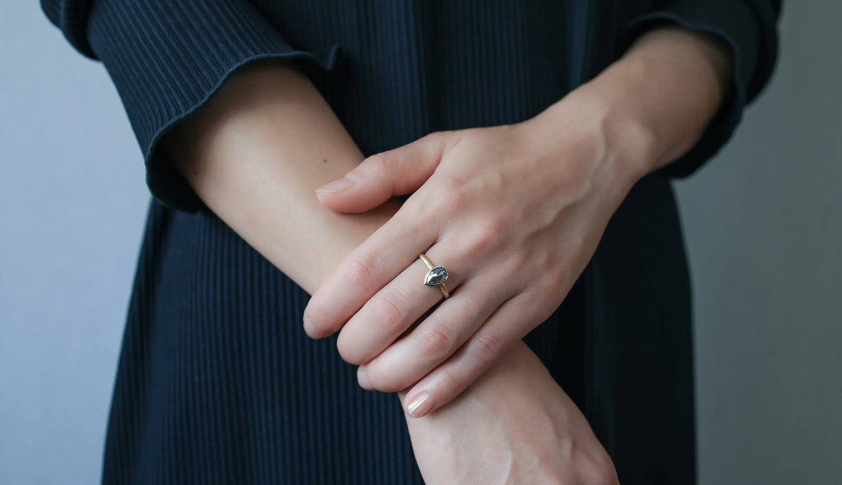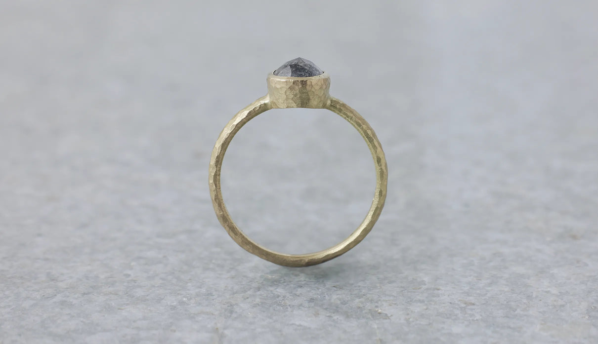 高密度の輝きを放つ、ローズカットのギャラクシーダイヤモンドで仕立てた一点もののリング。"銀河"と呼ばれるこのダイヤモンドは、宇宙空間を思わせる複雑なインクルージョンを内に抱き、光を密度高く留めています。石の内部に漂う微細な内包物の影や輝きが、角度によって静かに表情を変える様子は圧巻。リングは、石の存在を引き立てるように、装飾を最小限に抑えたバランスで構成しました。K18イエローゴールドの表面にほんの少しだけ槌目を加え、手仕事の揺らぎをそっと残しています。静けさの中に深い輝きを宿す、唯一無二の一点もののリングです。