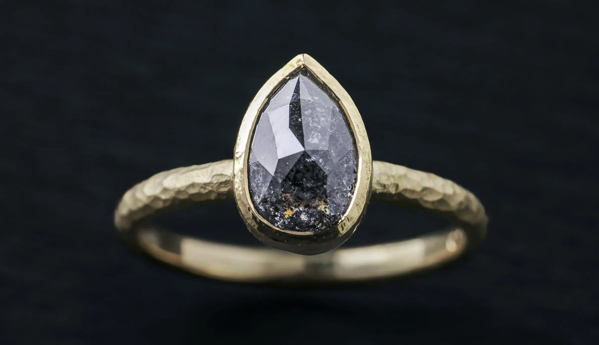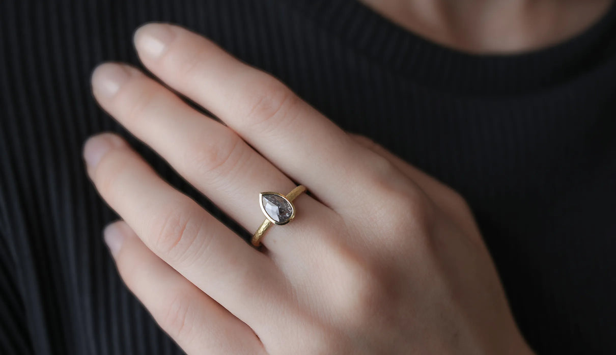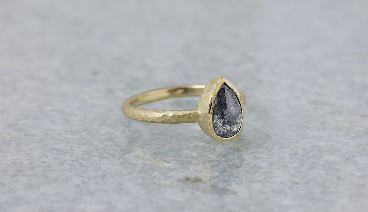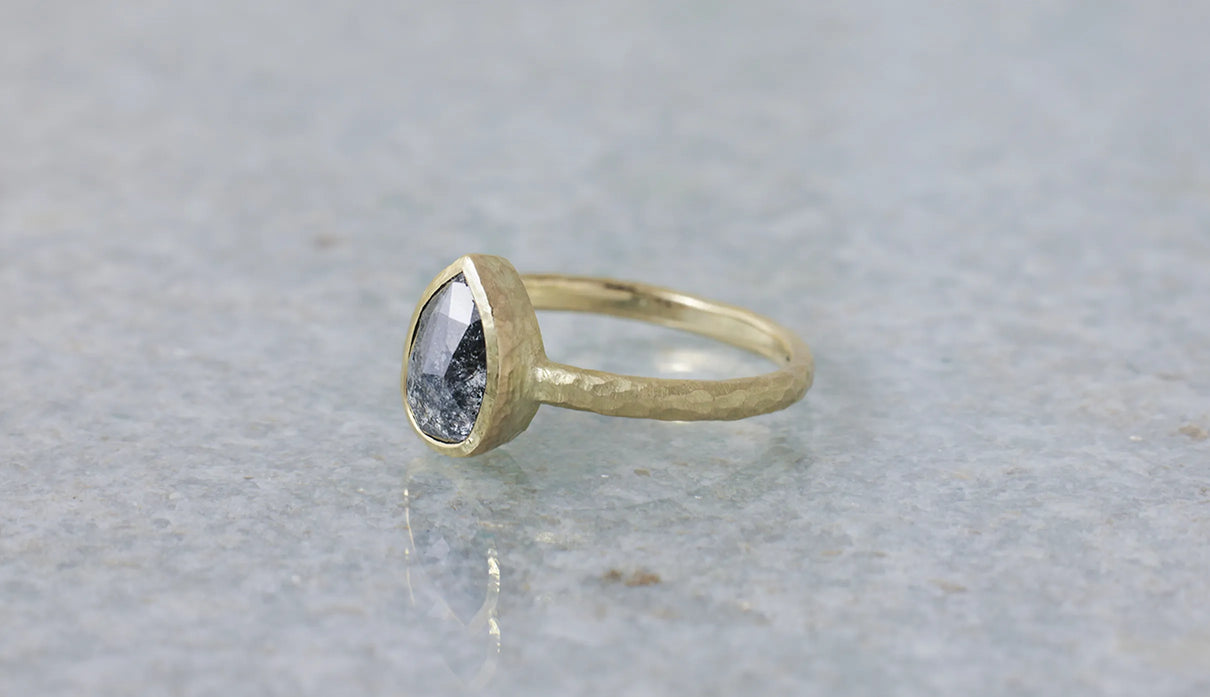 高密度の輝きを放つ、ローズカットのギャラクシーダイヤモンドで仕立てた一点もののリング。"銀河"と呼ばれるこのダイヤモンドは、宇宙空間を思わせる複雑なインクルージョンを内に抱き、光を密度高く留めています。石の内部に漂う微細な内包物の影や輝きが、角度によって静かに表情を変える様子は圧巻。リングは、石の存在を引き立てるように、装飾を最小限に抑えたバランスで構成しました。K18イエローゴールドの表面にほんの少しだけ槌目を加え、手仕事の揺らぎをそっと残しています。静けさの中に深い輝きを宿す、唯一無二の一点もののリングです。