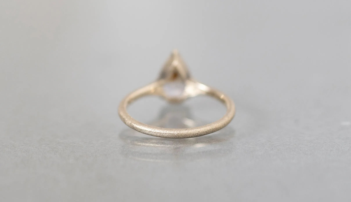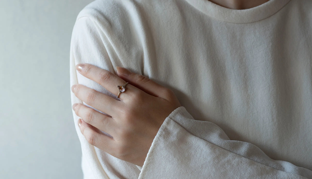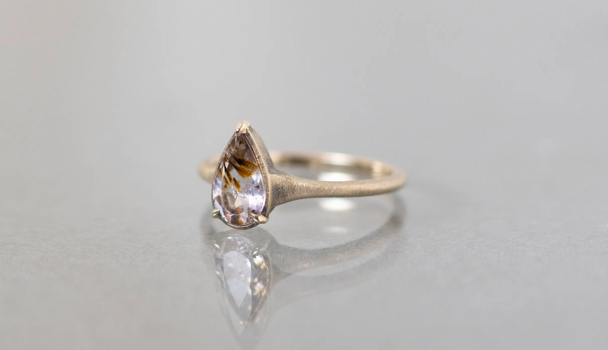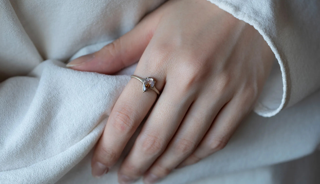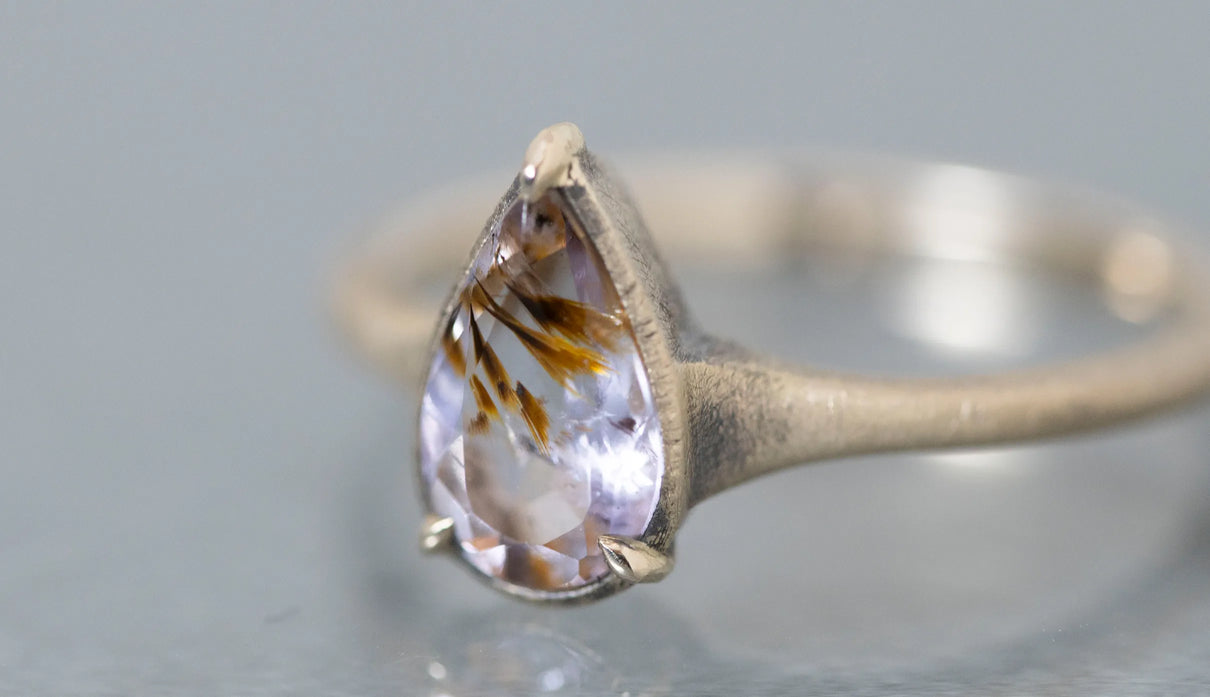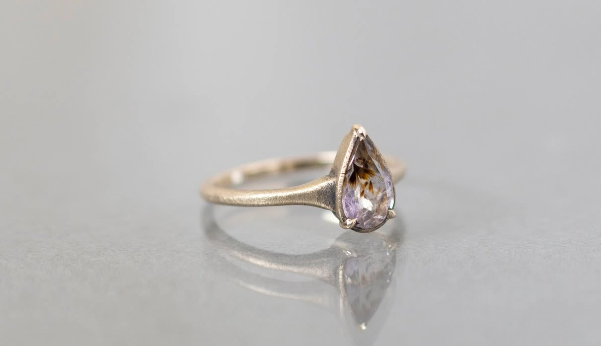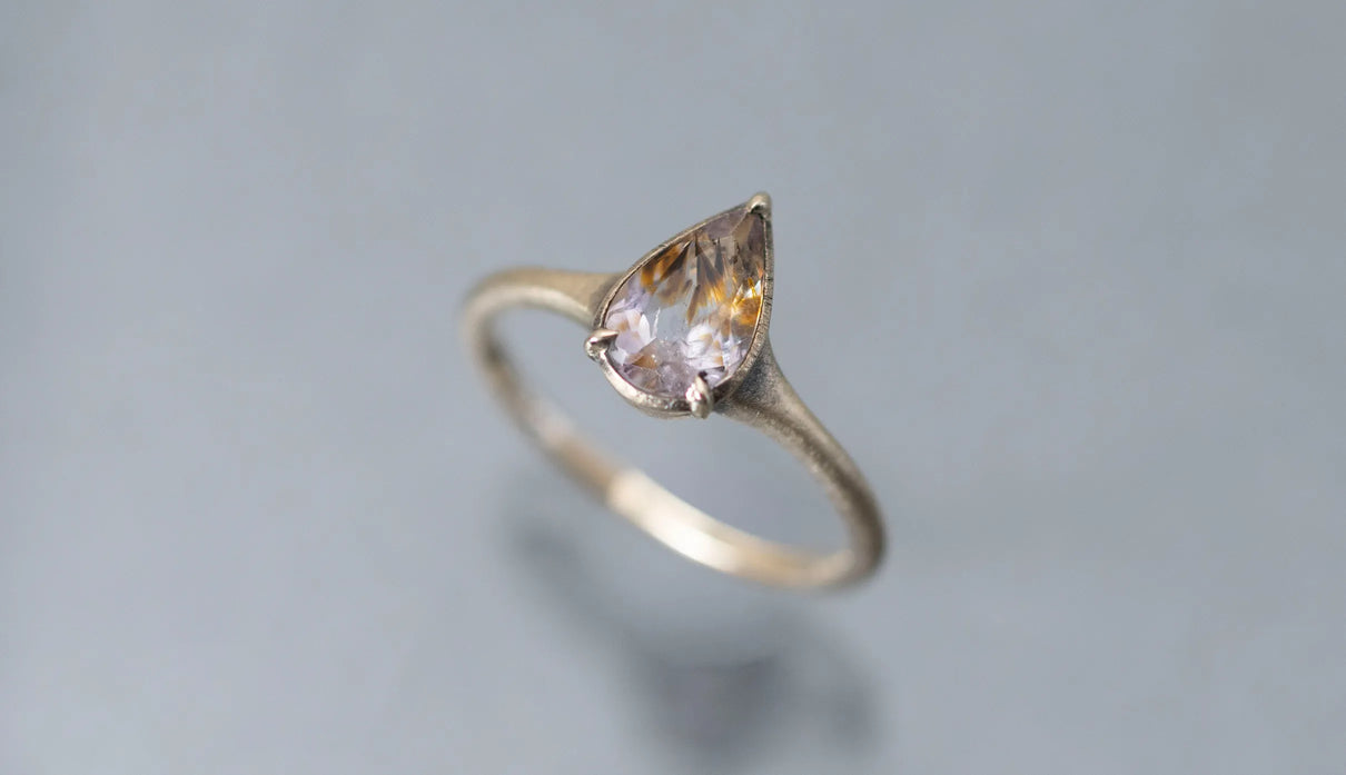 ゲーサイトインアメジストを留めた一点もののリング。淡い紫の中に、羽のように広がるオレンジブラウンの内包物が浮かび、小さな景色を閉じ込めたような奥行きを感じさせます。リングは、日常に自然と馴染むすっきりとした細身のラインで仕立てました。軽やかな印象のまま、指先に静かな個性を添えてくれる佇まいです。ささやかな光をそっと身にまとうように。日々に寄り添う、小さな景色のリングです。