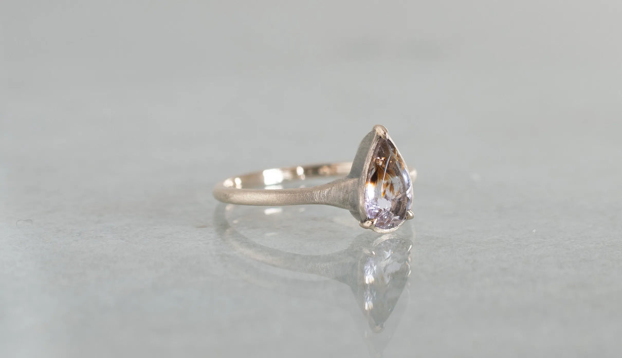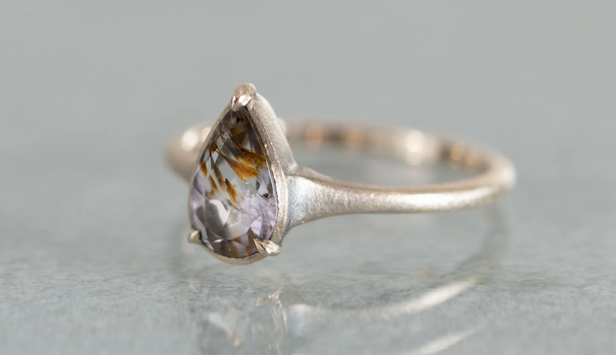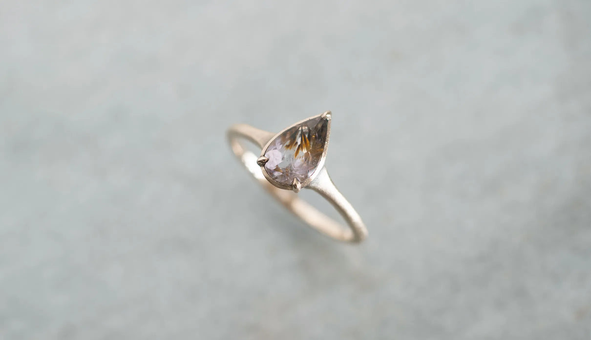ゲーサイトインアメジストを留めた一点もののリング。淡い紫の中に、羽のように広がるオレンジブラウンの内包物が浮かび、小さな景色を閉じ込めたような奥行きを感じさせます。リングは、日常に自然と馴染むすっきりとした細身のラインで仕立てました。軽やかな印象のまま、指先に静かな個性を添えてくれる佇まいです。ささやかな光をそっと身にまとうように。日々に寄り添う、小さな景色のリングです。2月の誕生石としても親しまれているアメジストは、2月生まれの方の特別なお守りとして贈りものにも最適なアイテムです。