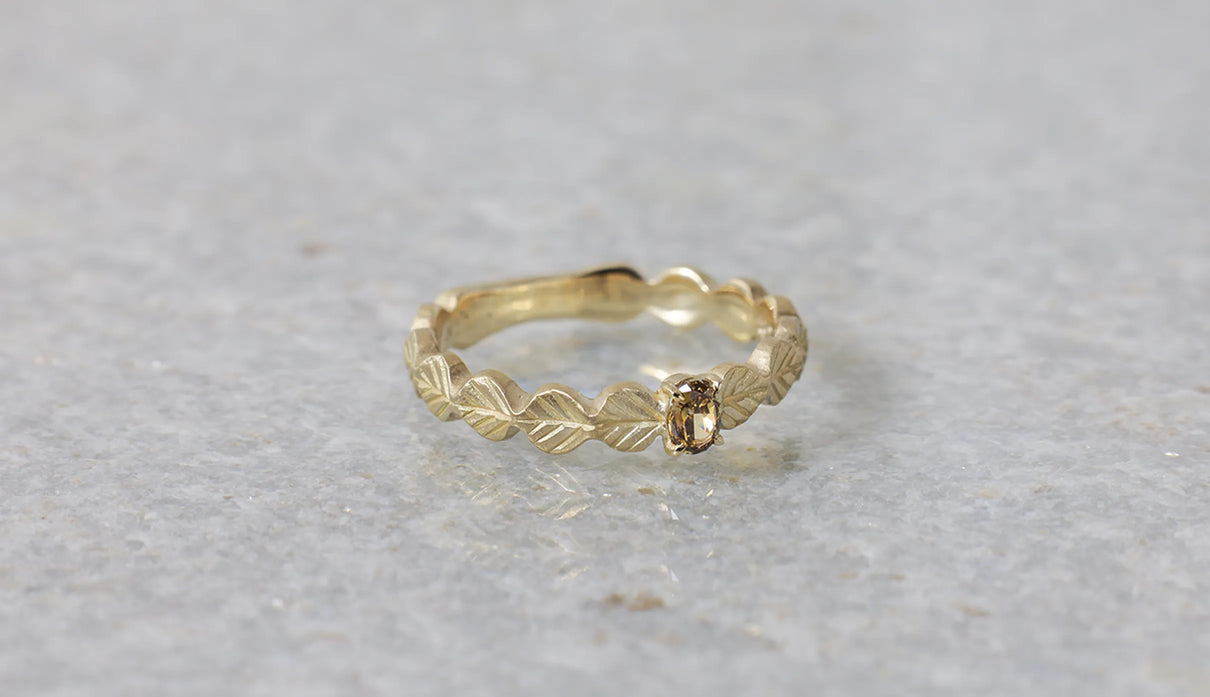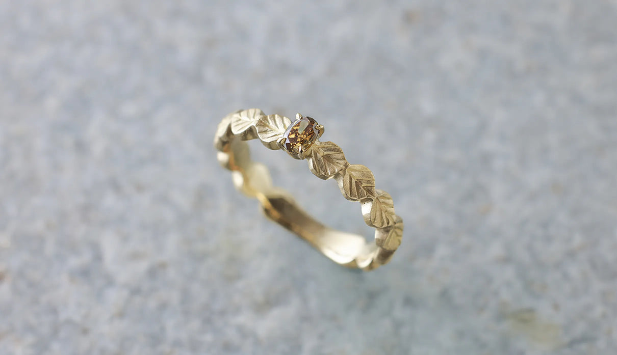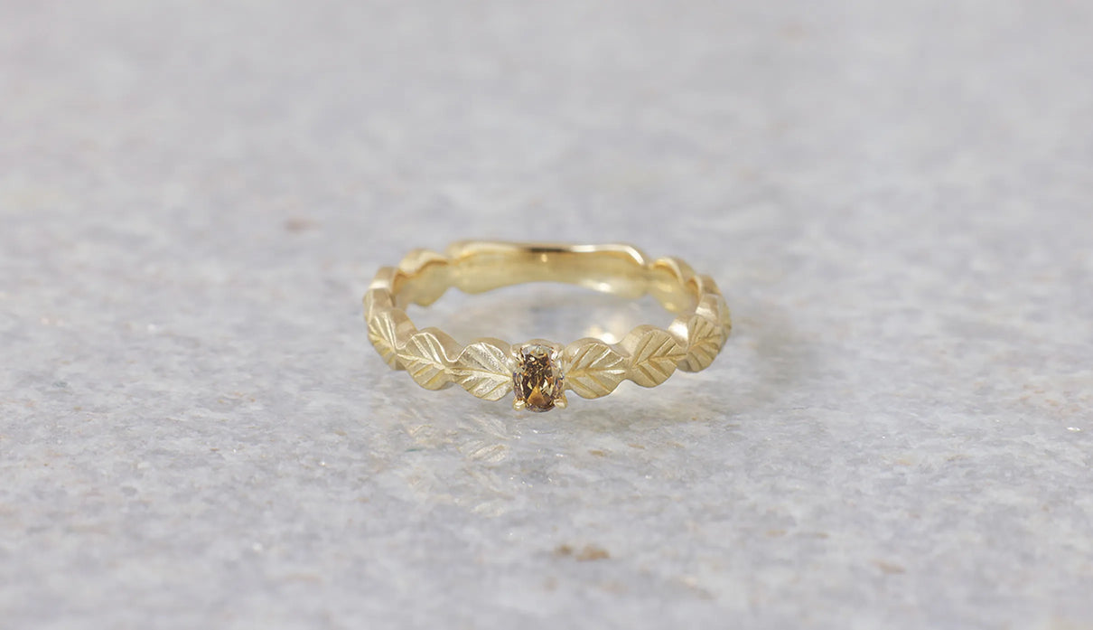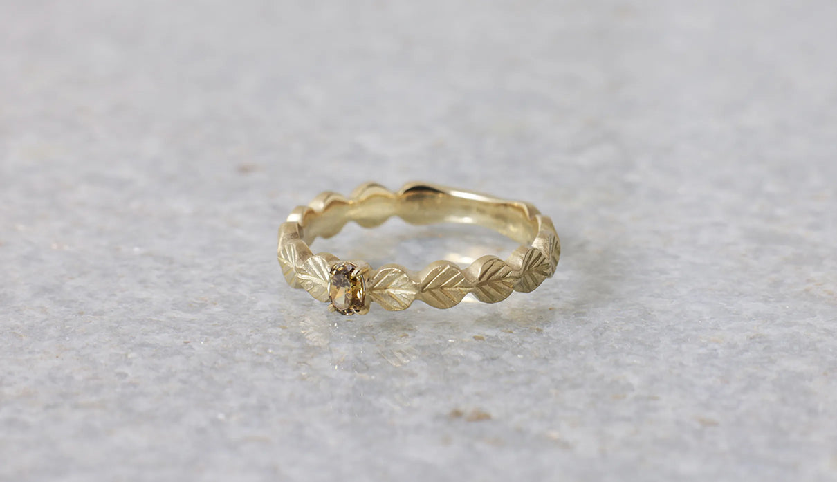 いくつも連なる葉っぱをモチーフに、1枚1枚わずかに異なる表情に遊び心を込めた 「Leaf」 シリーズの一点もののリング。アームはマットに仕立てた葉のサイズが小ぶりなタイプの Leaf little ベース。柔らかな光を宿した小さなイエローブラウンダイヤモンドは、透明度の高さゆえに、光が差し込むたび静かにきらめきを立ち上げます。小さなピースだからこそ際立つ凛とした透明感と、控えめながら品のある佇まい。指先に、やさしい輝きをそっと灯します。