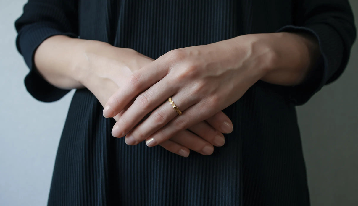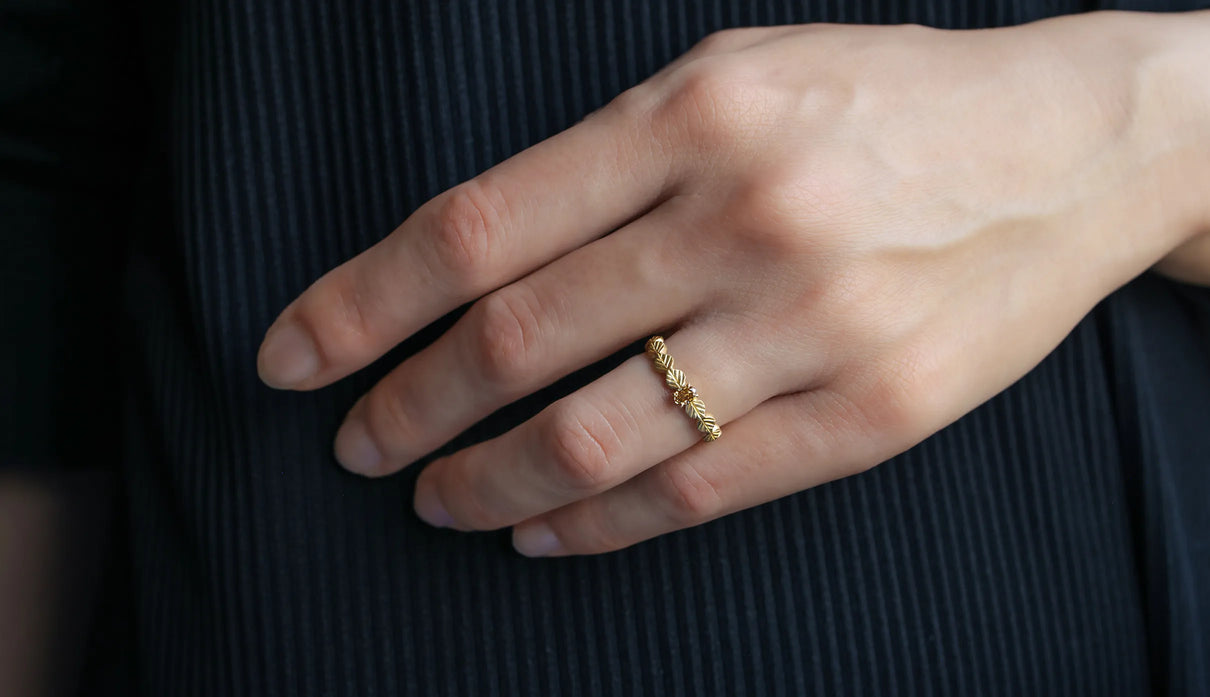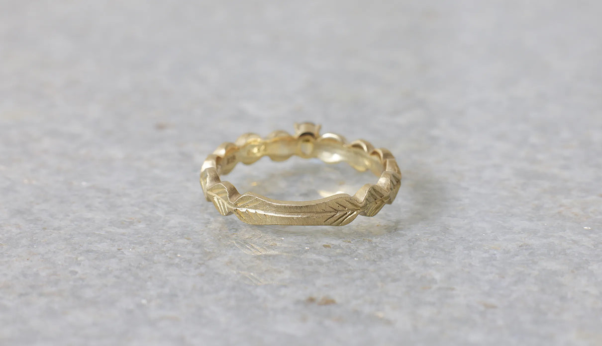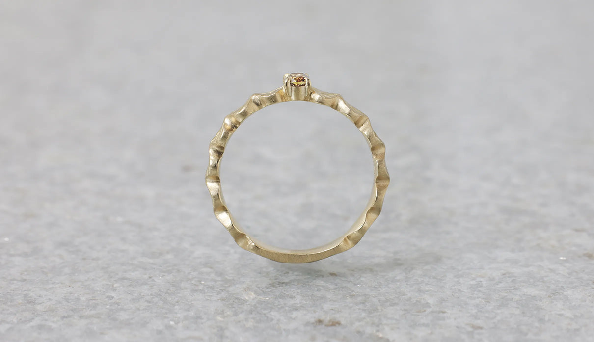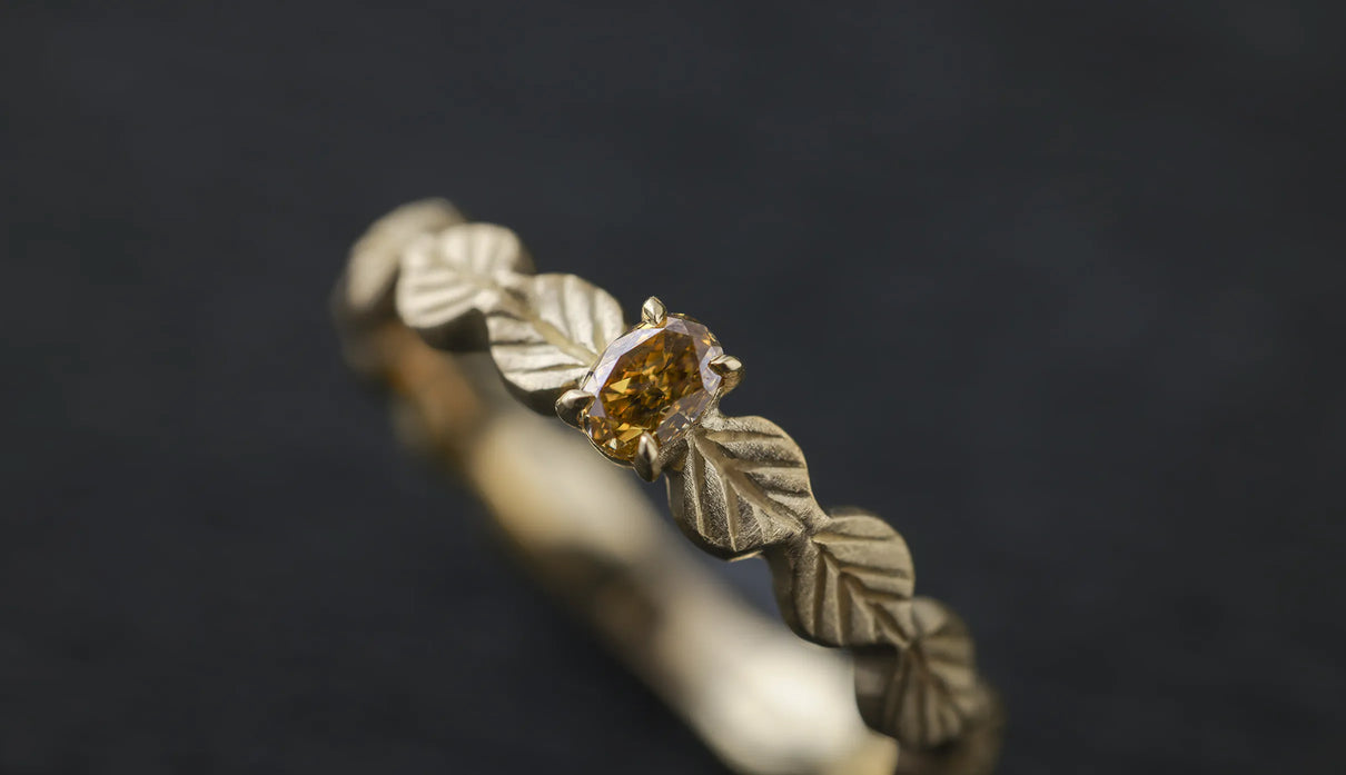 いくつも連なる葉っぱをモチーフに、1枚1枚わずかに異なる表情に遊び心を込めた 「Leaf」 シリーズの一点もののリング。アームはマットに仕立てた葉のサイズが小ぶりなタイプの Leaf little ベース。柔らかな光を宿した小さなイエローブラウンダイヤモンドは、透明度の高さゆえに、光が差し込むたび静かにきらめきを立ち上げます。小さなピースだからこそ際立つ凛とした透明感と、控えめながら品のある佇まい。指先に、やさしい輝きをそっと灯します。