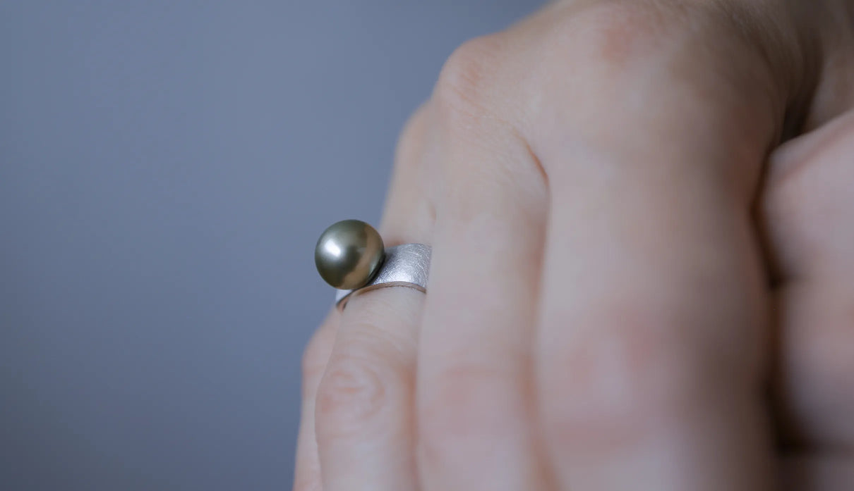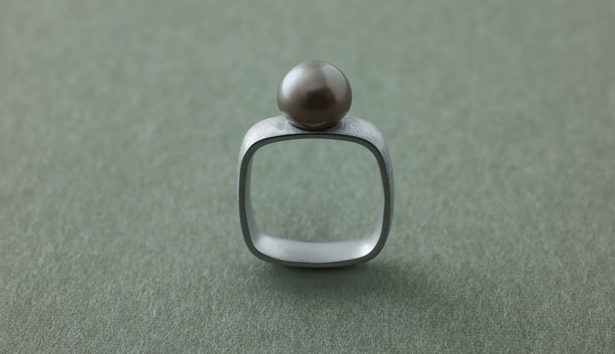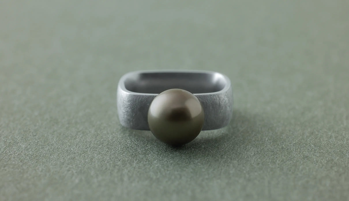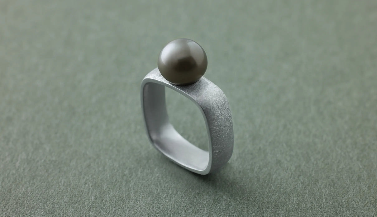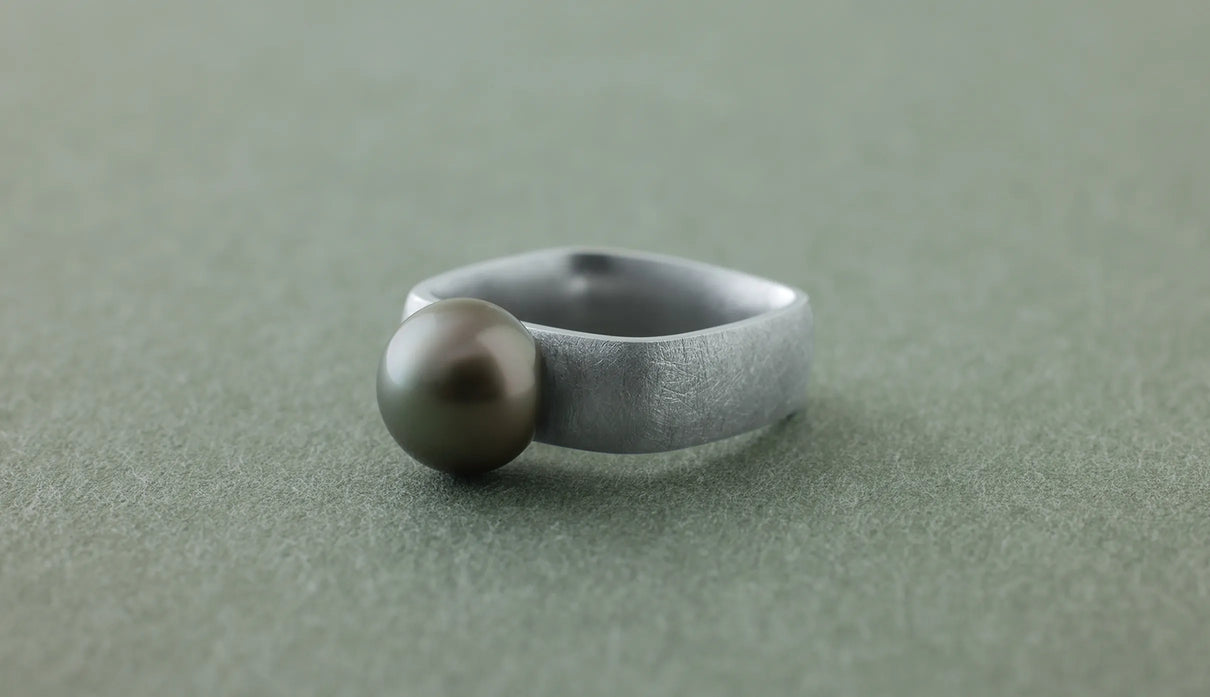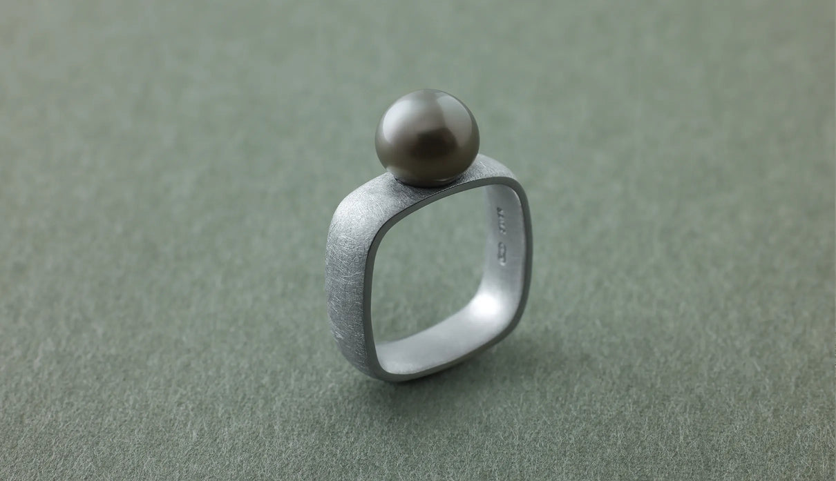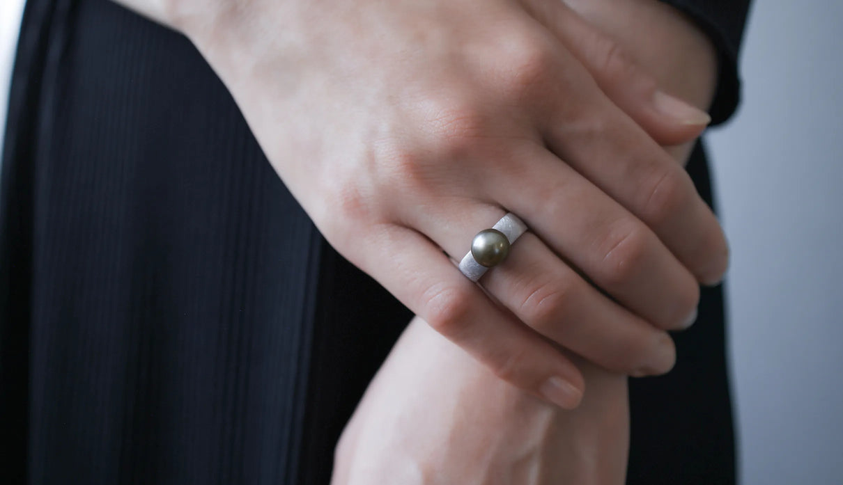 「三味線」の胴体のかたちから着想を得た「Syami」シリーズ。古来の楽器に宿る、やわらかく整った四角形は、まん丸ではない指の断面にそっと寄り添う自然なフォルムだと考えました。内側は丸みを持たせ、指を包むようにごくなめらかに仕上げています。長く身に着けていても心地よさが続くよう、厚みや角度のわずかな差にまで丁寧に目を配りました。淡いグレーのタヒチパールは、すこし横にひらいた柔らかな丸みがやさしい表情を生み出します。マットテクスチャーのシルバーリングと調和し、落ち着いた品の中にやわらかな温度を添えてくれる佇まいです。日々の装いにそっと寄り添い、やさしい気配を添えてくれる一点もののリングです。