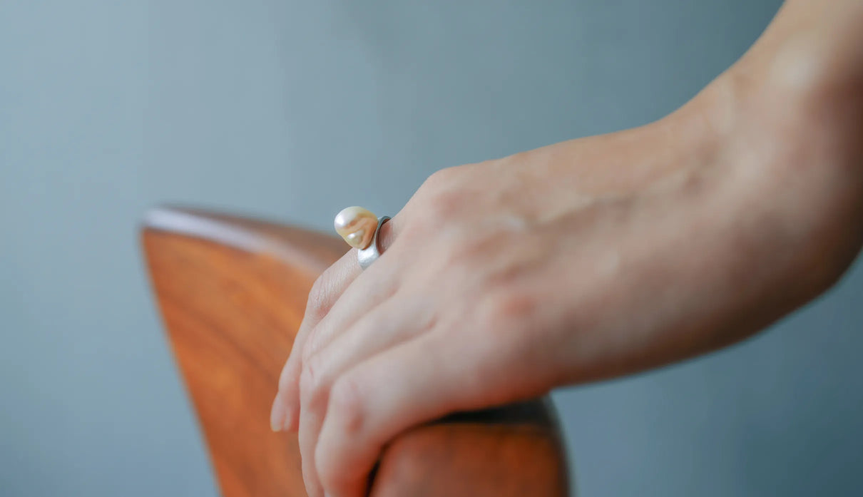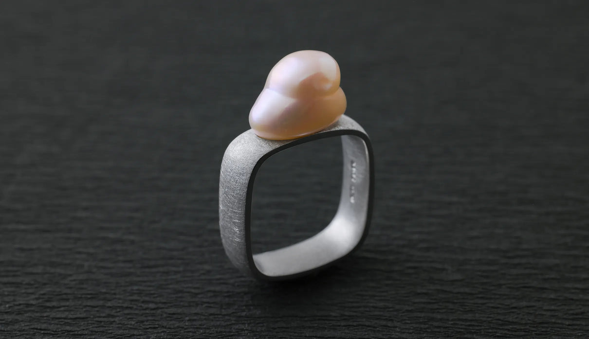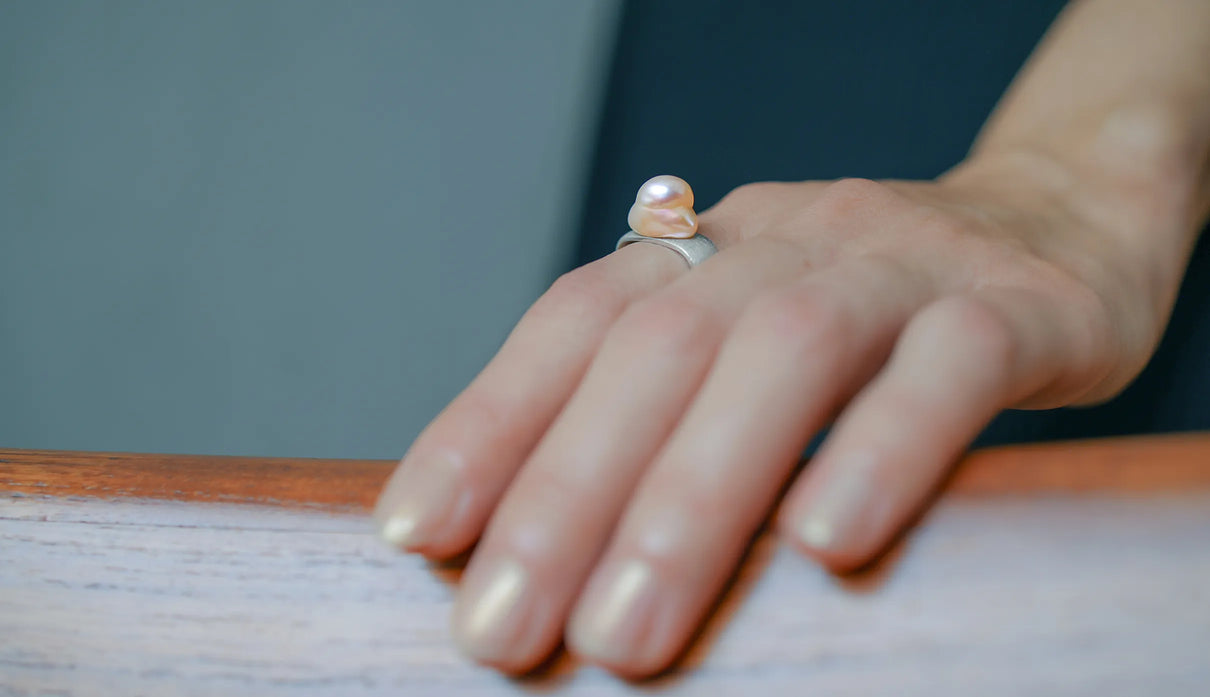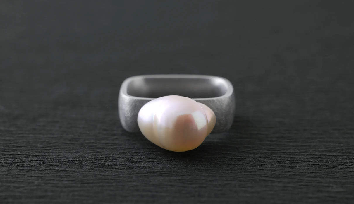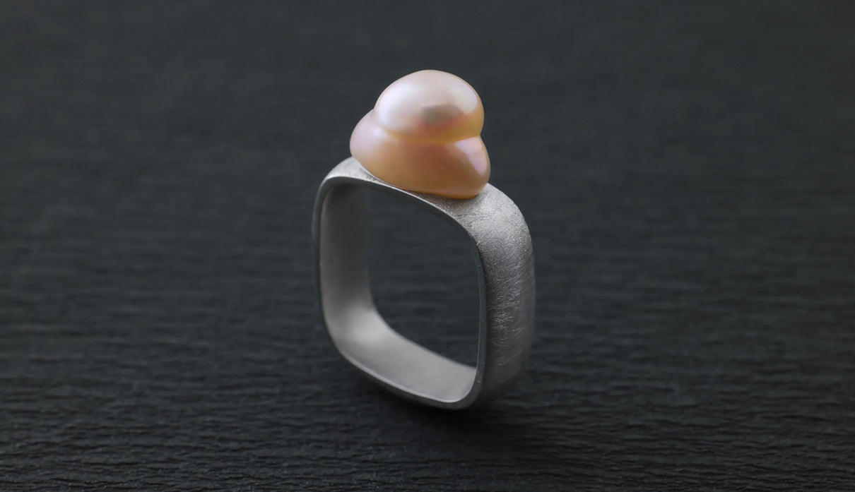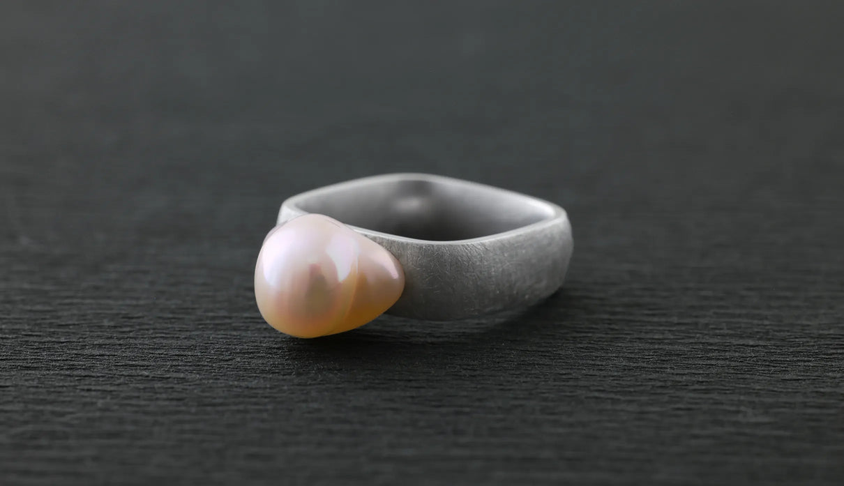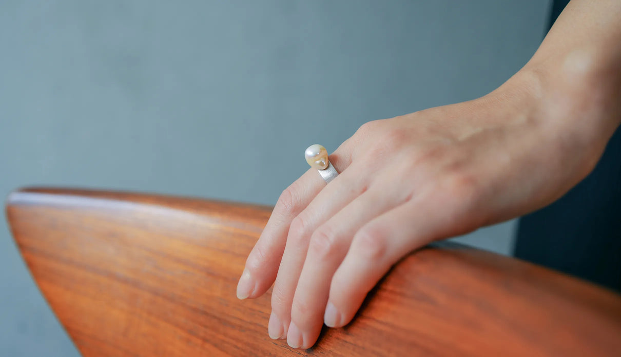 「三味線」の胴体のかたちから着想を得た「Syami」シリーズ。古来の楽器に宿る、やわらかく整った四角形は、まん丸ではない指の断面にそっと寄り添う自然なフォルムだと考えました。内側は丸みを持たせ、指を包むようにごくなめらかに仕上げています。長く身に着けていても心地よさが続くよう、厚みや角度のわずかな差にまで丁寧に目を配りました。淡いコーラルピンクのパールは、雲がふわりと形をとったような、たおやかなフォルムが印象的です。均整とは異なる自然なかたちが、マットテクスチャーのシルバーリングと重なり、柔らかさの中に静かな個性を宿します。日々の装いにそっと寄り添いながら、やさしい表情とさりげない存在感を添えてくれる一点もののリングです。