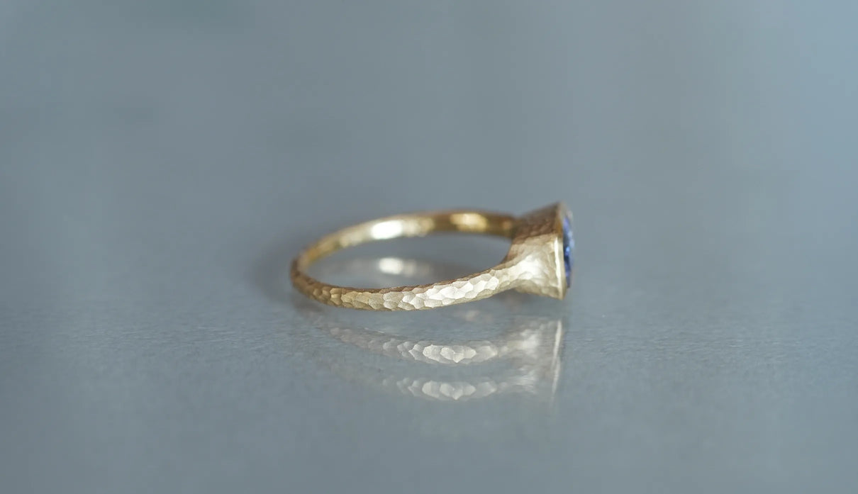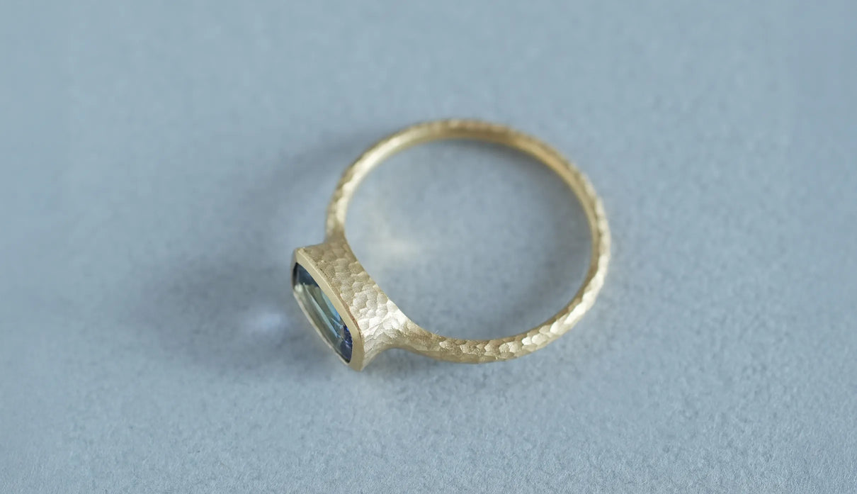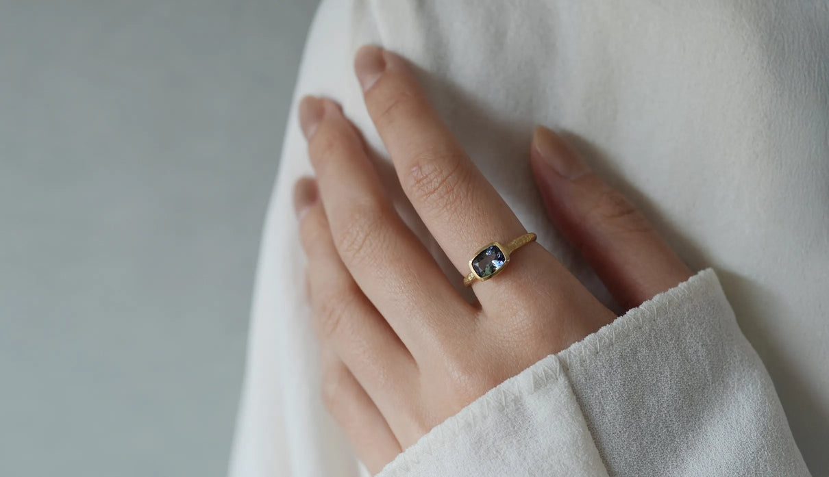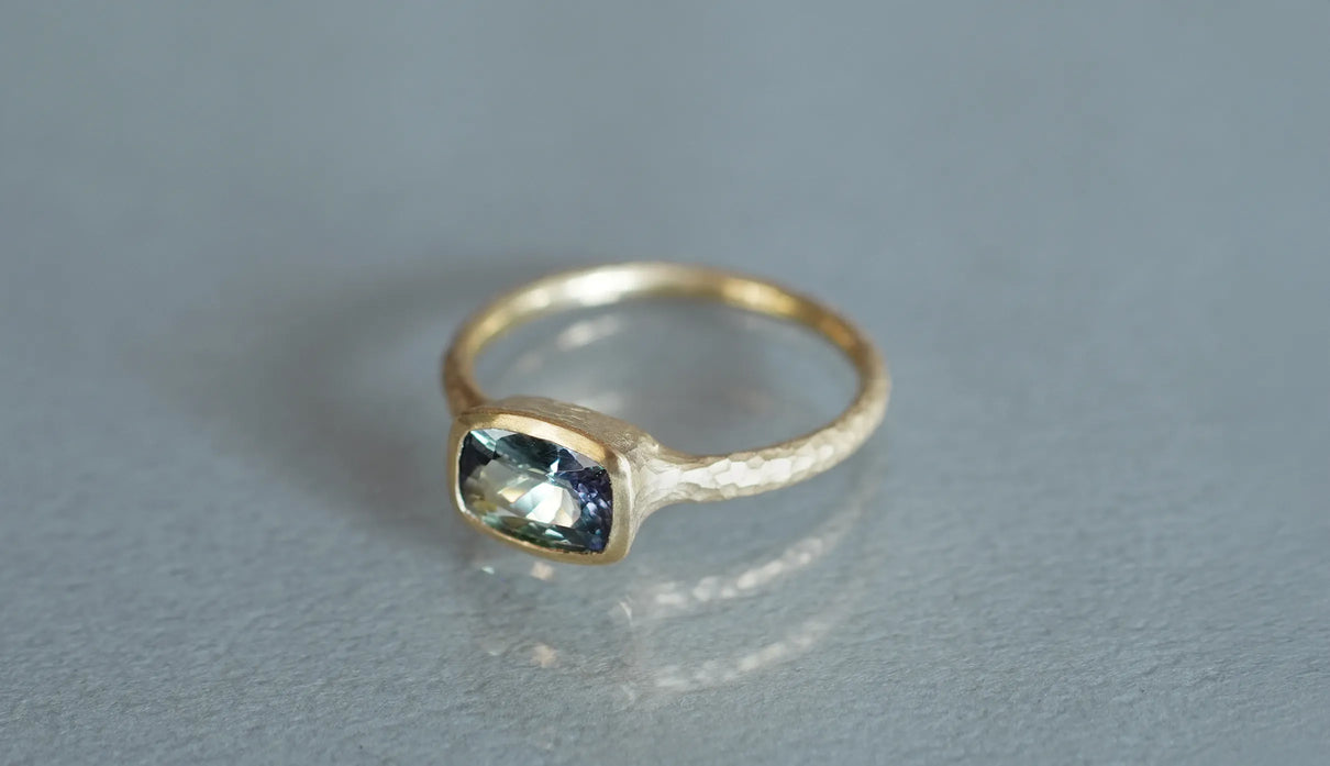 マーメイドタンザナイトで仕立てた一点もののリング。ライトパープル、ブルー、グリーンの三色が重なり合う希少なピースを「マーメイドタンザナイト」と呼びます。深い青をもつ一般的なタンザナイトとは異なり、何色とも言い難い、淡く澄んだ多色の揺らぎが静かに広がります。深い海の底に差し込む光のように、三色がゆるやかに呼応しながら表情を変え、その移ろいはどこか儚く、心の奥に静かな余白をもたらします。横長のクッションカットのピースを支える石座やアームのK18イエローゴールドには、不規則な槌目模様を施しました。指元で静かな華を添える特別なリング。12月の誕生石としても親しまれるタンザナイトは、12月生まれの方の特別なお守りとしてもおすすめです。