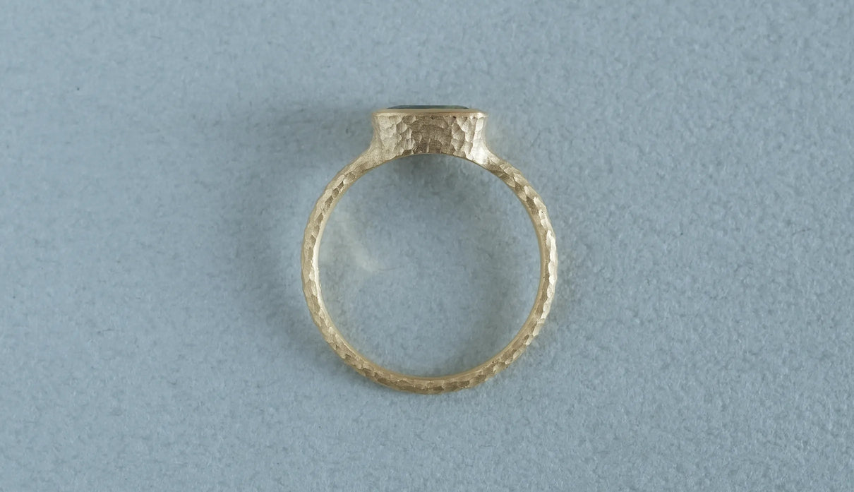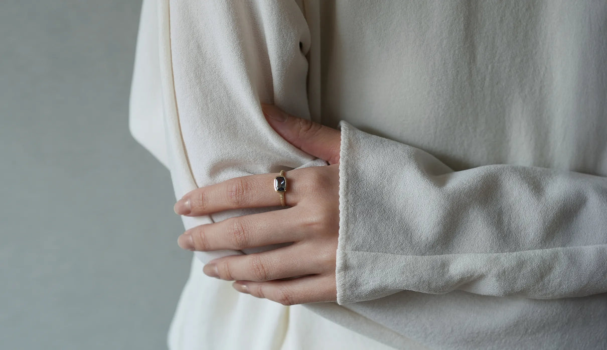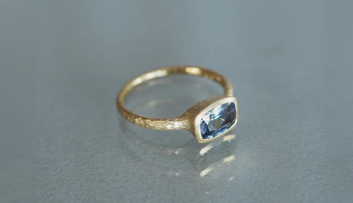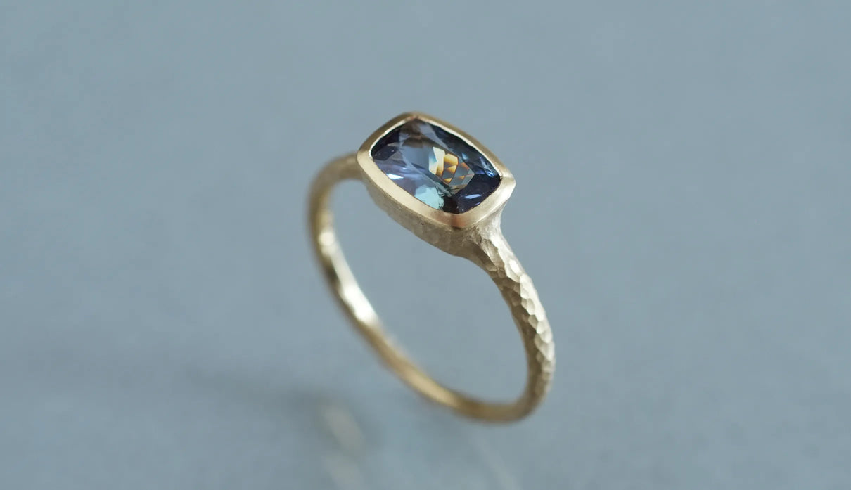 マーメイドタンザナイトで仕立てた一点もののリング。ライトパープル、ブルー、グリーンの三色が重なり合う希少なピースを「マーメイドタンザナイト」と呼びます。深い青をもつ一般的なタンザナイトとは異なり、何色とも言い難い、淡く澄んだ多色の揺らぎが静かに広がります。深い海の底に差し込む光のように、三色がゆるやかに呼応しながら表情を変え、その移ろいはどこか儚く、心の奥に静かな余白をもたらします。横長のクッションカットのピースを支える石座やアームのK18イエローゴールドには、不規則な槌目模様を施しました。指元で静かな華を添える特別なリング。12月の誕生石としても親しまれるタンザナイトは、12月生まれの方の特別なお守りとしてもおすすめです。