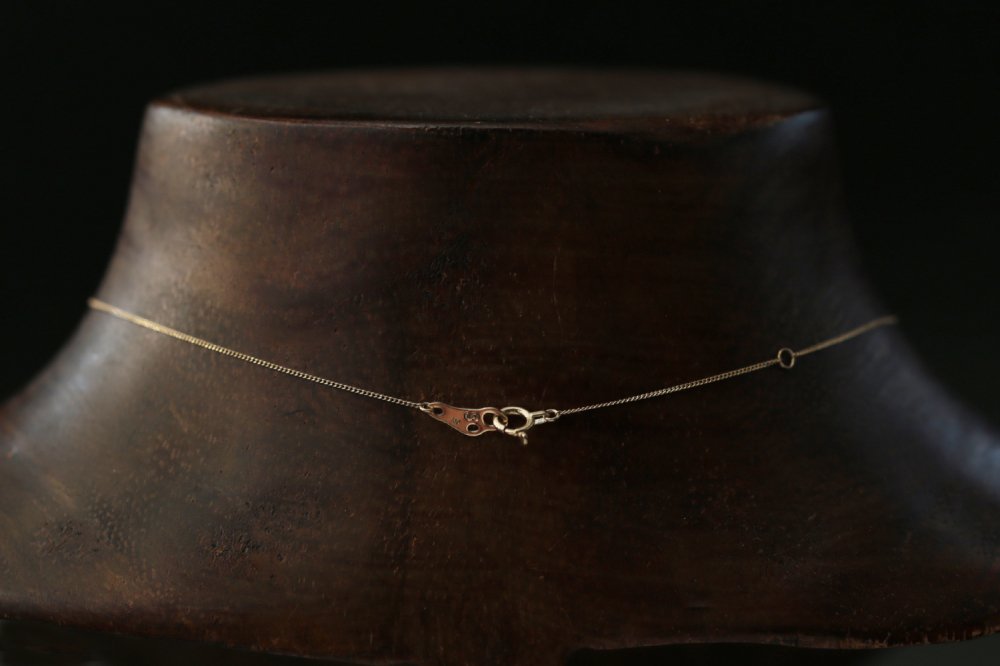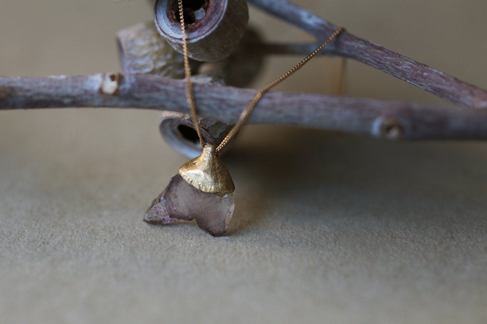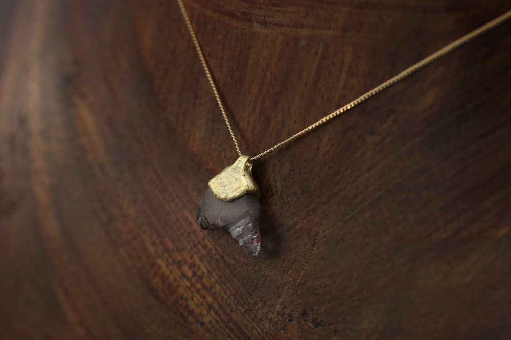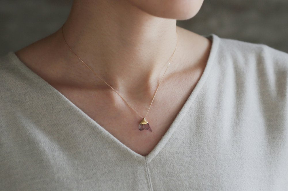 日本式双晶と呼ばれる水晶を用いたネックレス。アシンメトリーな形にほのかに染まる紫色が美しく、秩序ある自然の筋が刻まれた双晶にどんぐりのようなK18ゴールドの笠をかぶせて仕立てました。2つとして同じもののない個性豊かな天然の色形のままの水晶は、奥ゆかしい存在感で淑やかに胸元を装います。