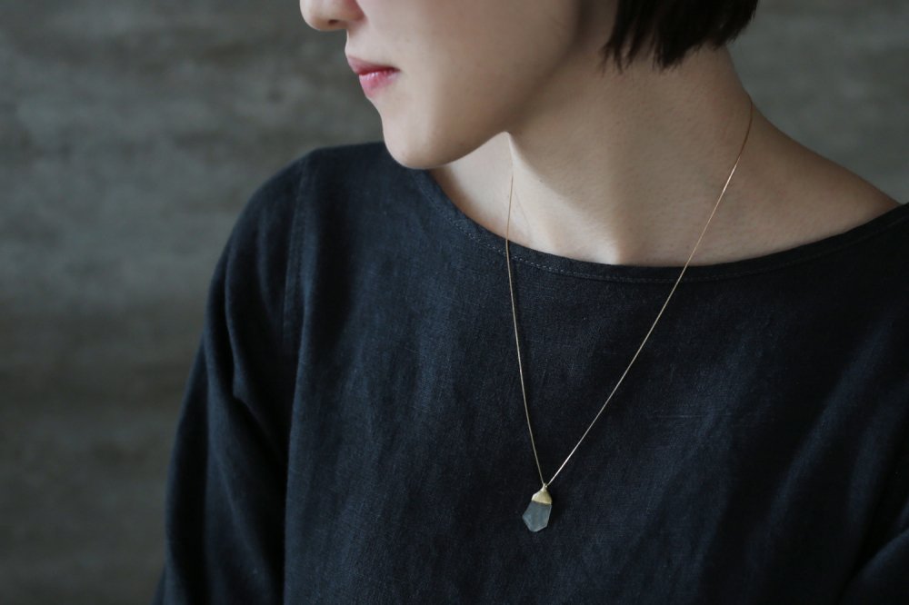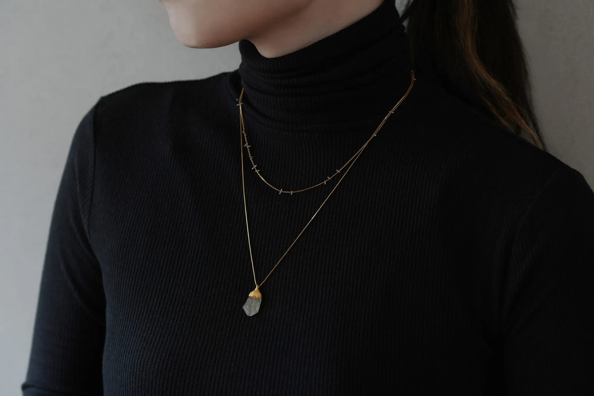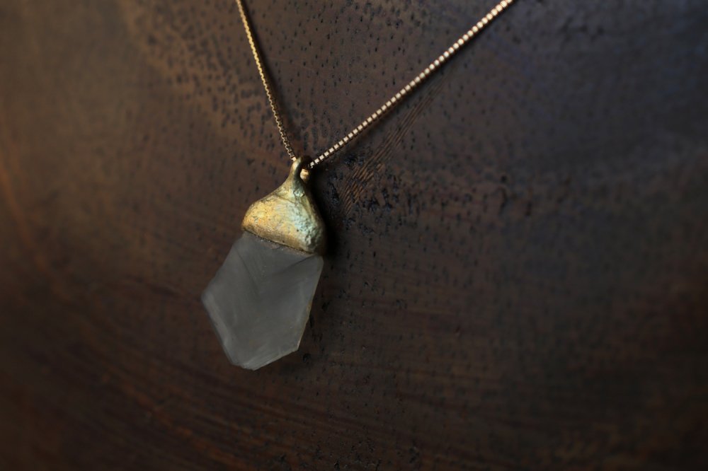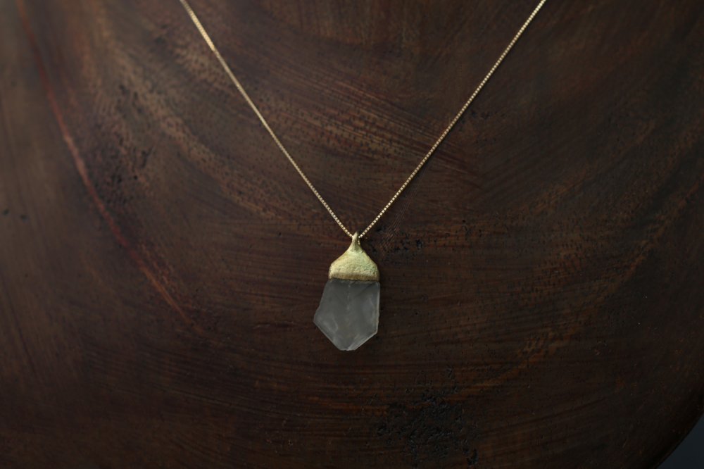日本式双晶と呼ばれる水晶を用いたネックレス。ほのかな白濁色に、秩序ある自然の筋が刻まれた不思議な表情の双晶にどんぐりのようなK18ゴールドの笠をかぶせて仕立てました。2つとして同じもののない個性豊かな天然の色形のままの水晶は、奥ゆかしい存在感で胸元を装います。