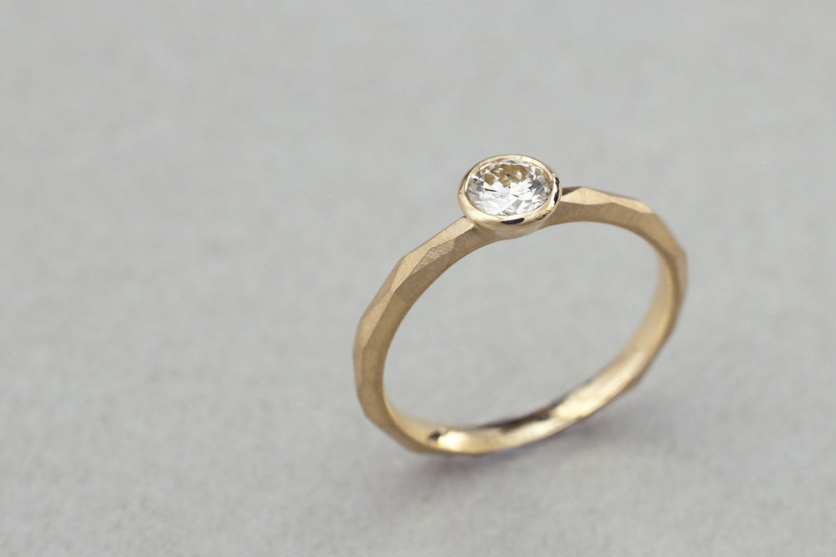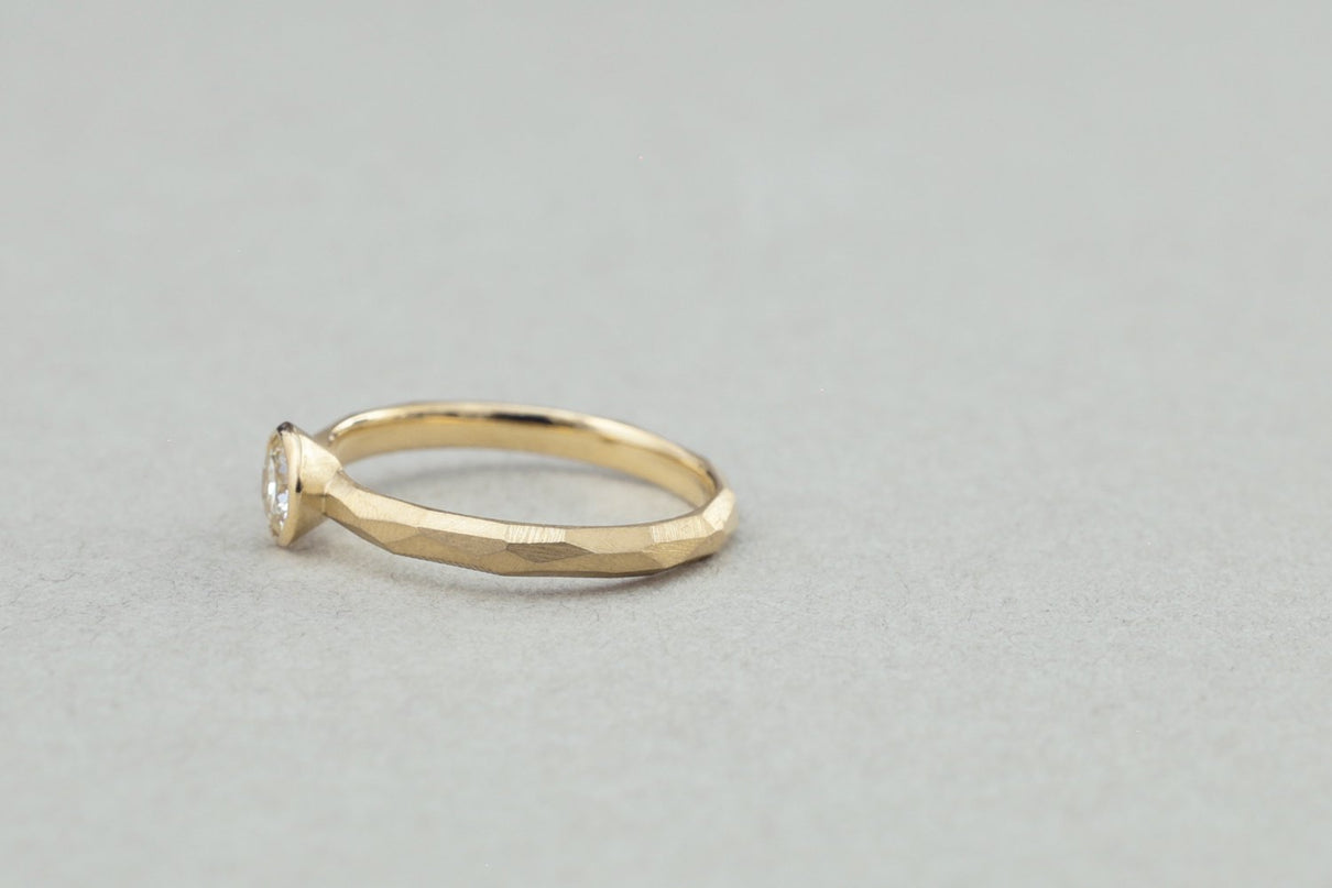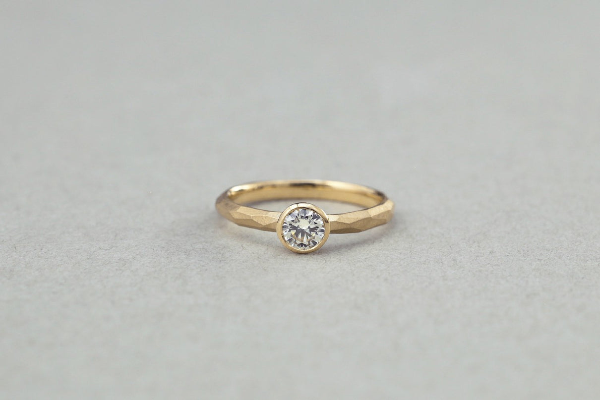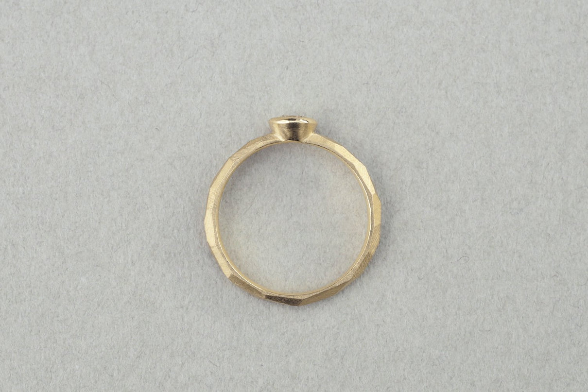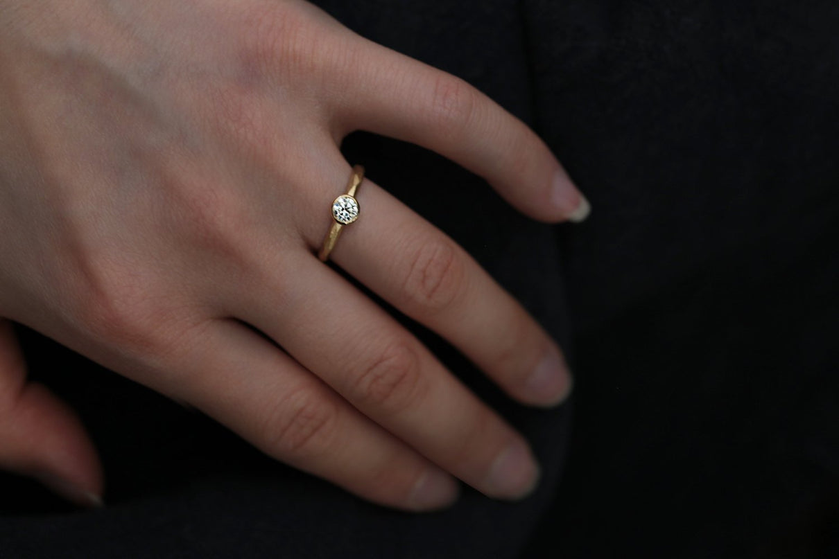 0.3ct upのダイヤモンドを留めたダイヤモンドリング。塊から荒く削りだしたような幾つもの面と面が織りなすゴールドの表情と、煌めくブリリアントカットダイヤモンドの側面をぐるりと一周取り囲むように留めた覆輪留めがアクセントとなっています。質の高い、選りすぐりのダイヤモンドならではの輝きは、エンゲージリングや記念日の特別な贈り物としてもお勧めのアイテムです。