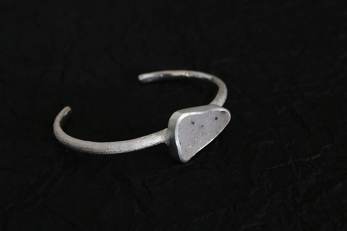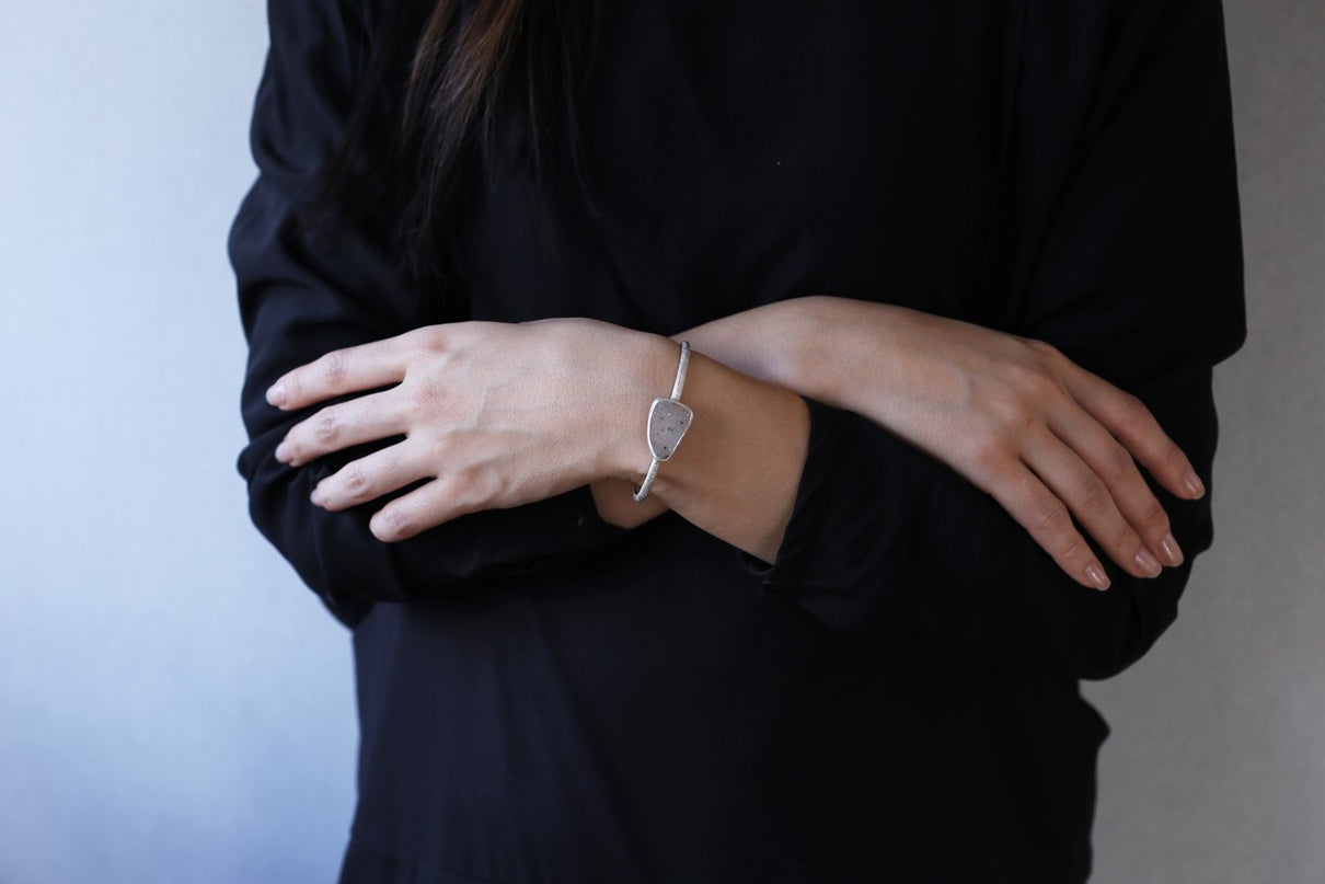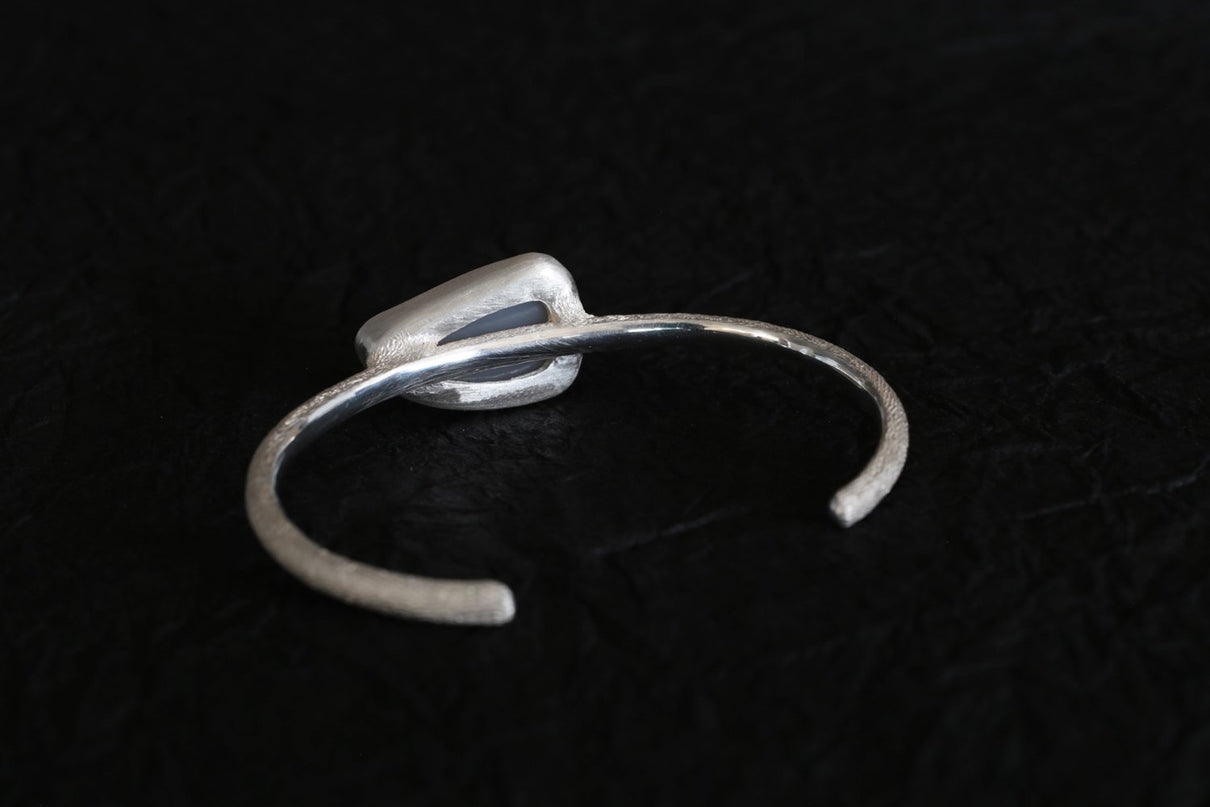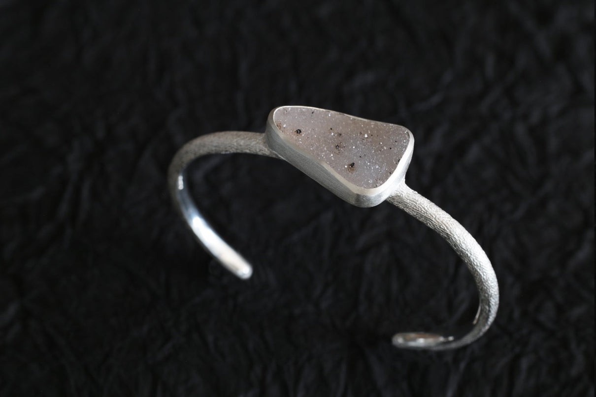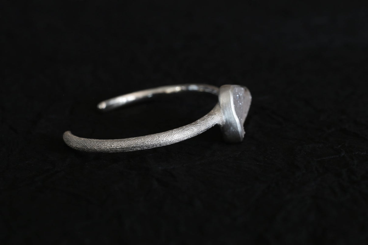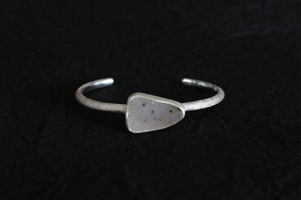 天然石のドゥルージークオーツを用いた1点もののバングル。乳白色の細かな結晶群が光を反射し、砂糖菓子のようにきらきらと美しく煌めきます。石の持つゆるやかなフォルムに合わせ、台座や腕部分を肌触りの良い不均一な表情をしたマットのテクスチャーで仕立てることによって、より物としての存在感・魅力を引き出すように仕立てました。石の台座になっている裏側のフォルムは抜いて軽やかに、また手首が触れる腕部分の内側は光沢仕上げにすることで着け心地にもこだわりました。日々の装いに加えるだけで、主役となってくれるアイテムです。