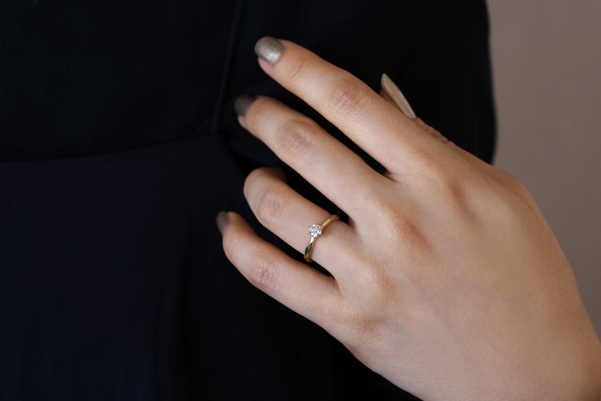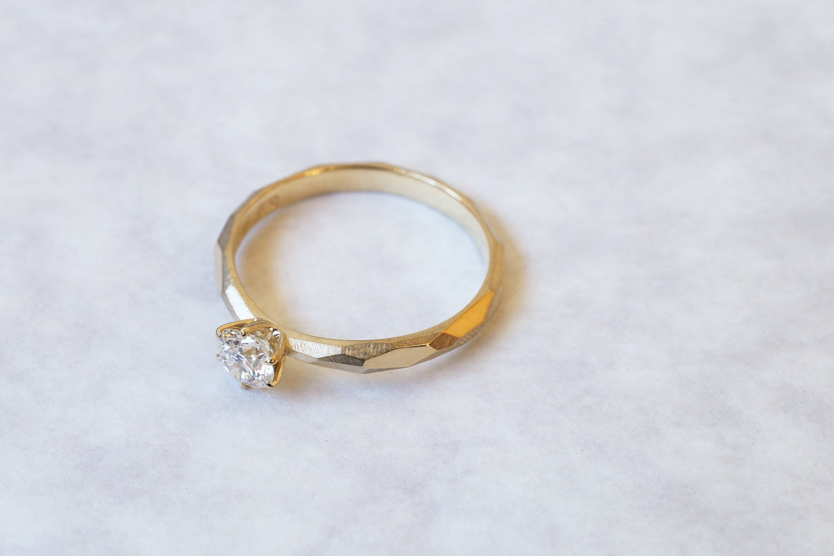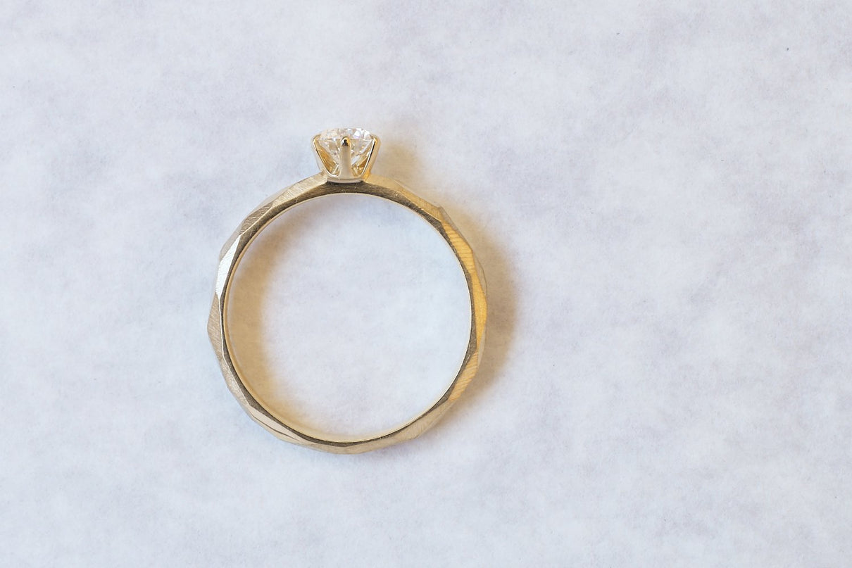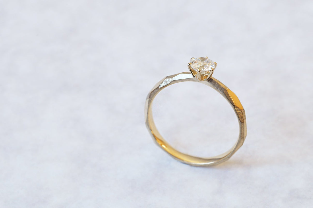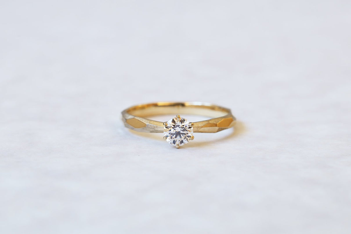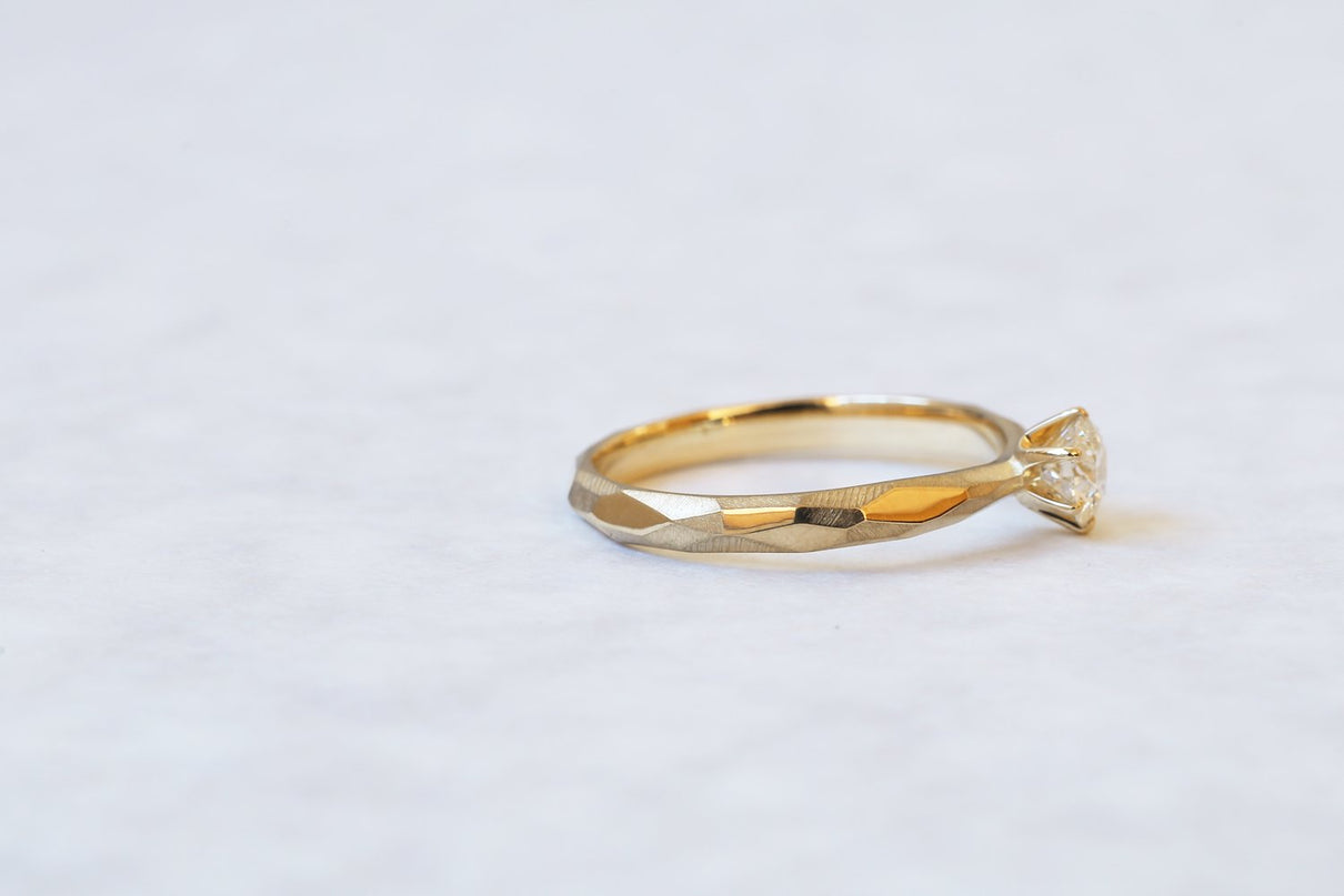 塊から荒く削り出されたようなフォルムの1点もののリング。手仕事の跡を感じることができるマット面をベースに、磨きあげられた鏡面がランダムに混ざり、見る角度によって表情が変わります。程よいボリューム感のゴールドリングに、輝きの強いダイヤモンドが美しく輝き、大切な方への贈り物としてもおすすめです。