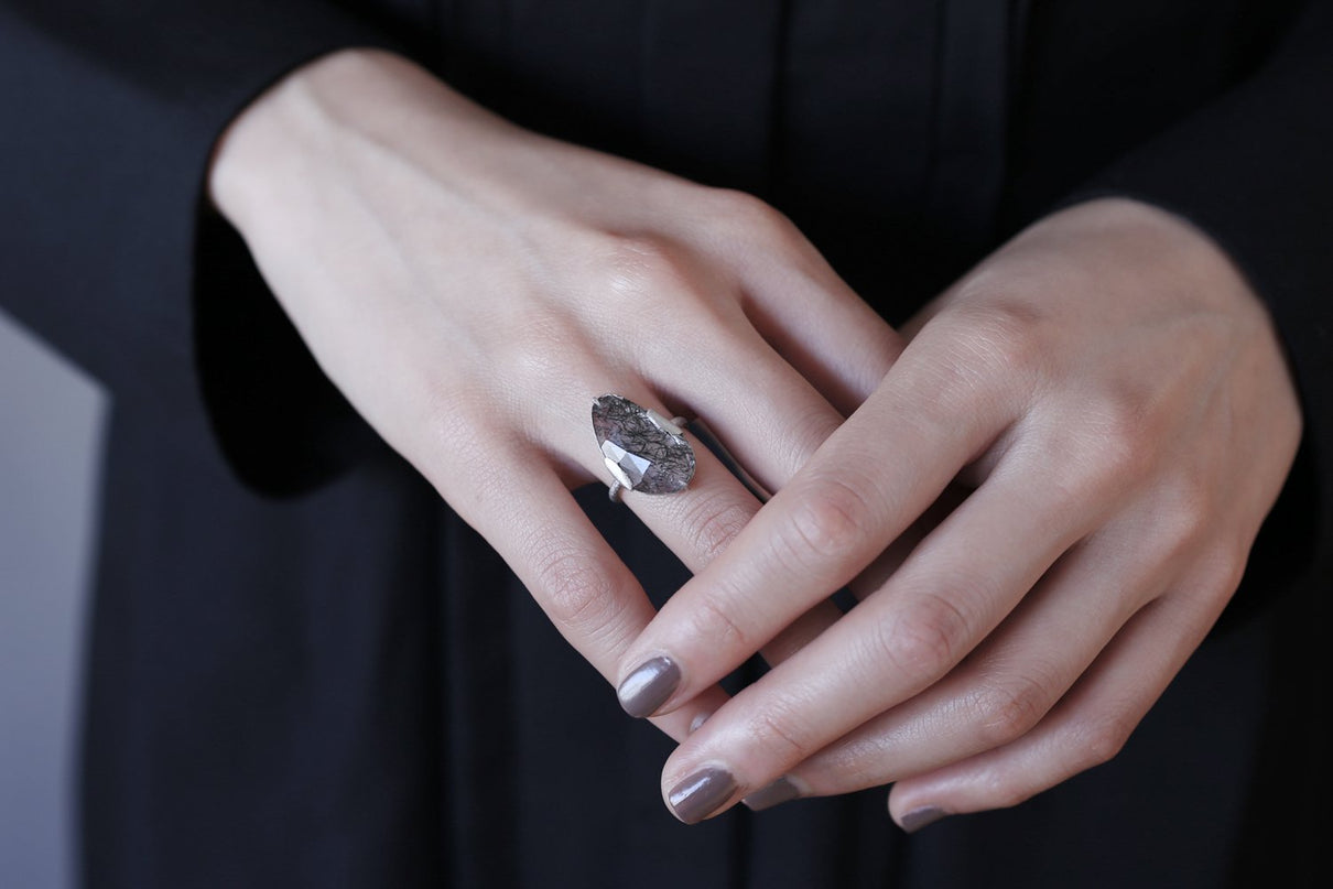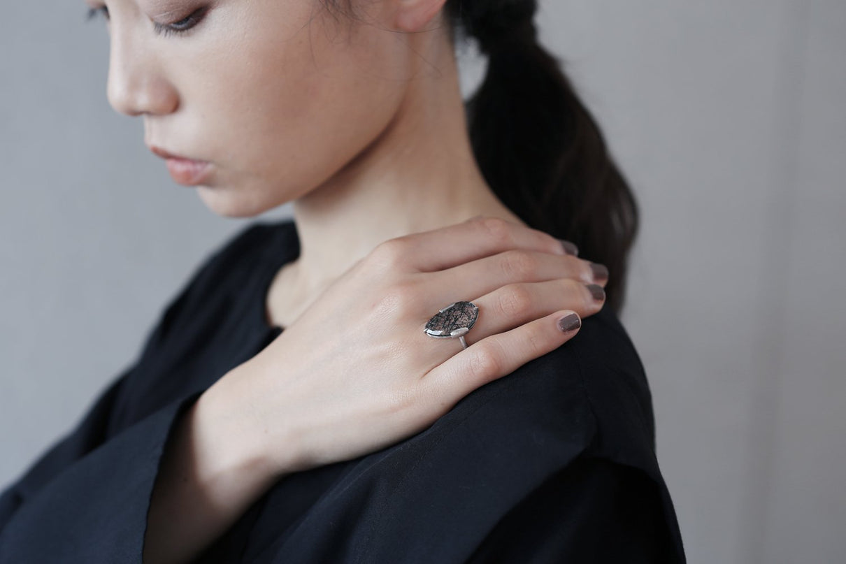 透明度の高い大ぶりのクォーツの中に針状のブラックルチルを内包する、神秘的な雰囲気を纏う1点もののアイテムです。リング部分はあえてプリミティブでゆらぎのある表情に仕上げ、個性的な石の魅力を最大限に引き出すために、上下と左右で異なる爪の留め方をしています。落ち着いた色合いのプラチナに神秘的な雰囲気のブラックルチルクォーツが映え、お守りのように身につけることができるアイテムです。