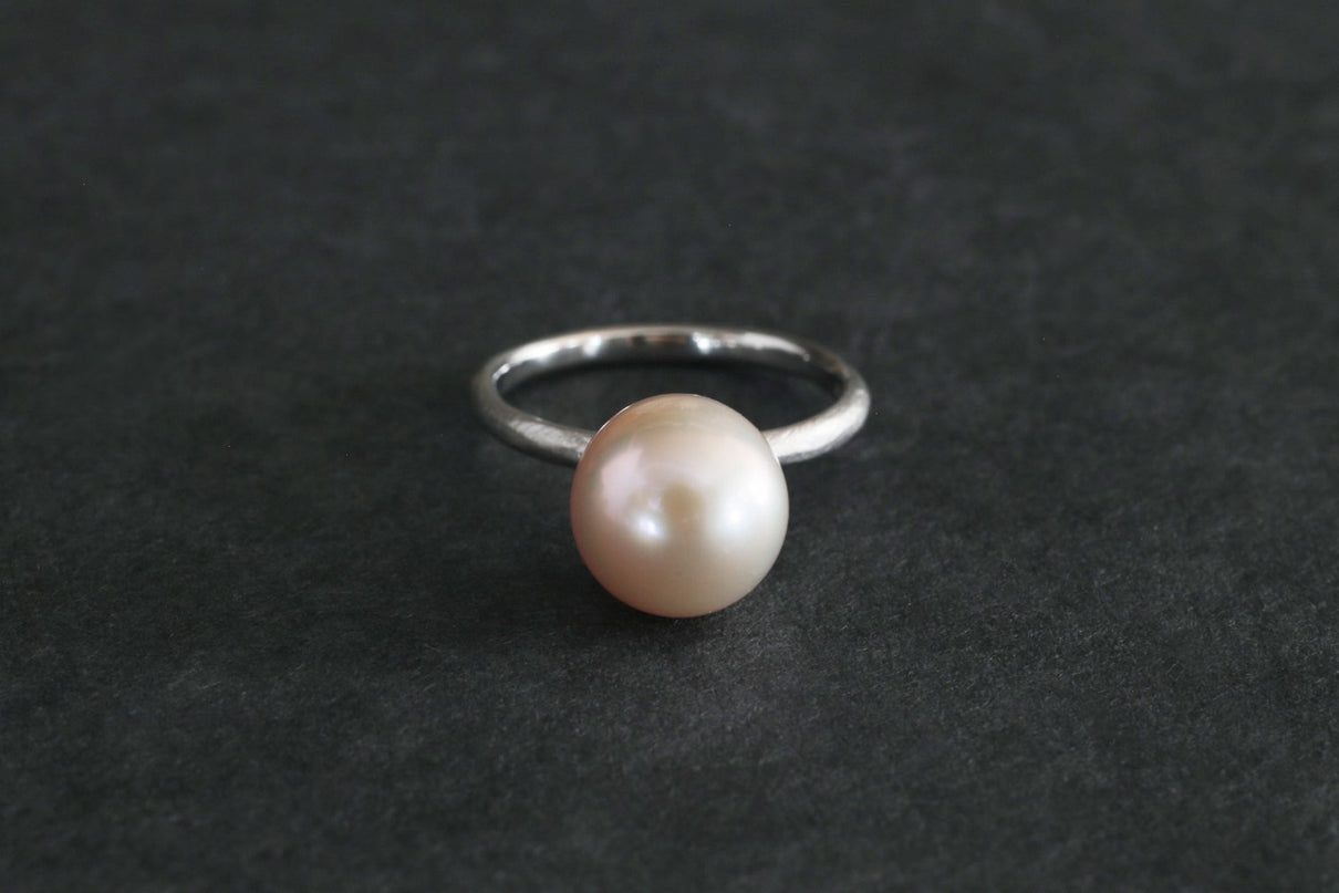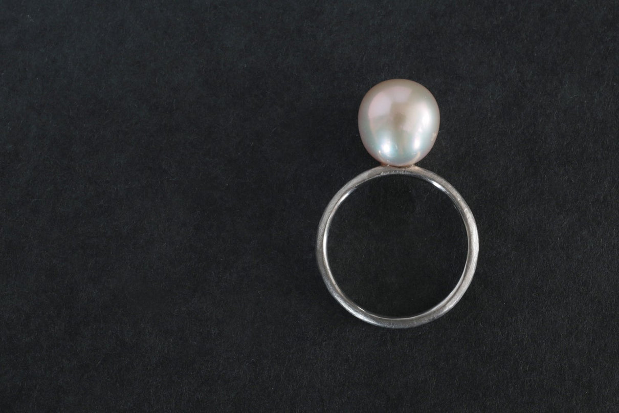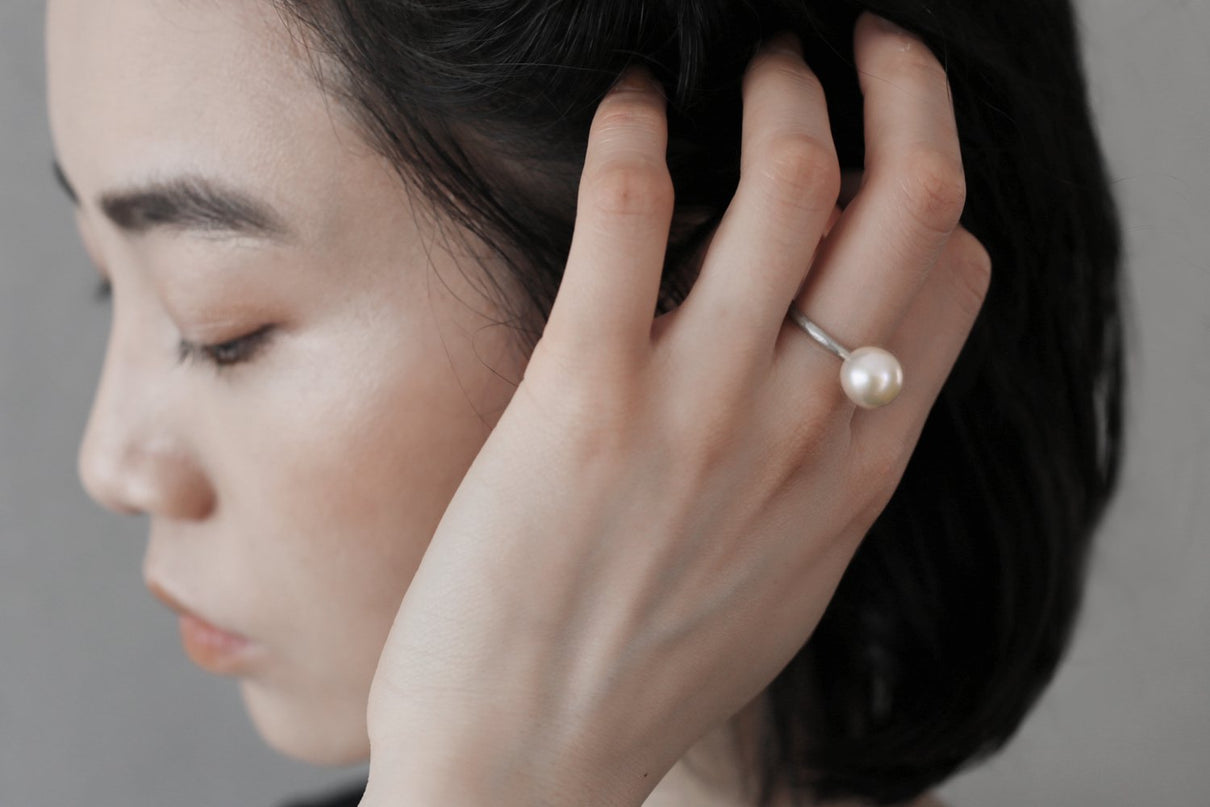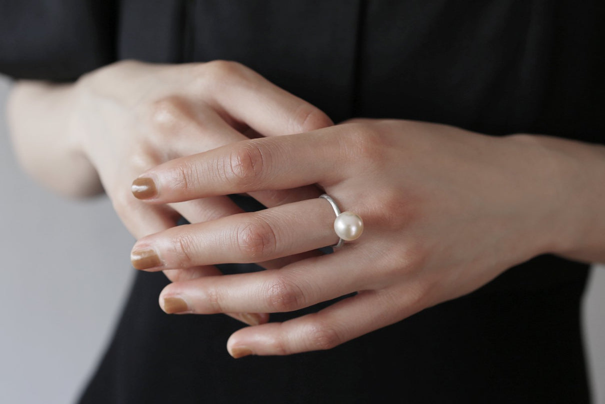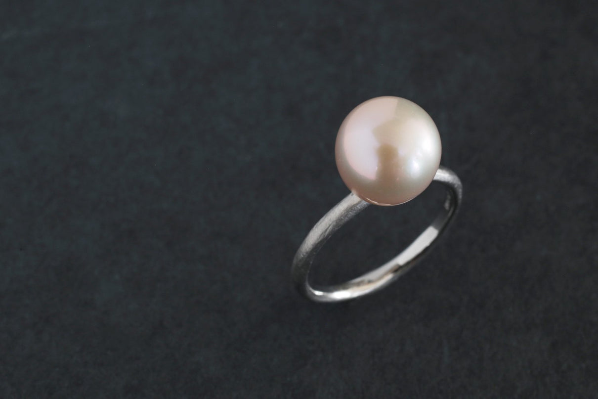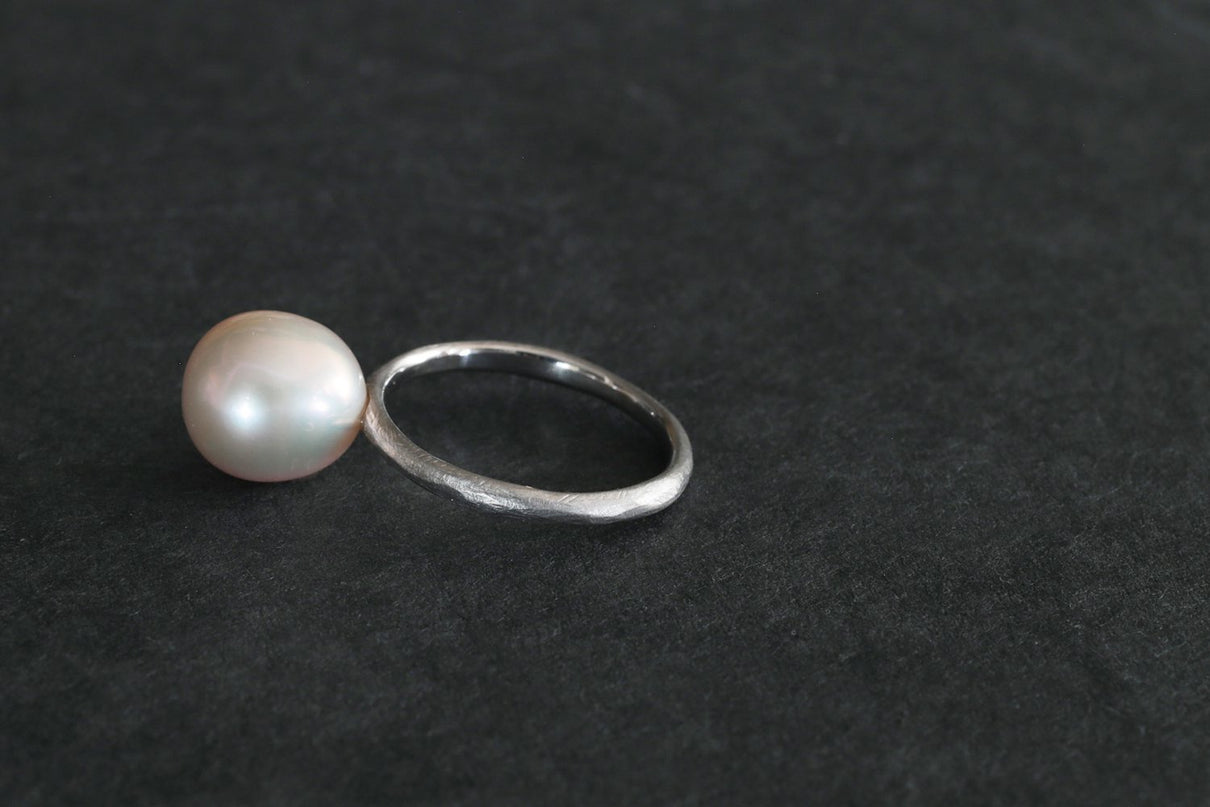 柔らかな卵型をした、照りが美しいニュアンスカラーパールのシンプルなリング。プラチナのリング腕部分は、厚みや幅にわずかな揺らぎを持たせ、あえて手仕事の痕跡を残したテクスチャーで柔らかな質感に仕上げました。上質な淡水パールならではの淡い曇り空のような色は、まさに海が作り出した自然の産物です。1点ものならではのその個性をお楽しみください。