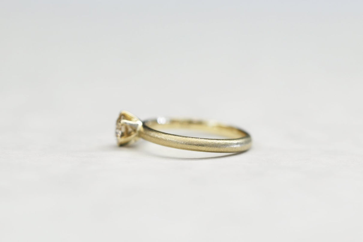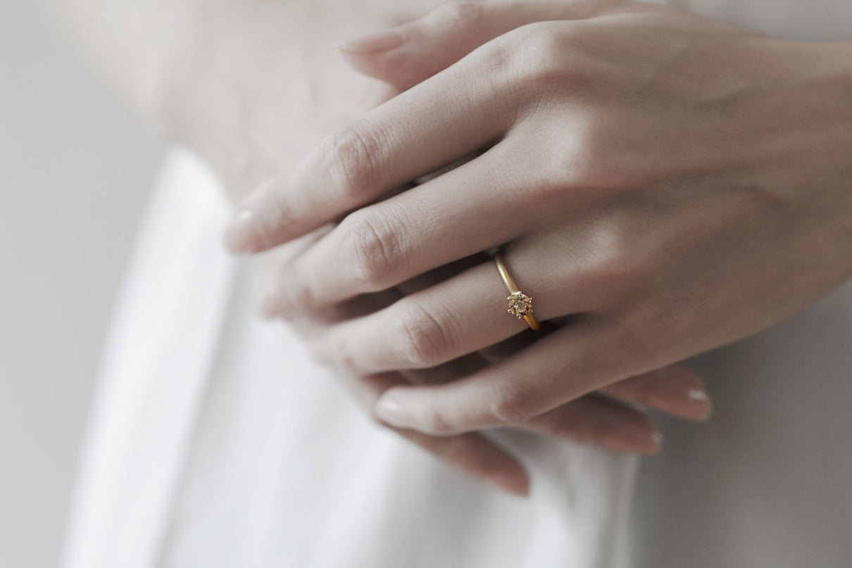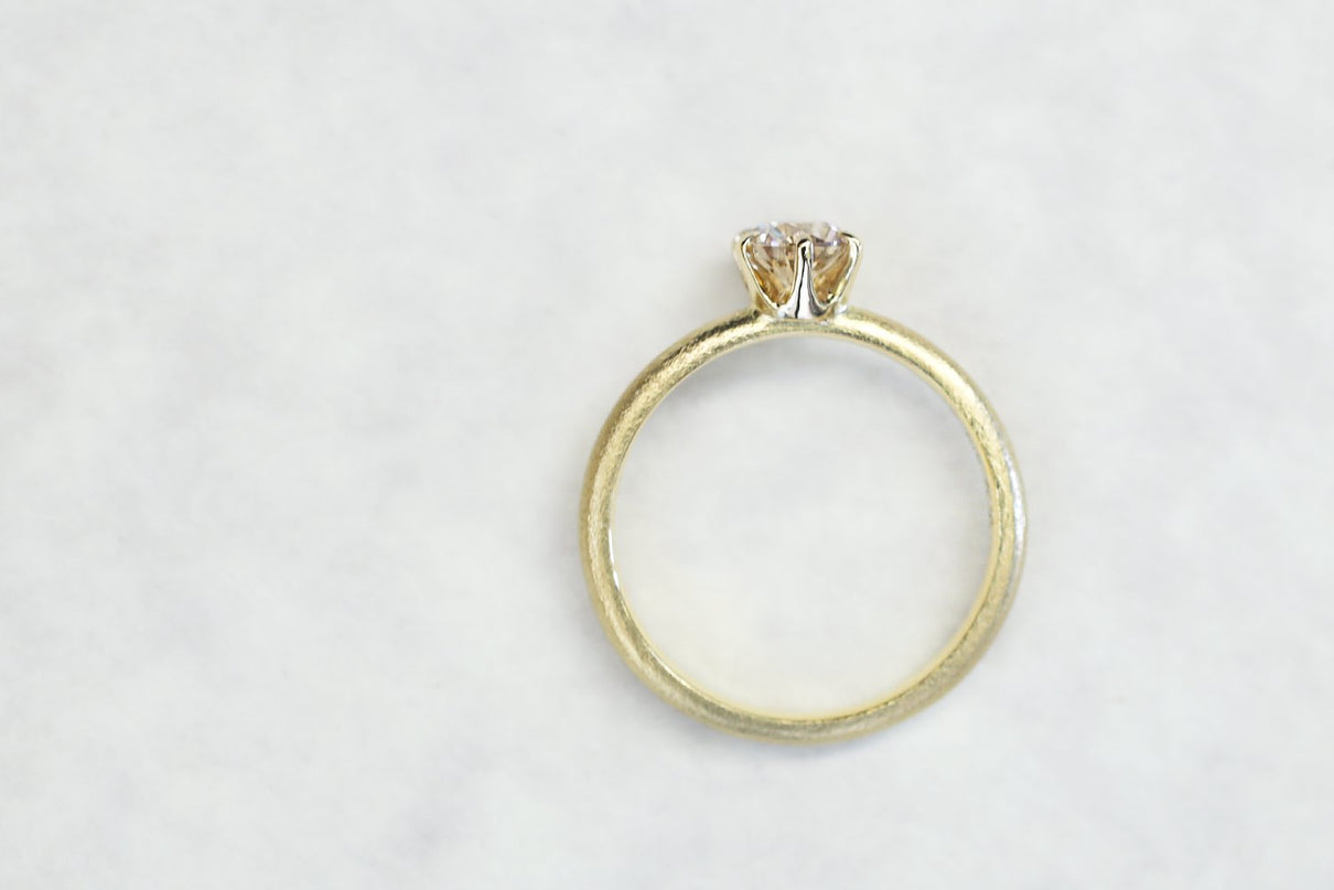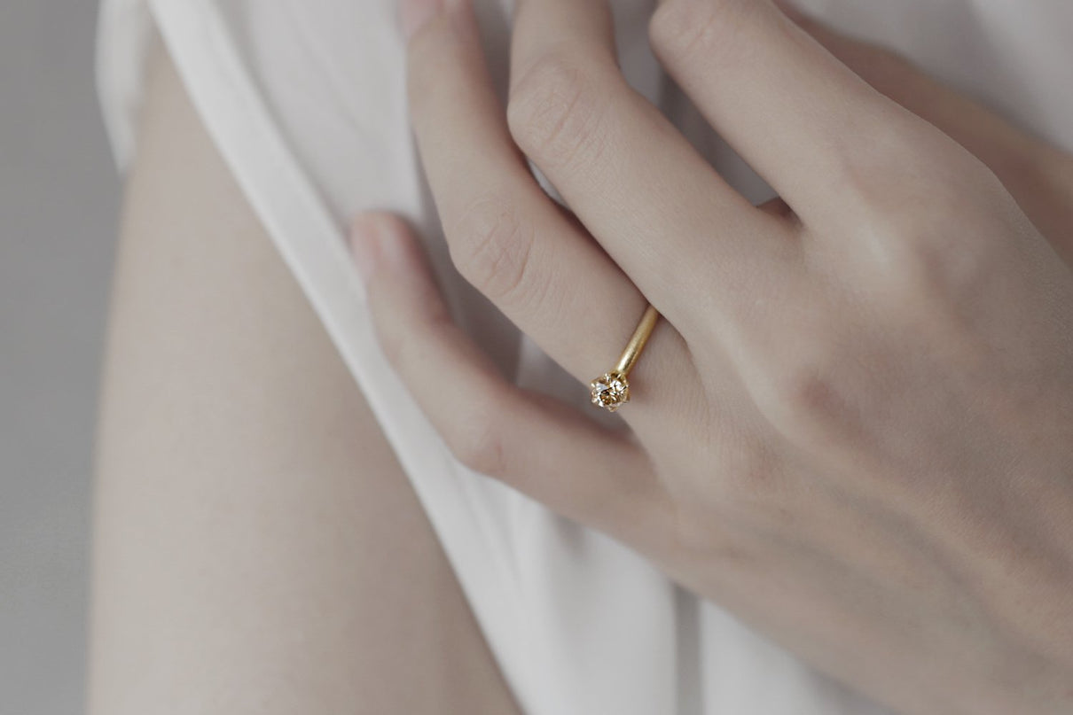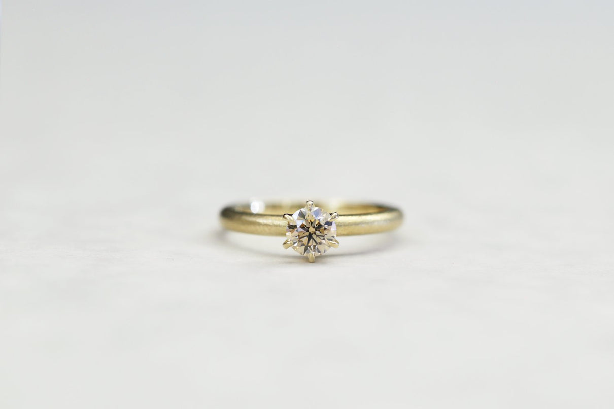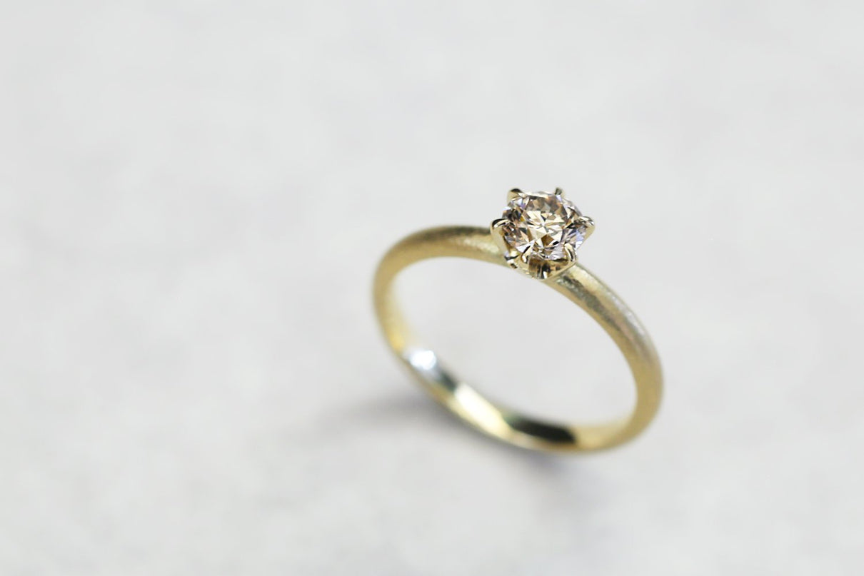 約0.40ctのライトブラウンダイヤモンドを6本爪留めでセッティングしたシンプルなダイヤモンドリング。ブリリアントカットの煌めきと、砂粒のような質感のコントラストが映えるリングです。無駄を削ぎ落としたシンプルなフォルムは普遍的な美しさでダイヤモンドを際立たせます。ライトブラウンダイヤモンドとリング部分のイエローゴールドのカラーは相性も良く、華やかな印象ながらも落ち着きある印象で日常使いにもお勧め。良質なダイヤモンドならではの輝きは、エンゲージリングや記念日の特別な贈り物としても喜ばれるの1点もののアイテムです。