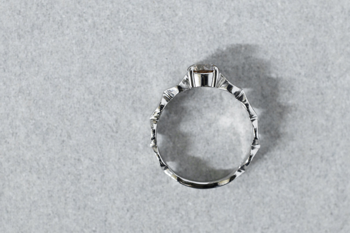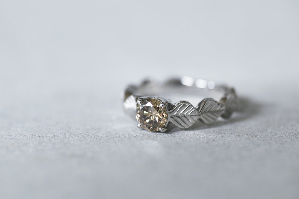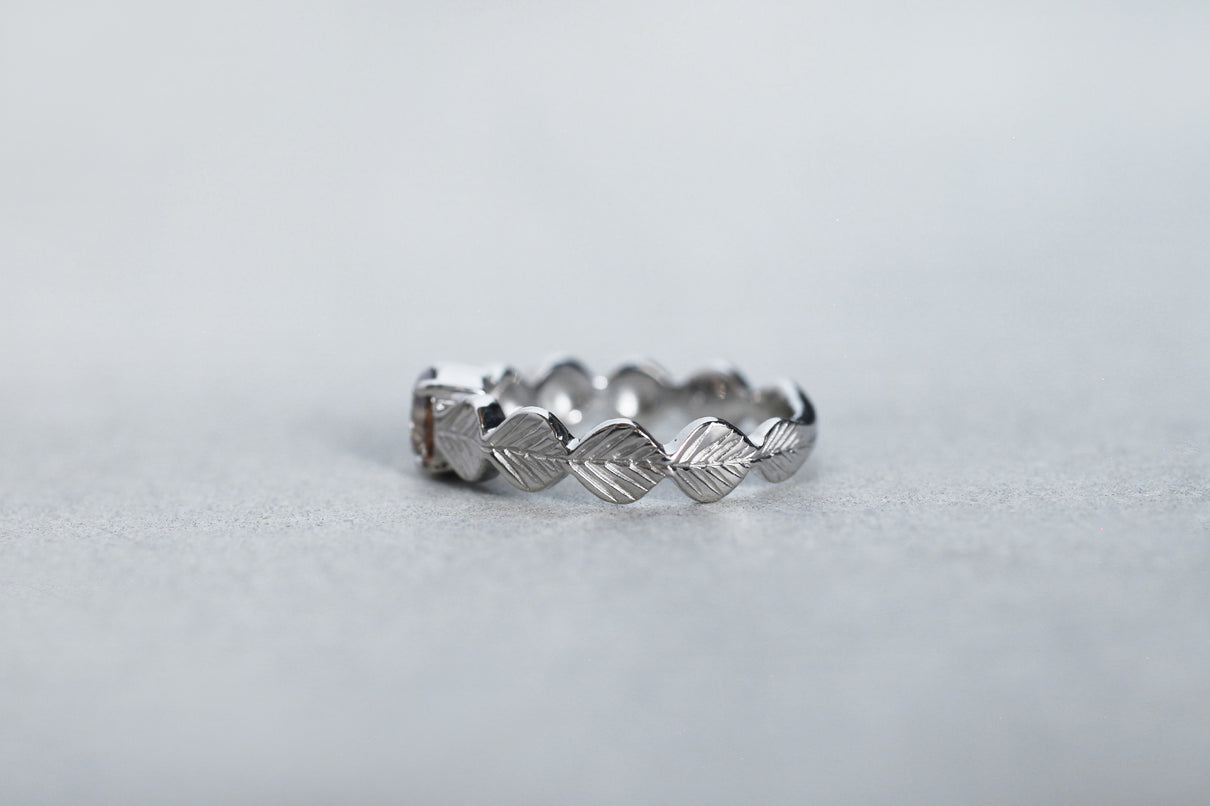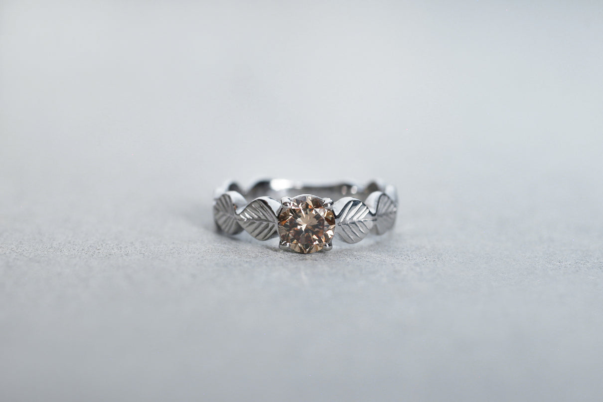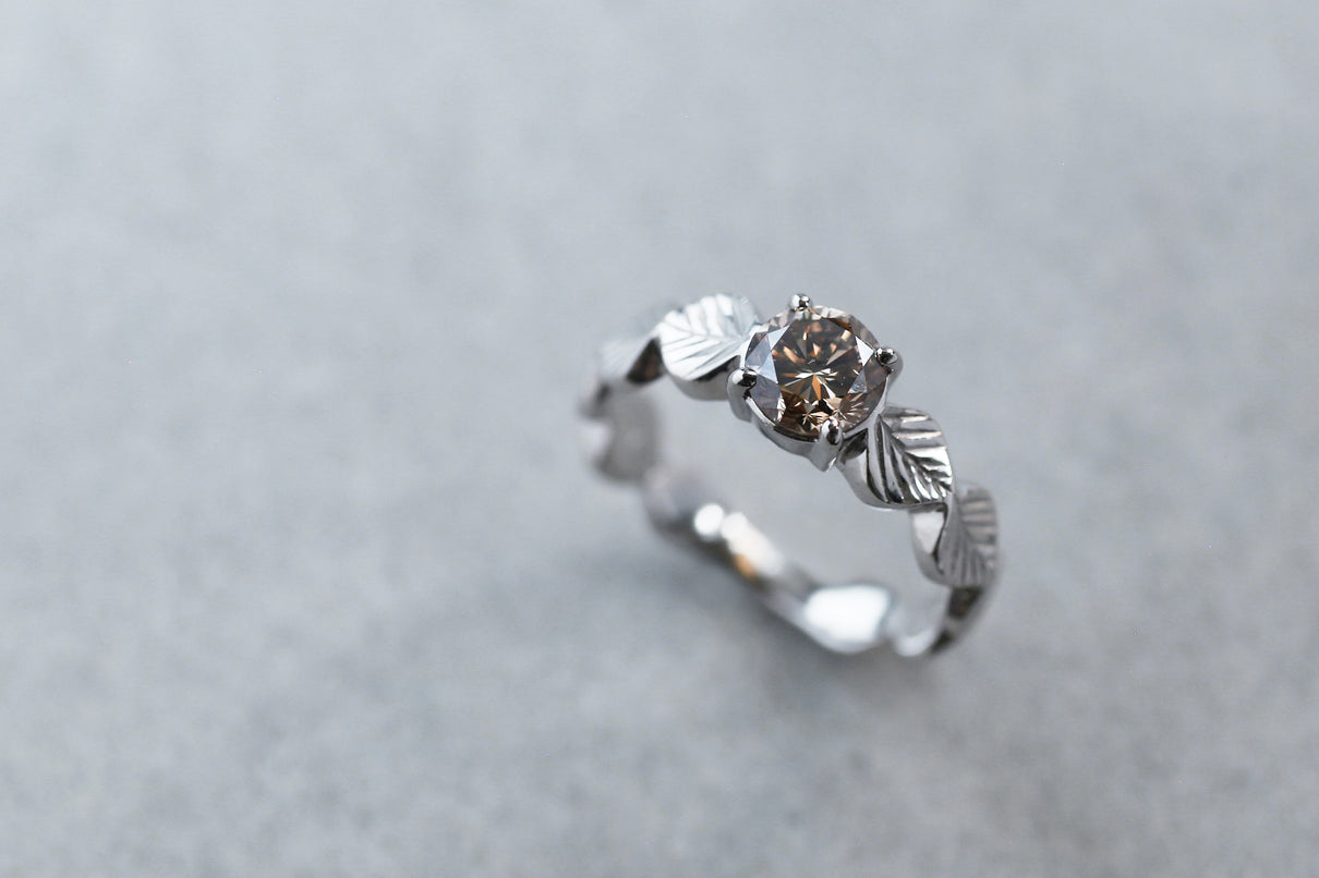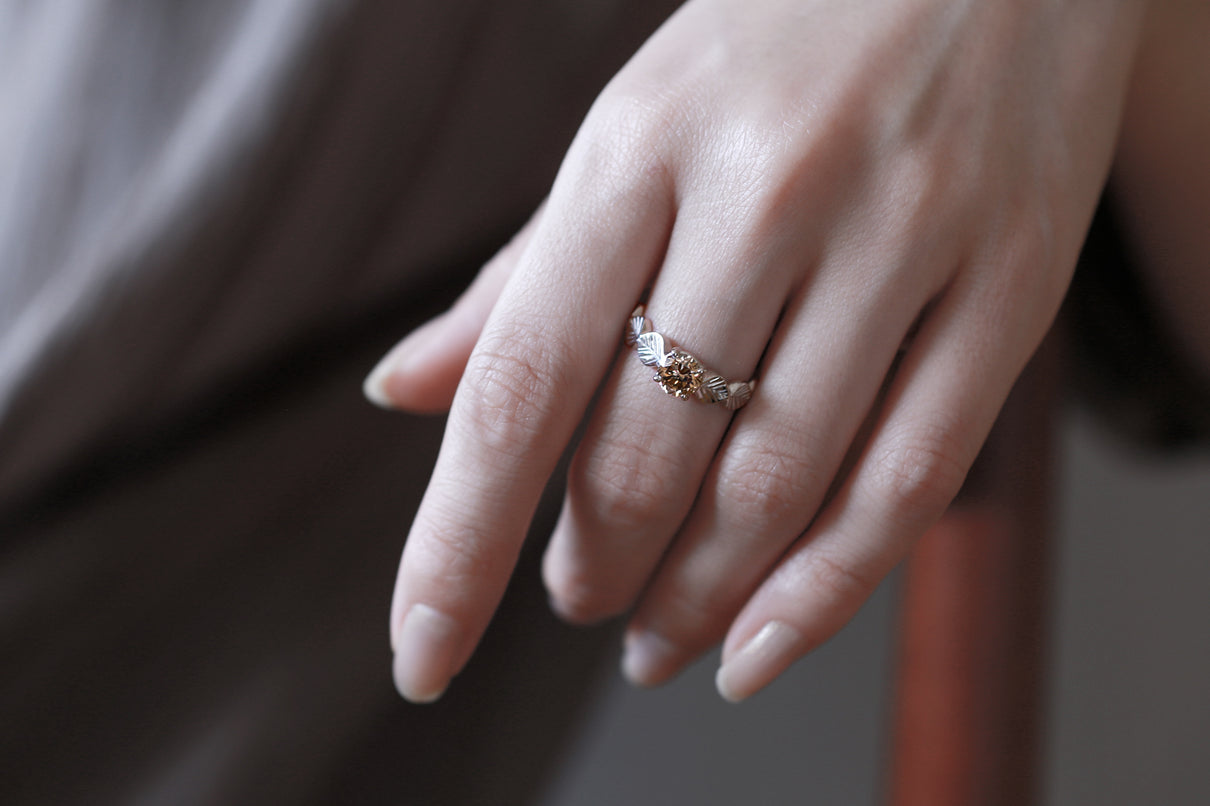 いくつも連なる葉っぱをモチーフに、1枚1枚わずかに異なる表情に遊び心を込めた"Leaf"シリーズの1点もののリング。上質なブリリアントカットダイヤモンドが、華やかな輝きでリッチな存在感を放ちます。肌馴染みの良いライトブラウンカラーは、華美になりすぎず、存在感がありながらもシックで落ち着いた印象で身に着けられます。1本で装いの主役となり、特別な贈りものにも最適なアイテムです。