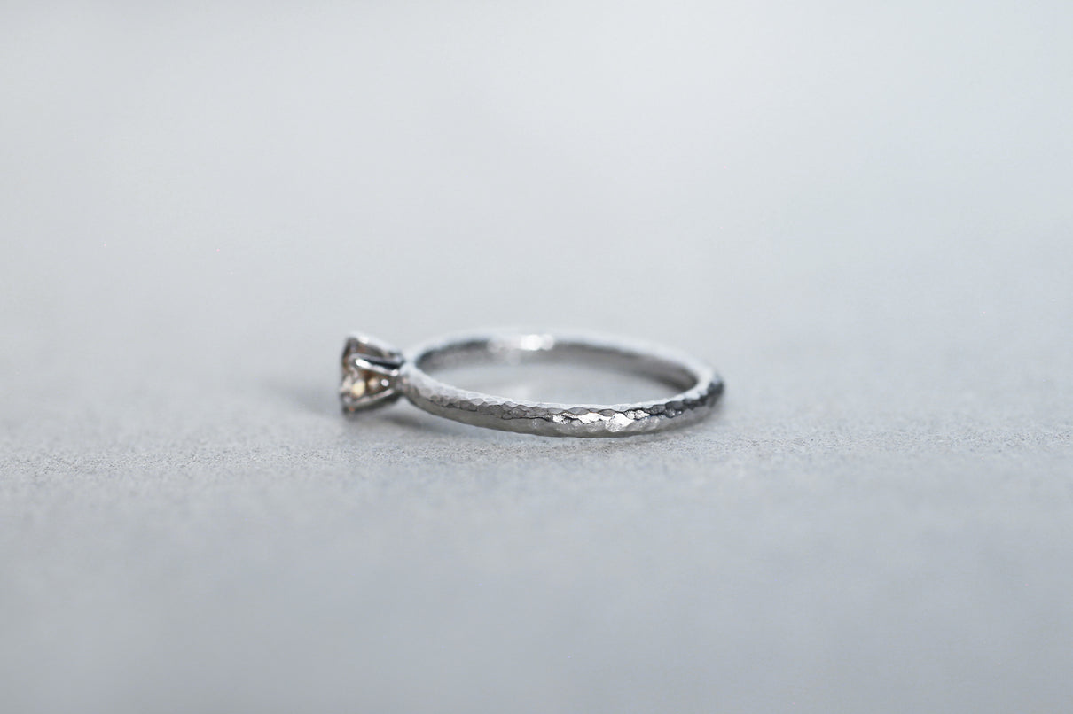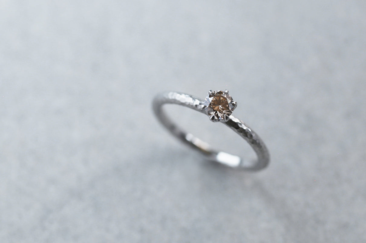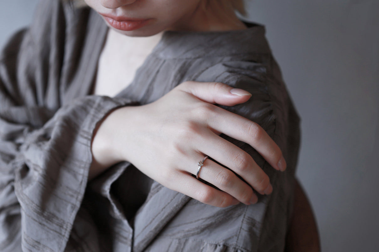 小枝のようなテクスチャーを施した"Twig"シリーズに、上質なライトブラウンダイヤモンドを留めた1点もののリング。ライトブラウンカラーが肌馴染み良く、ダイヤモンドの程よいサイズ感がデイリーにもフォーマルシーンにも身に着けやすいアイテムです。