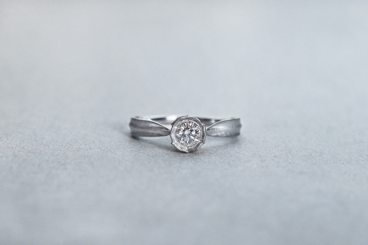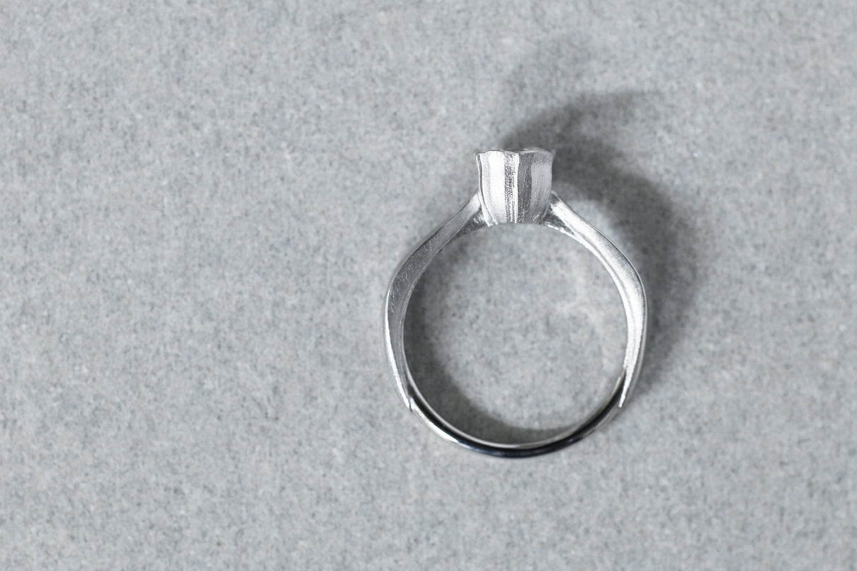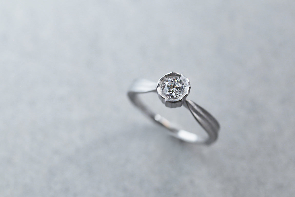 "思いやり"という花言葉を持つチューリップをモチーフとし、つつましく飾らない一輪の花の中央に上質なダイヤモンドを留めた1点もののリング。緻密に表現された花びら1枚1枚が、澄んだ輝きを放つダイヤモンドを優しく包み込み、リング部分にはやわらかな葉をあしらいました。可憐で凛とした印象で、特別な贈り物にも最適なアイテムです。