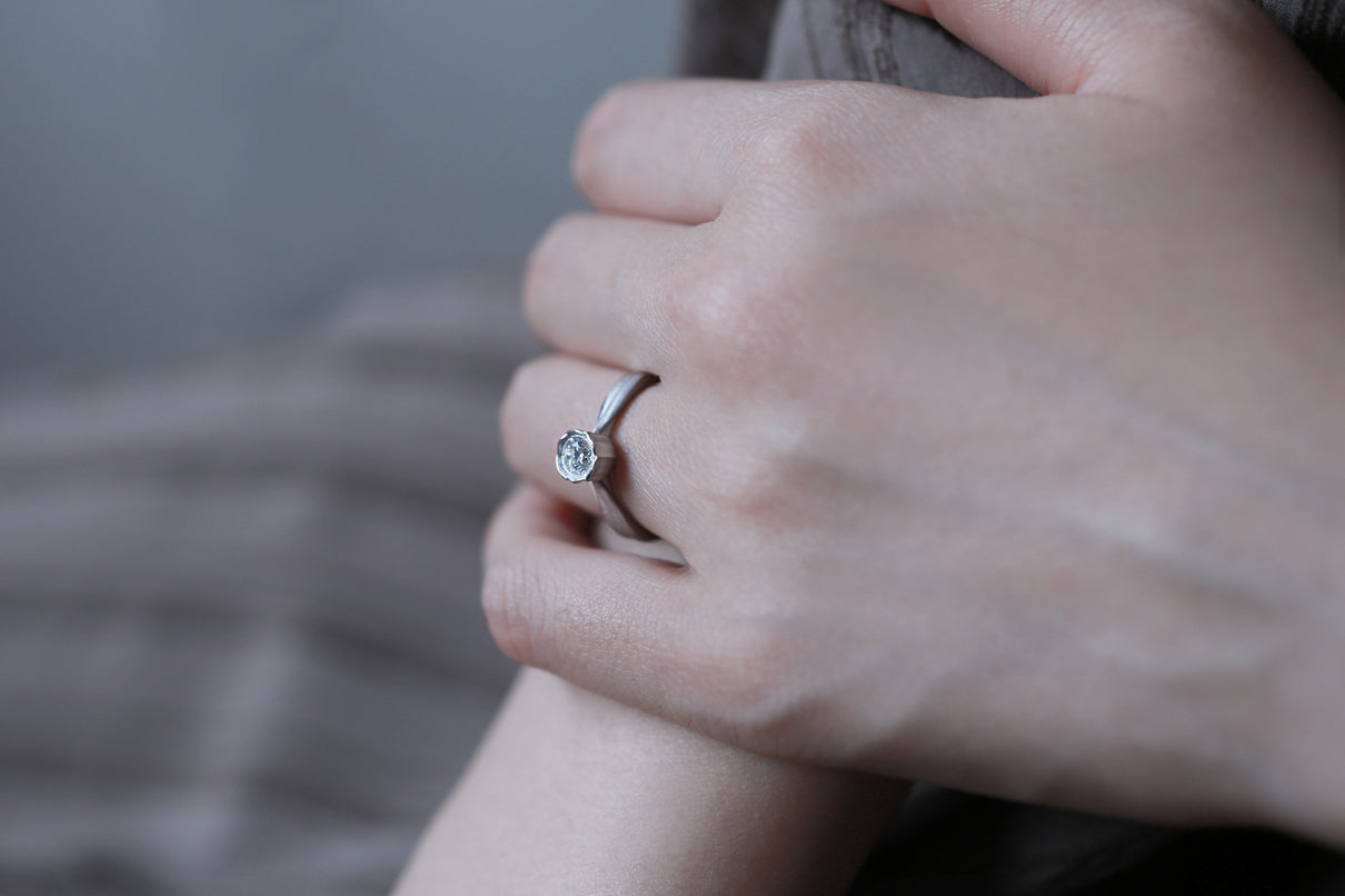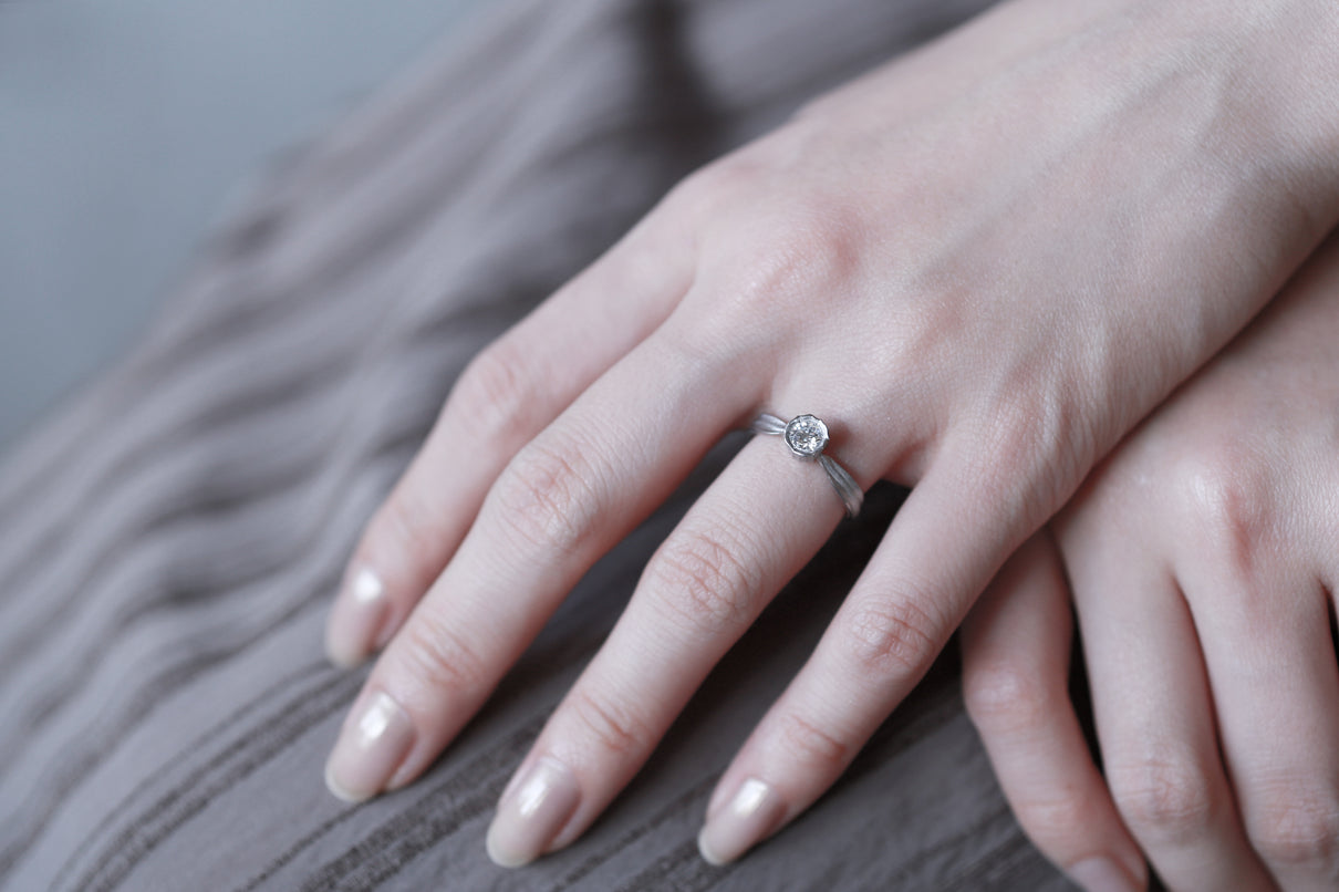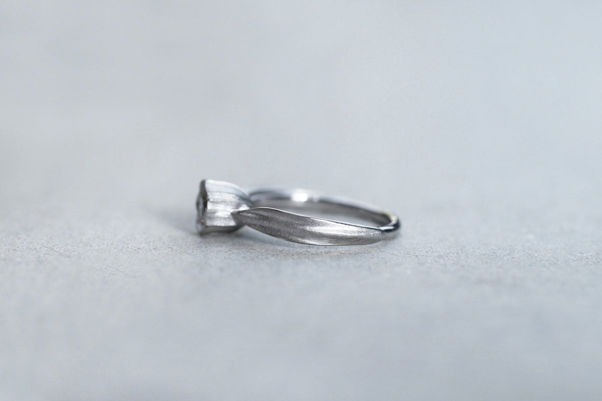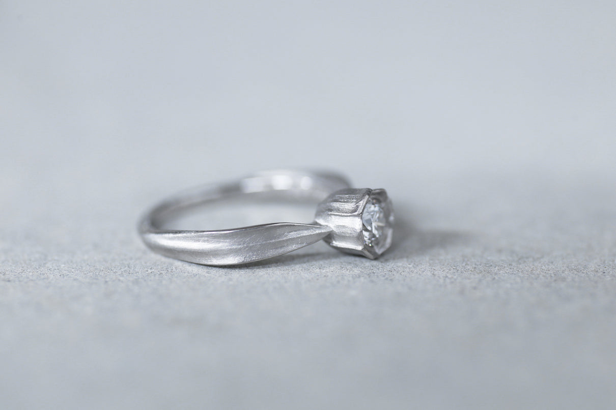 "思いやり"という花言葉を持つチューリップをモチーフとし、つつましく飾らない一輪の花の中央に上質なダイヤモンドを留めた1点もののリング。緻密に表現された花びら1枚1枚が、澄んだ輝きを放つダイヤモンドを優しく包み込み、リング部分にはやわらかな葉をあしらいました。可憐で凛とした印象で、特別な贈り物にも最適なアイテムです。