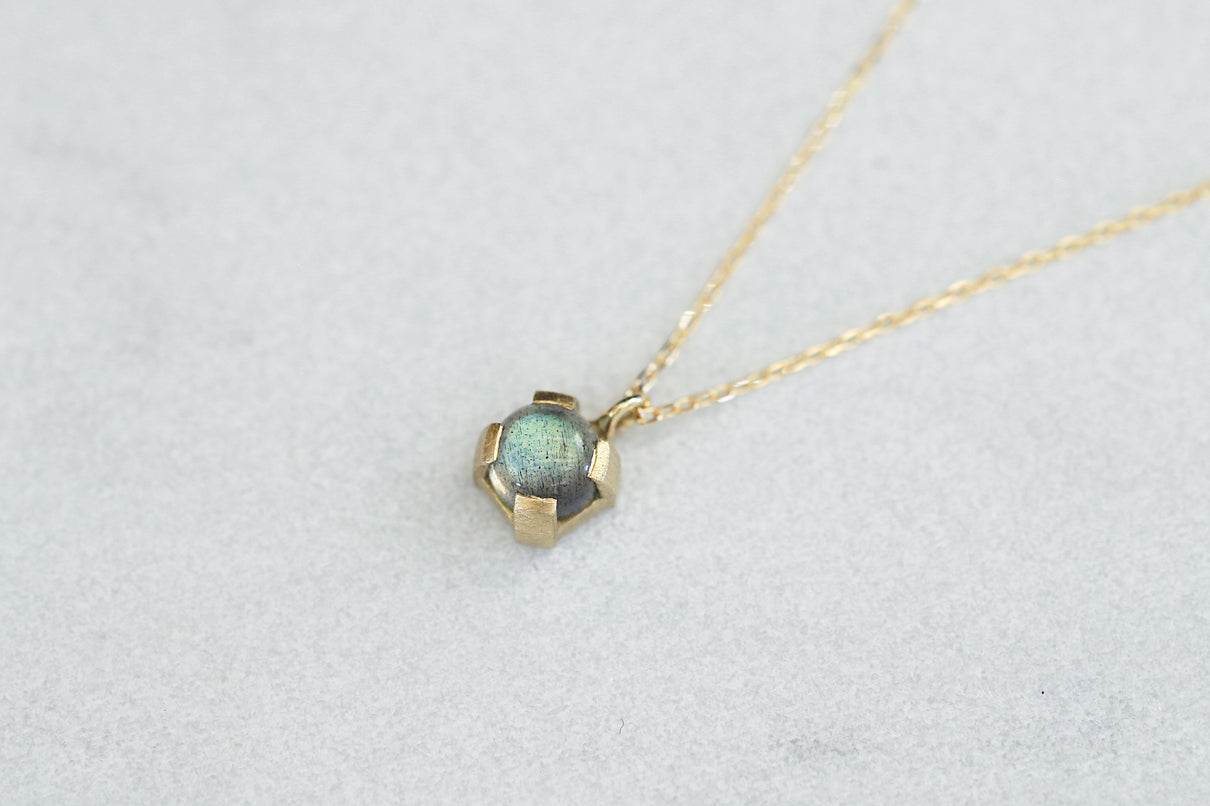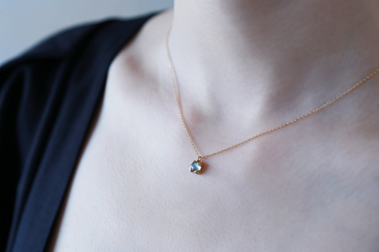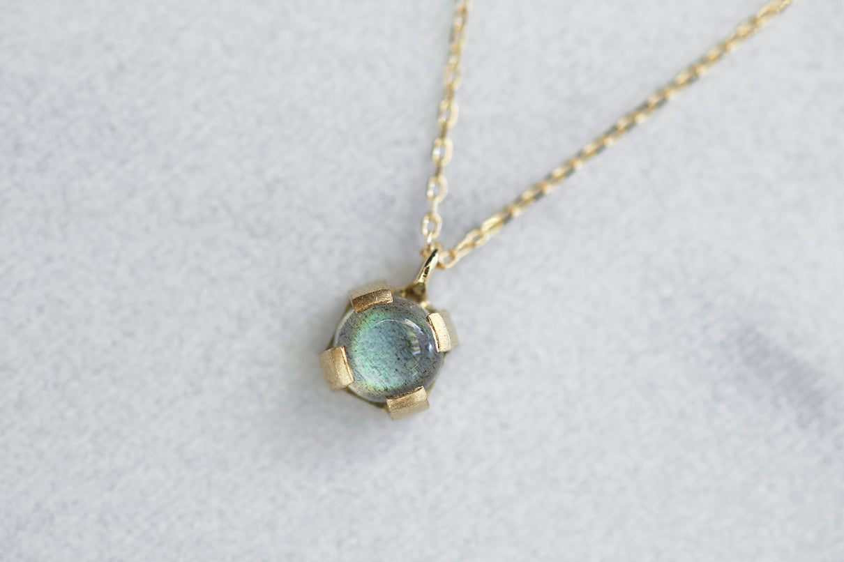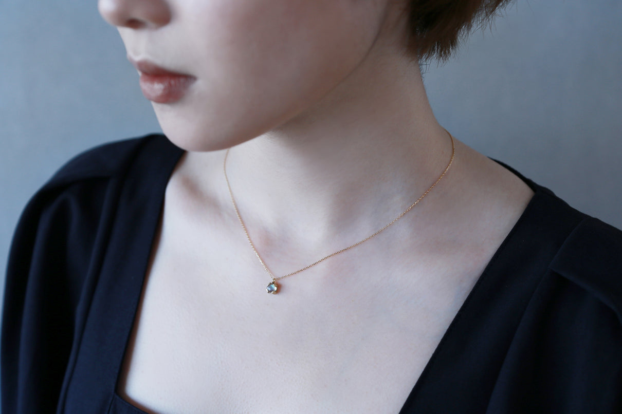 ブルーラブラドライトを用いた1点もののネックレス。角度を変えるたび、ブルーを基調としたオーロラのような複雑な色を放ちつつ、幻想的に彩りながら輝く様は、ずっと眺めていたくなるような美しさです。この特徴的な虹色は、「ラブラドレッセンス」と呼ばれる、ラブラドライト特有の光の干渉によるものです。石を受け止める、プレーンなマットテクスチャーを施した平らなK18ゴールドの爪部分は、小ぶりなカボションカットをシンプルかつ個性が引き立つようなフォルムで仕上げることで、スタイリッシュでシックな印象に。日常的に身に着けやすいサイズ感で、さりげない華やぎを添えるアイテムです。